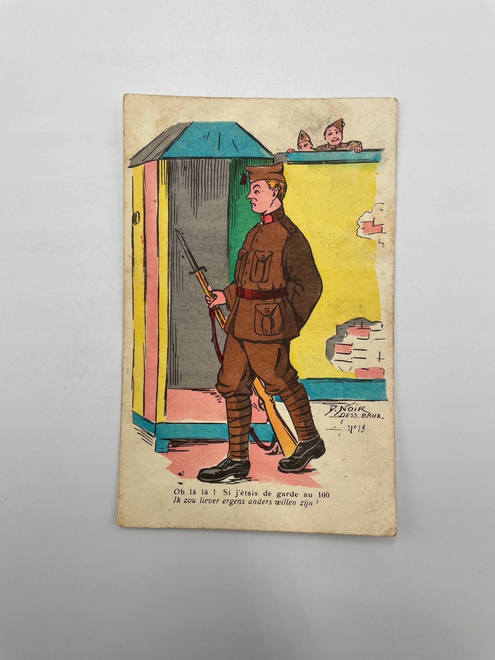 Oryginalna kolorowana pocztówka z 1936 roku przedstawiająca humorystyczną scenę wojskową z żołnierzem na warcie i napisem: „Oh là là! Si j’étais de garde au 100” (Wolałbym być gdzie indziej).