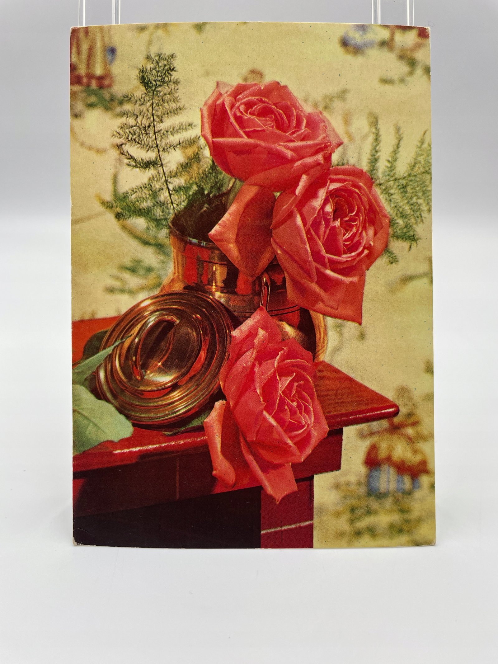 Pocztówka Belgia 1960 róże w miedzianym wazonie De Zon in de Nacht