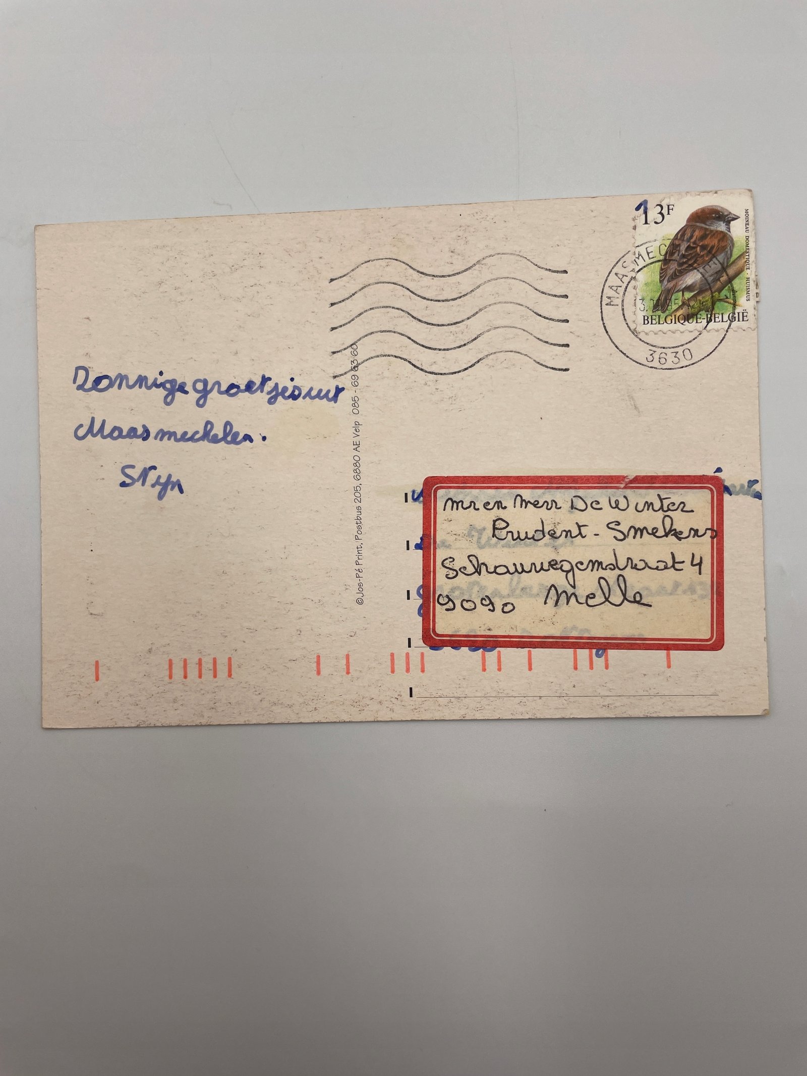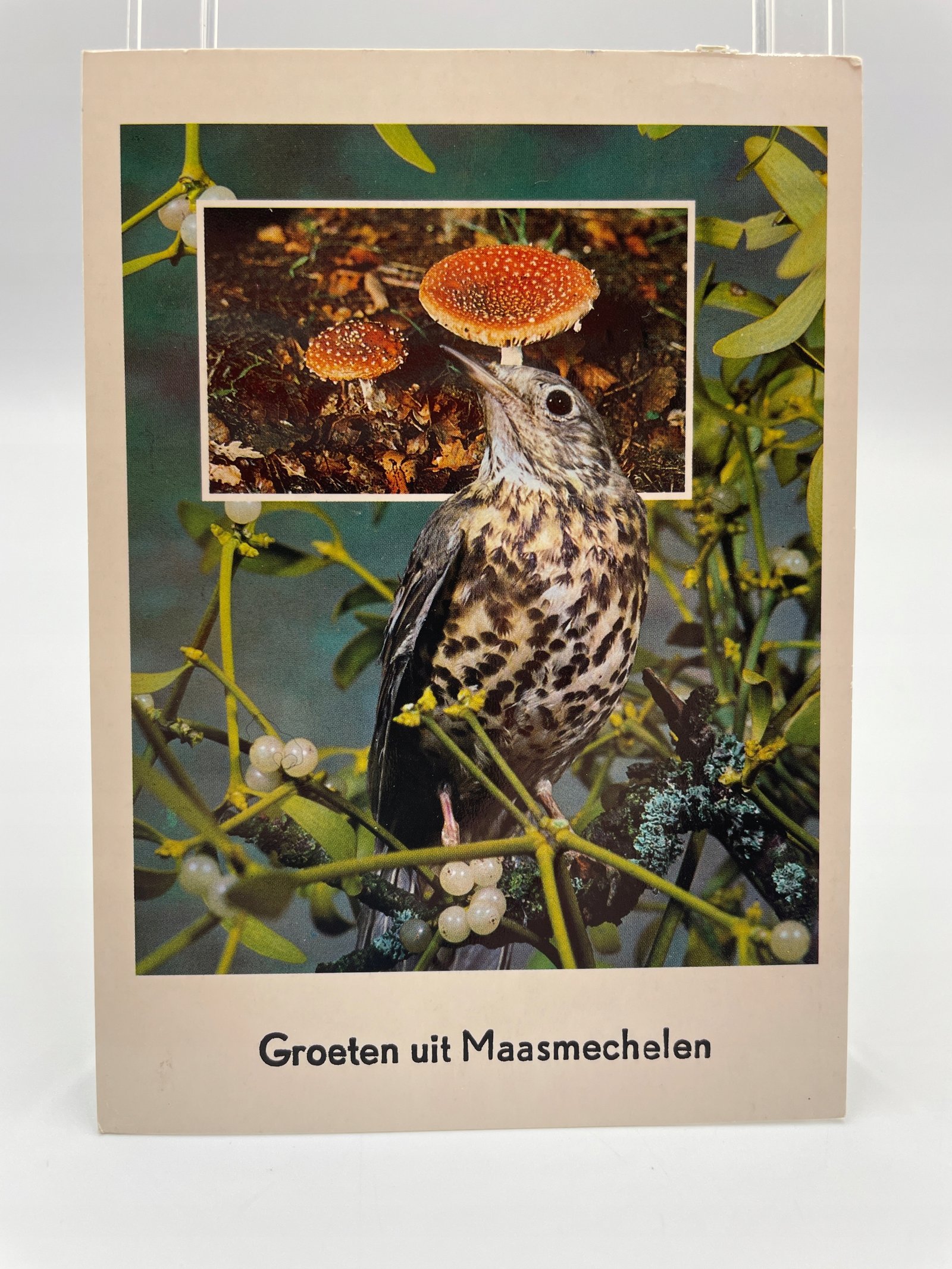 Pocztówka Belgia 1986 ptak na jemiole i muchomory Maasmechelen