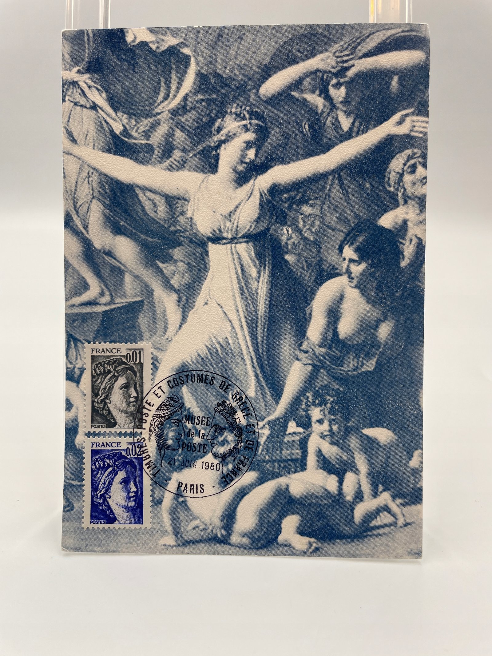 Pocztówka Francja 1980 Paryż scena z obrazu Davida Luwr