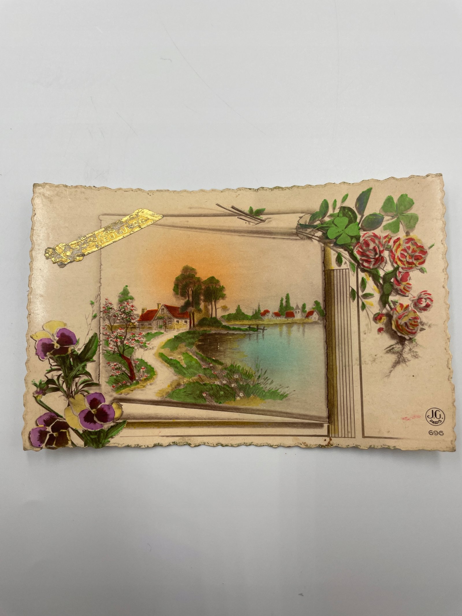 Pocztówka Francja lata 30. wieś nad jeziorem kwiaty życzenia JG 696