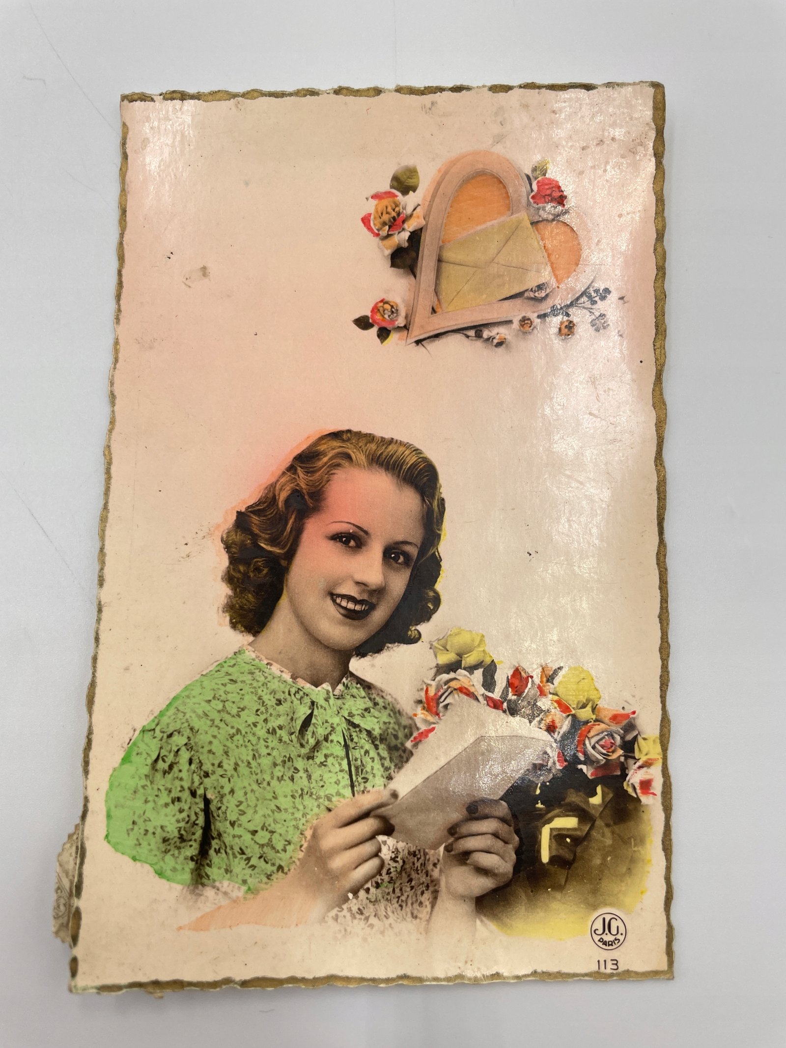 Pocztówka Francja ok. 1930 dziewczyna z listem kwiaty JG 113