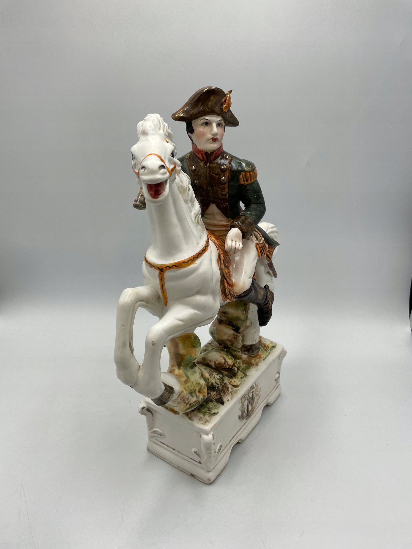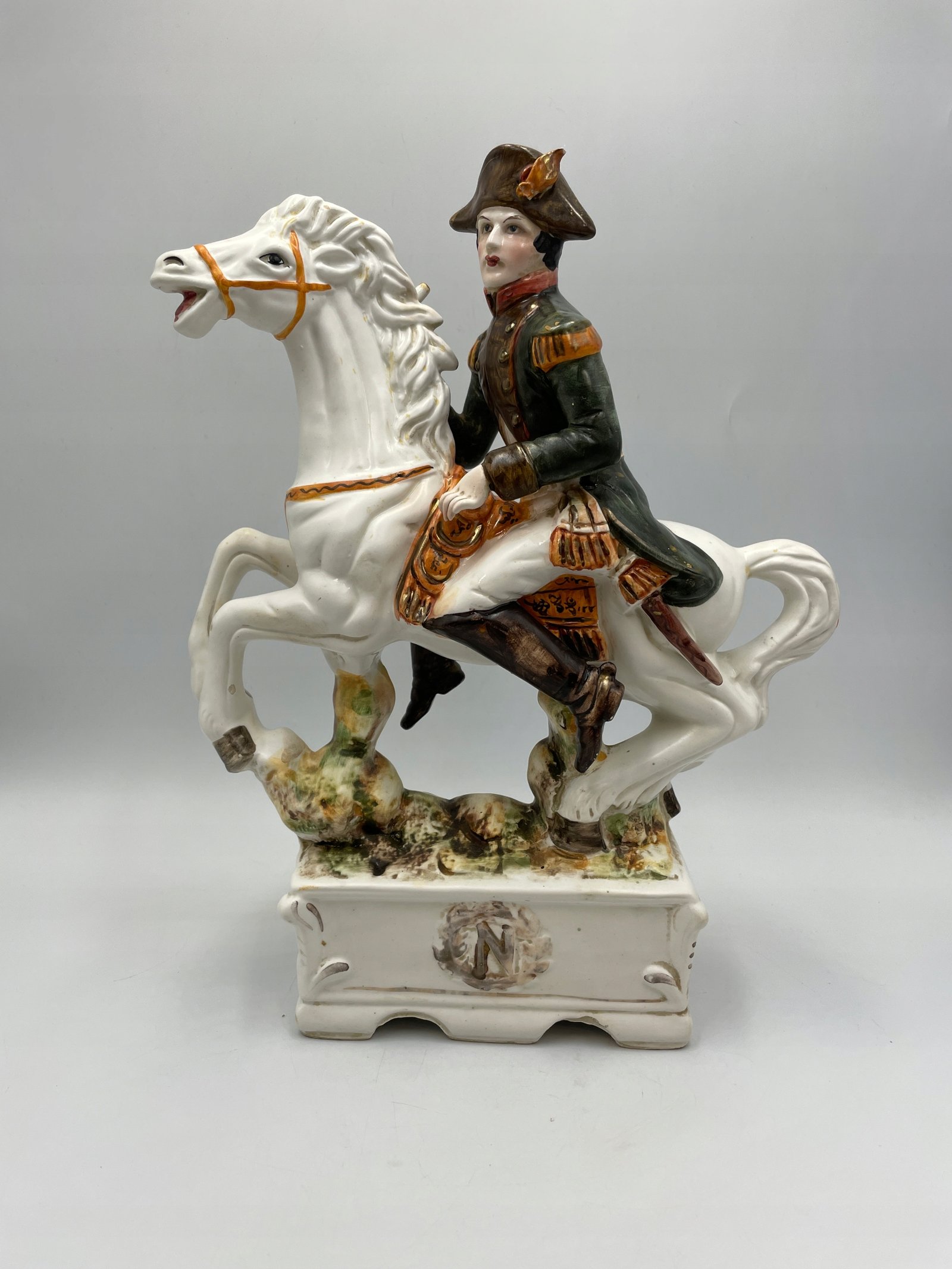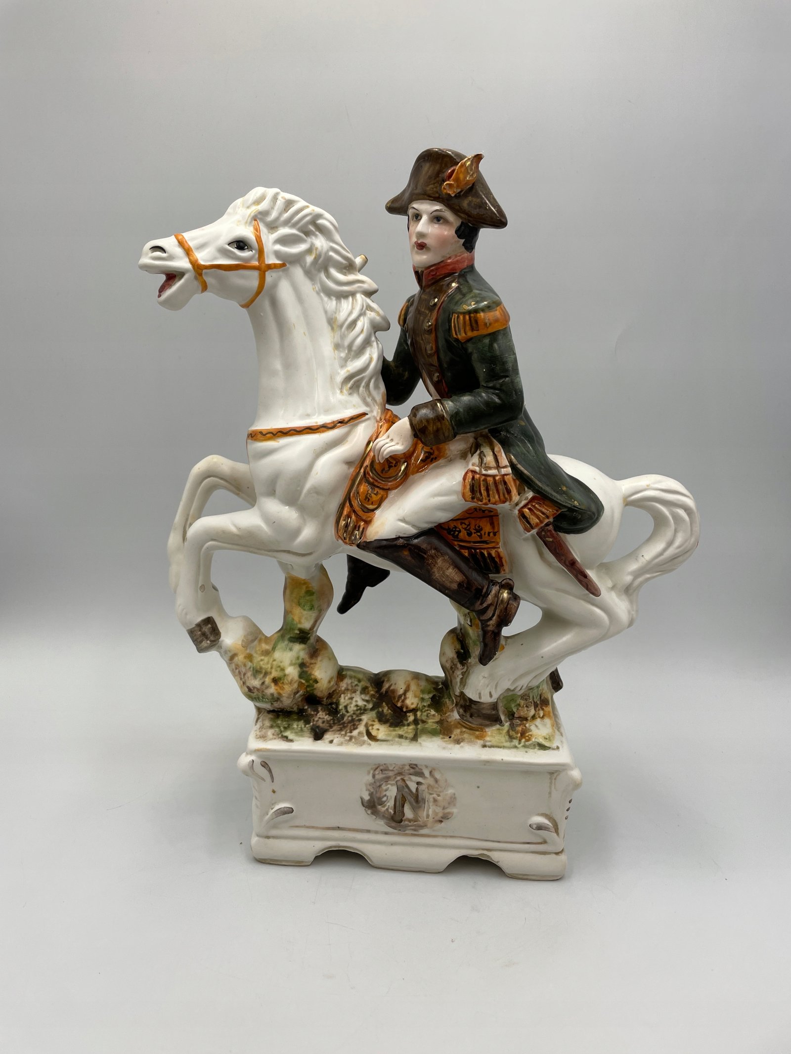 Design i dekor: Porcelanowa figurka przedstawia Napoleona Bonaparte, siedzącego na białym koniu w efektownej pozie. Szczegółowe malowanie odzwierciedla historyczny mundur wojskowy z zieloną kurtką, złotymi elementami i czerwonym szalikiem. Podstawa jest ozdobiona reliefową literą „N”, symbolizującą Napoleona, a ogólny styl podkreśla historyczne znaczenie tej postaci.