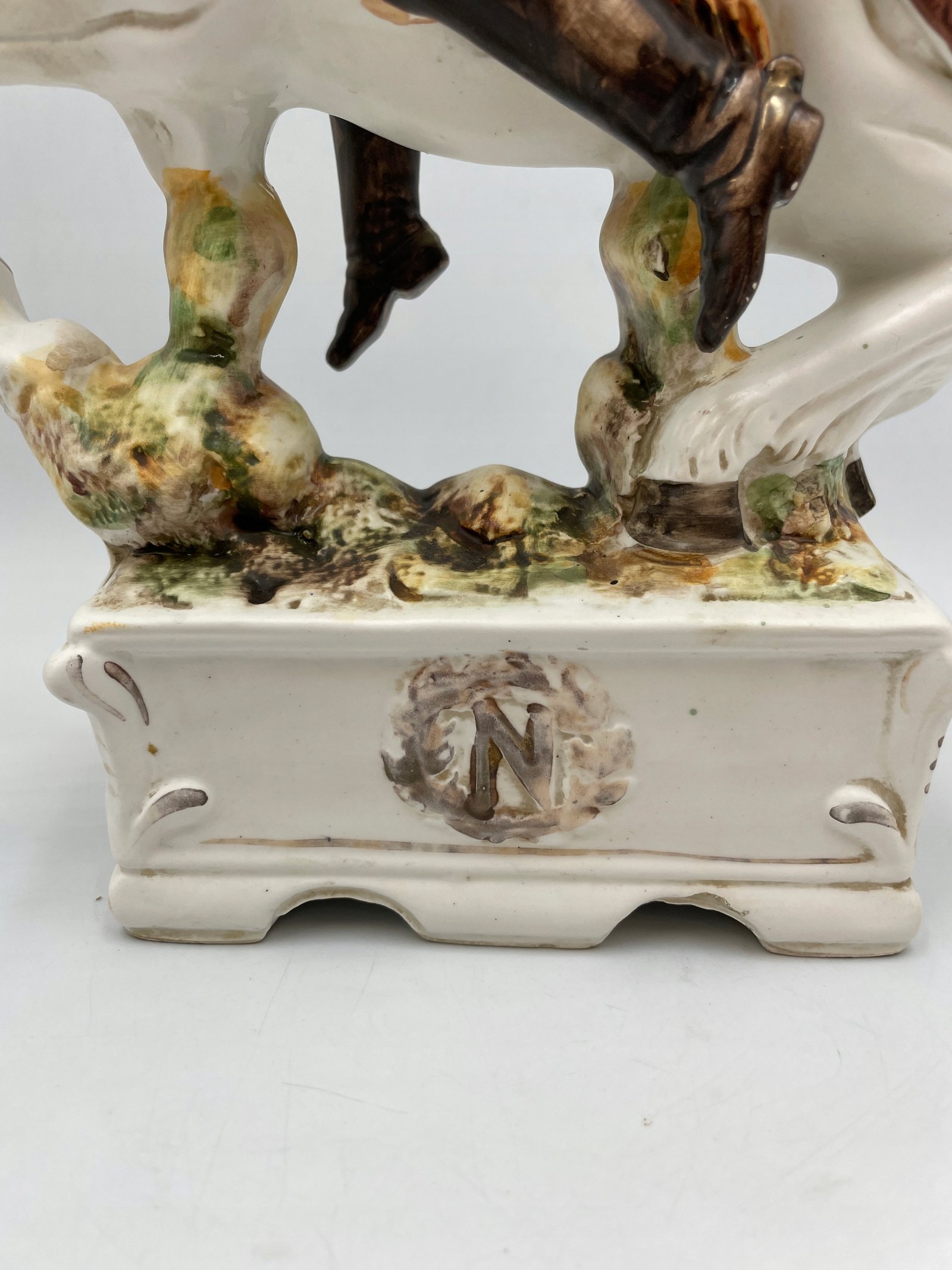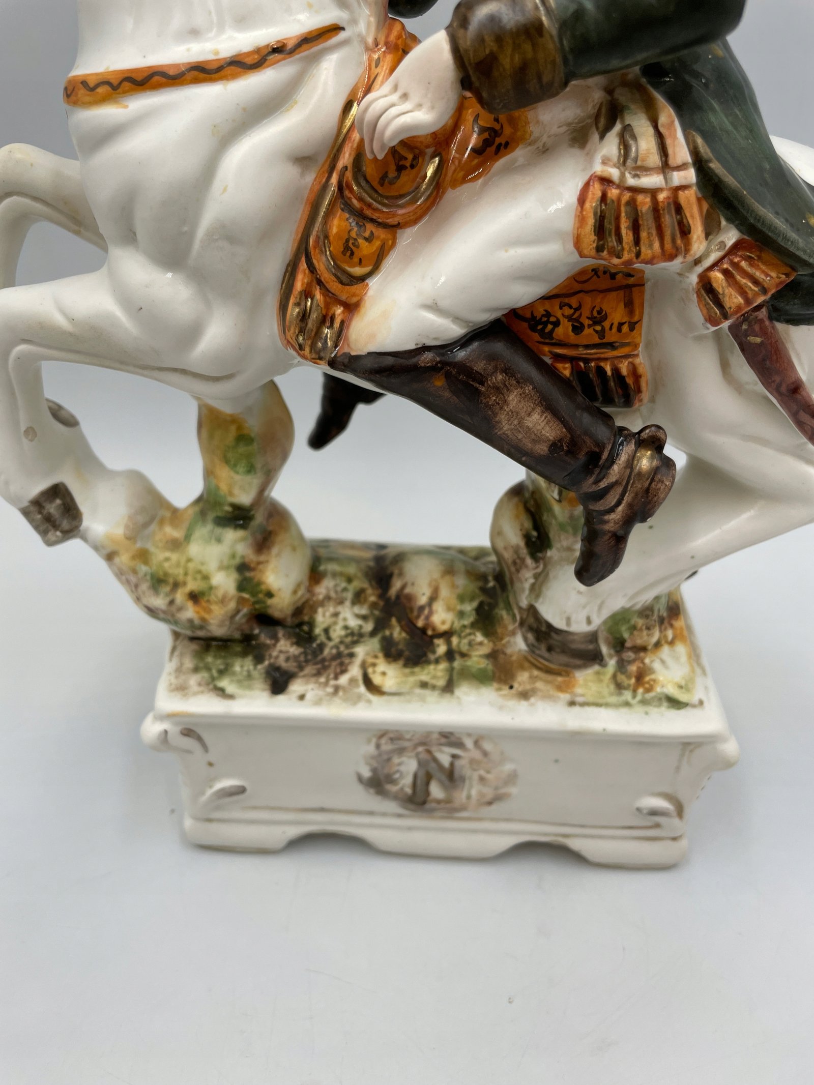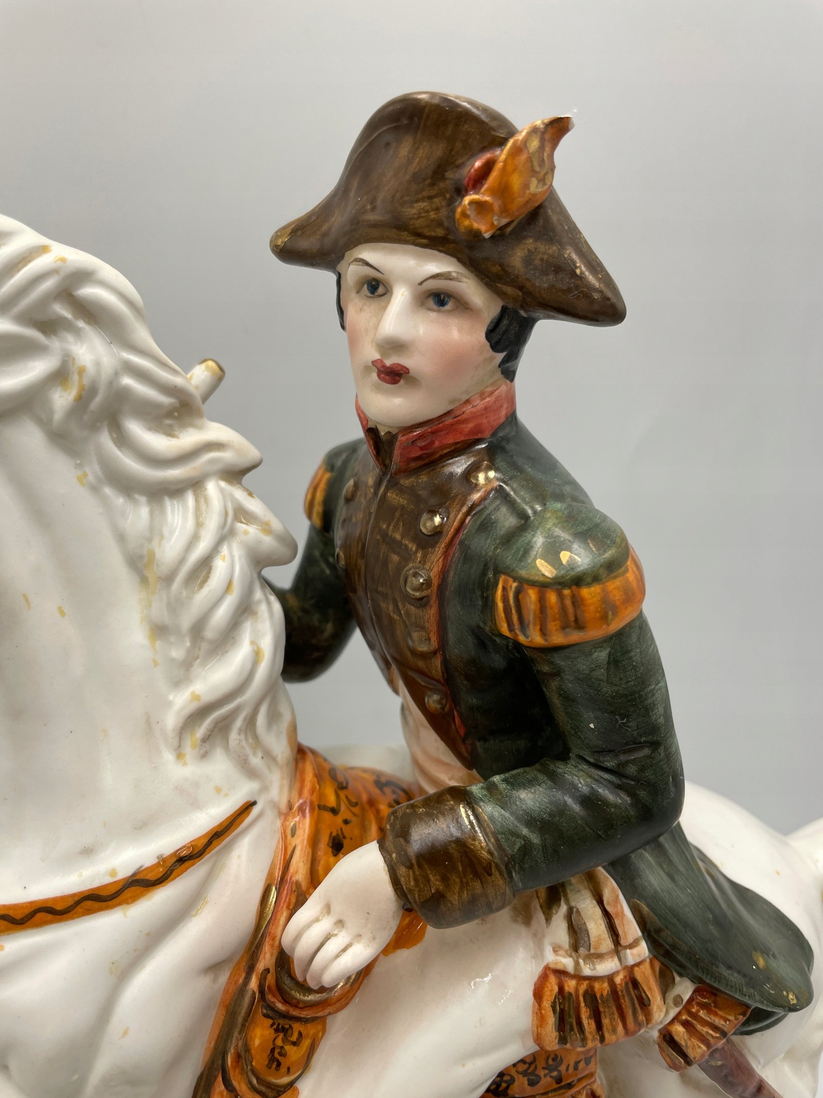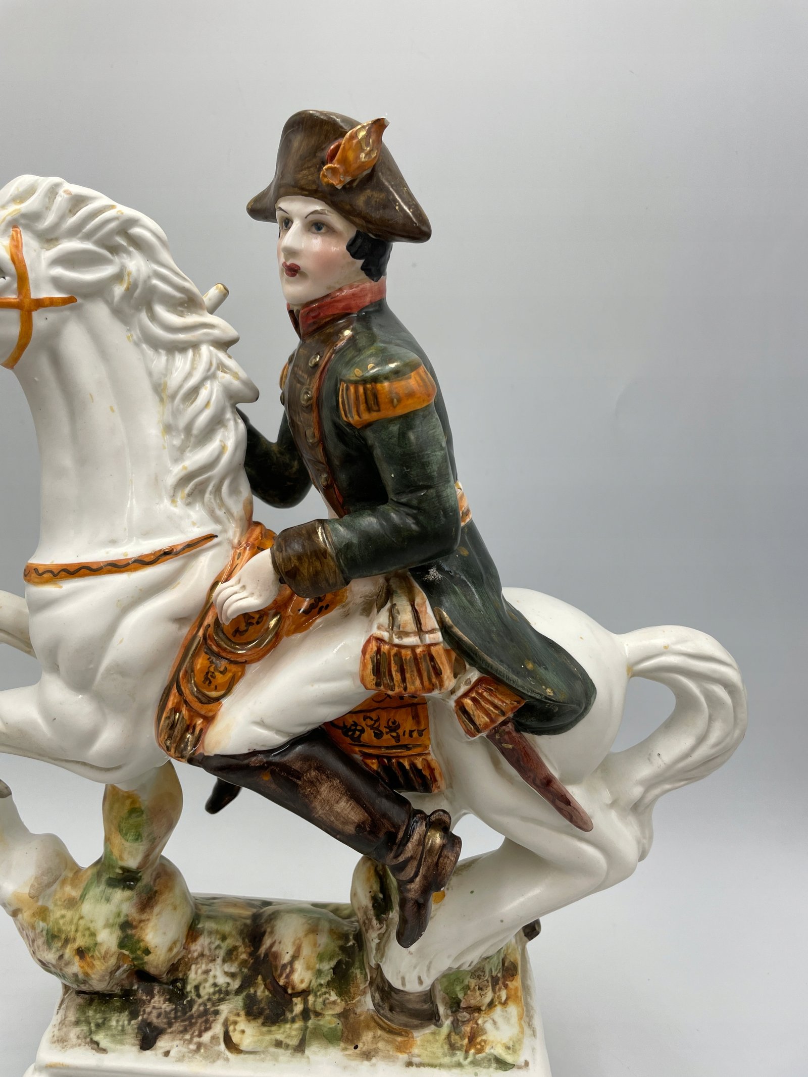 Design i dekor: Porcelanowa figurka przedstawia Napoleona Bonaparte, siedzącego na białym koniu w efektownej pozie. Szczegółowe malowanie odzwierciedla historyczny mundur wojskowy z zieloną kurtką, złotymi elementami i czerwonym szalikiem. Podstawa jest ozdobiona reliefową literą „N”, symbolizującą Napoleona, a ogólny styl podkreśla historyczne znaczenie tej postaci.