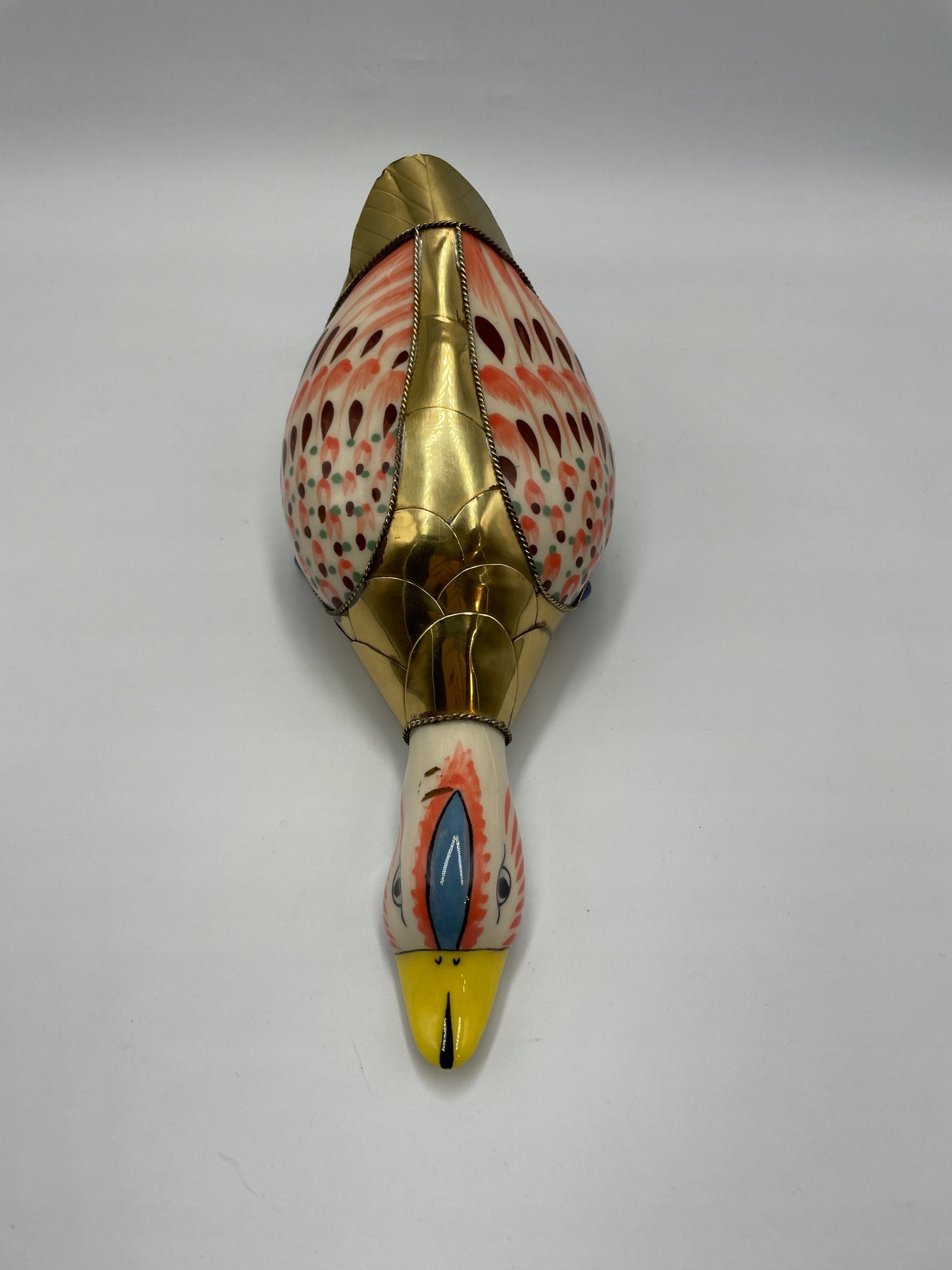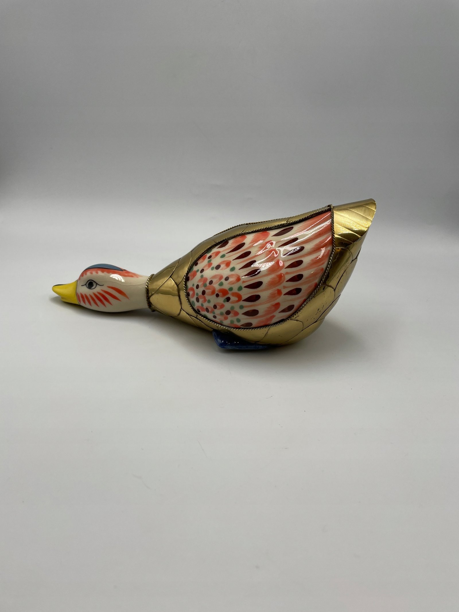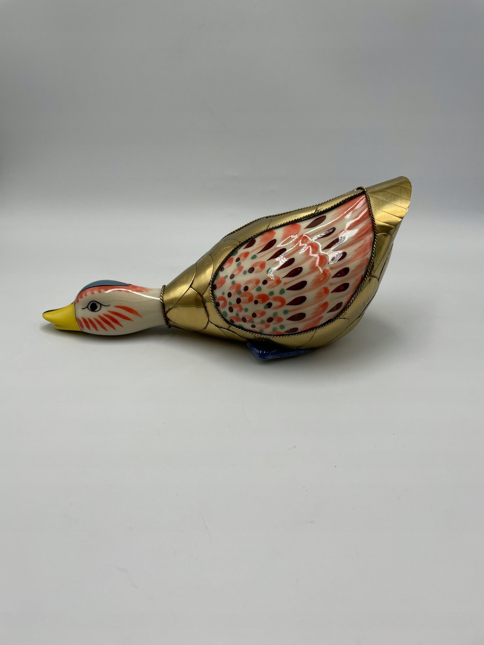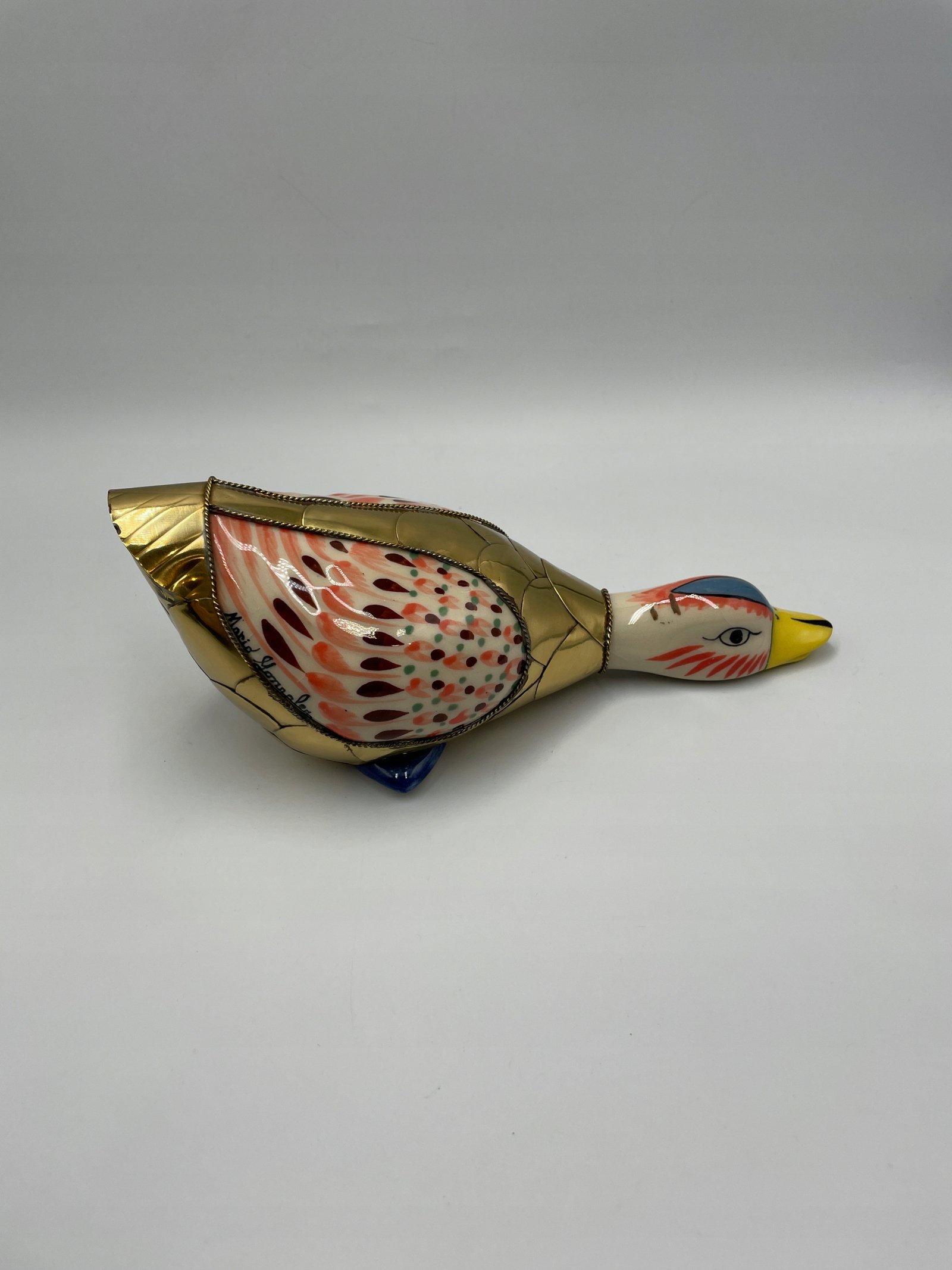 Porcelanowo-metalowa figurka kaczki z podpisem
