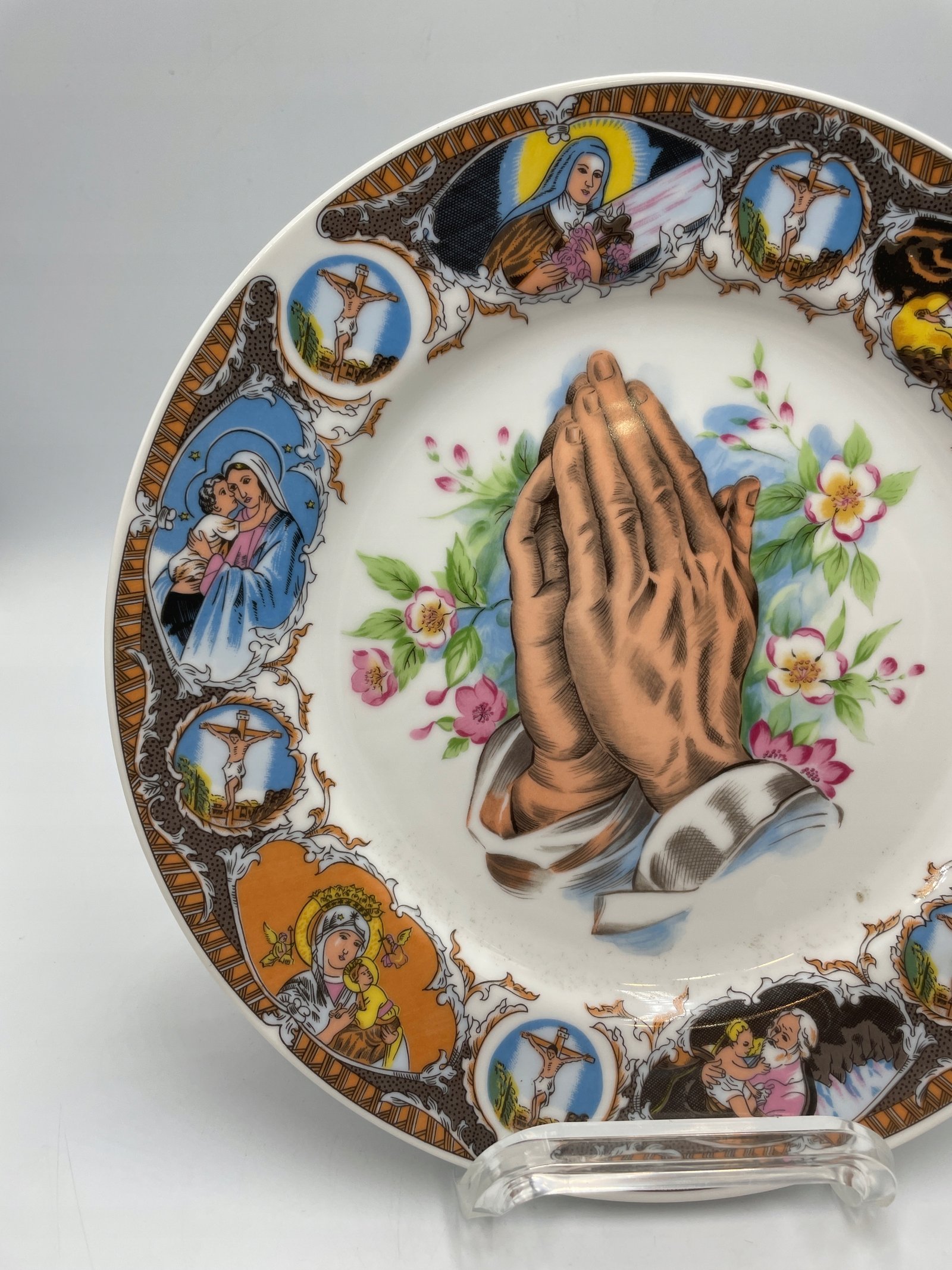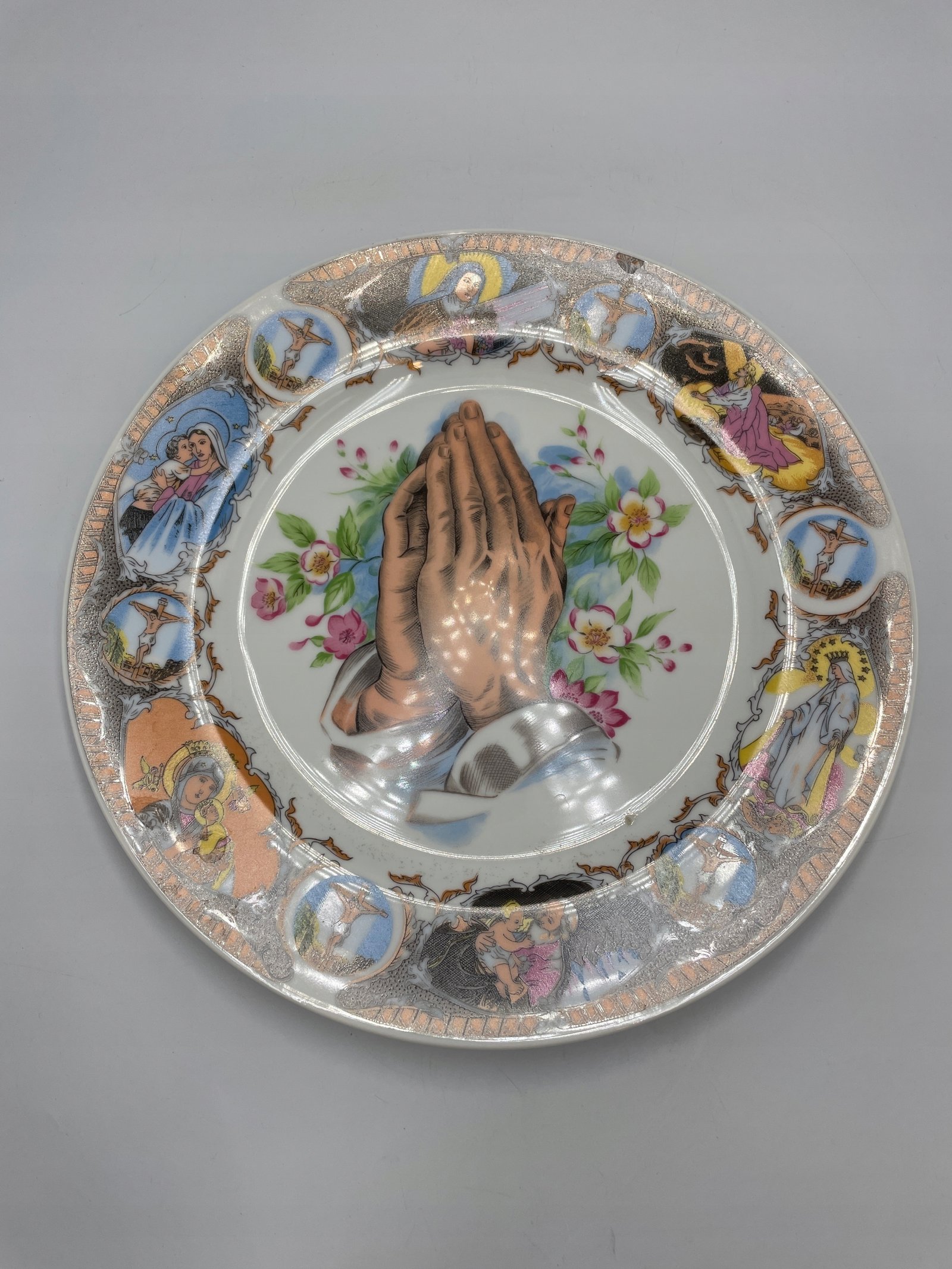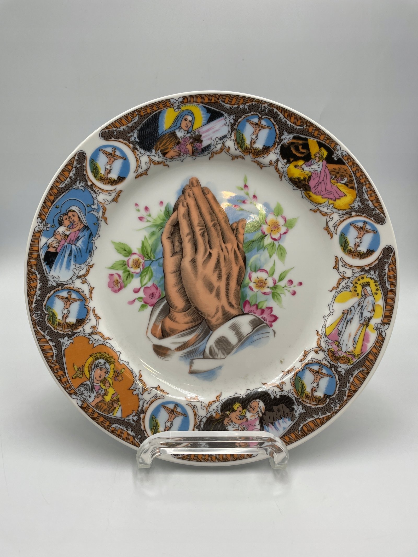 Dekoracyjny talerz porcelanowy z bogatą ikonografią religijną. W centralnej części znajduje się obraz złożonych do modlitwy dłoni na tle kwiatów. Brzeg talerza zdobią ilustracje przedstawiające sceny związane z Matką Boską, Jezusem i innymi świętymi, otoczone złoto-brązowym ornamentem.