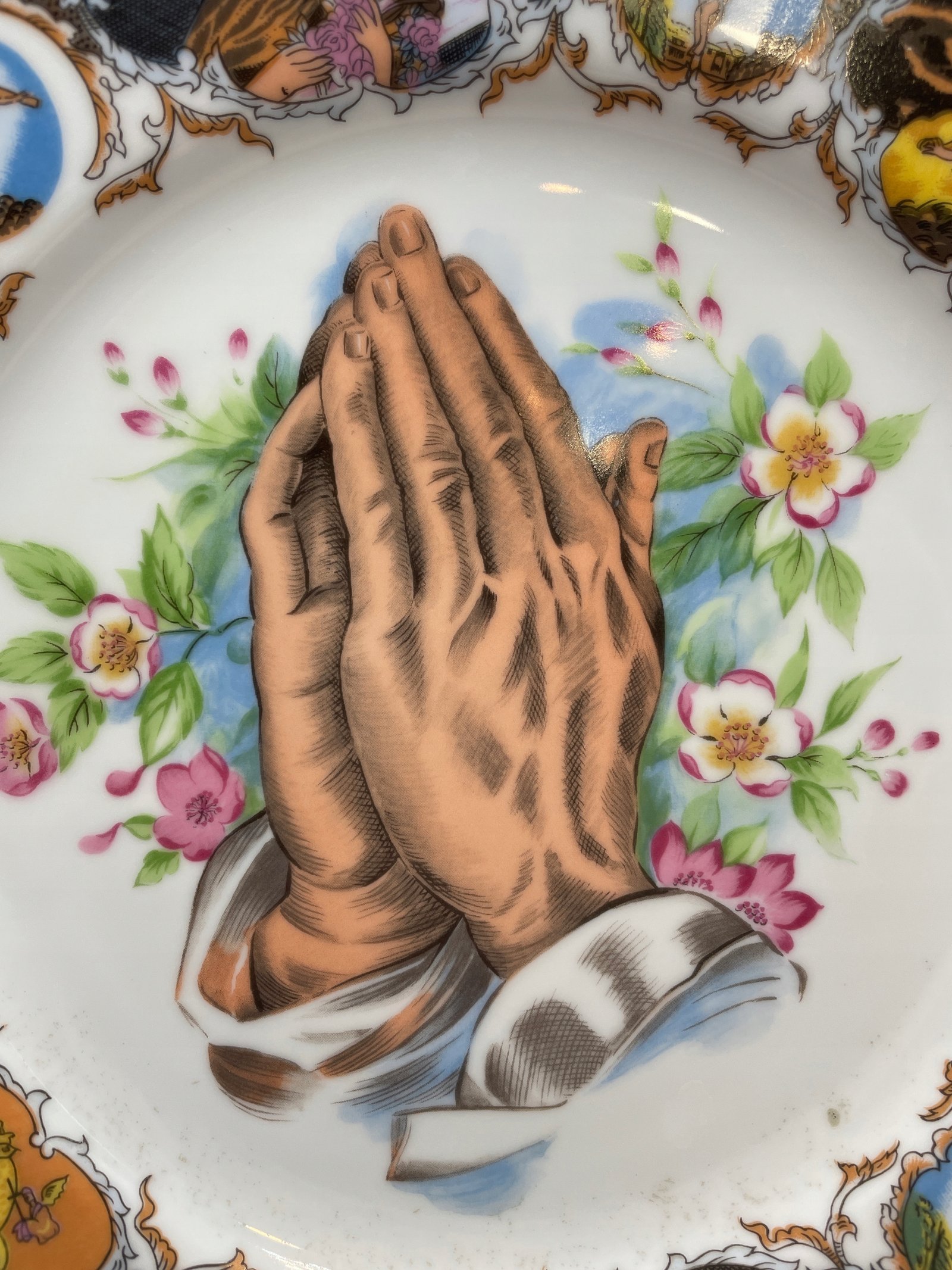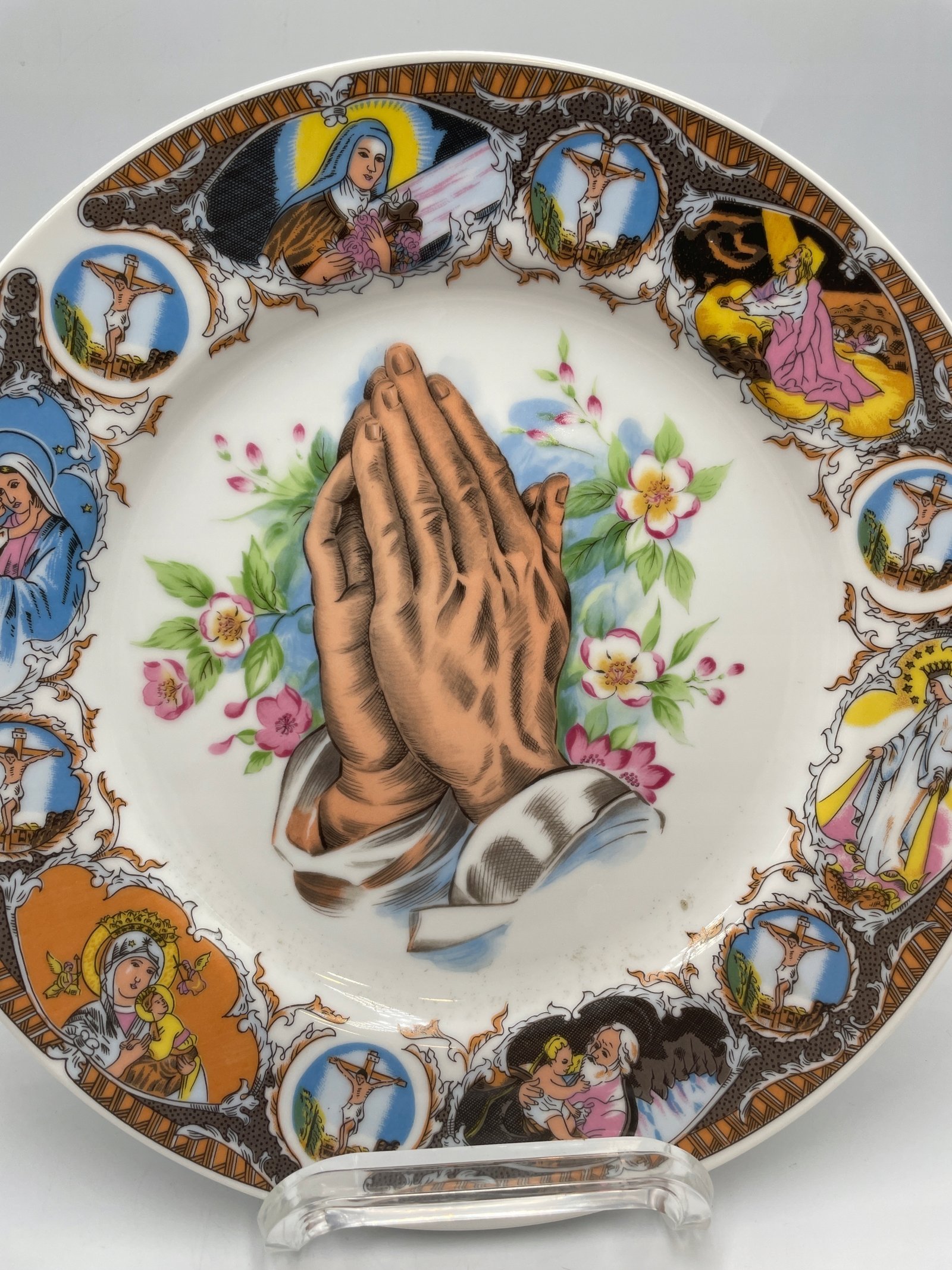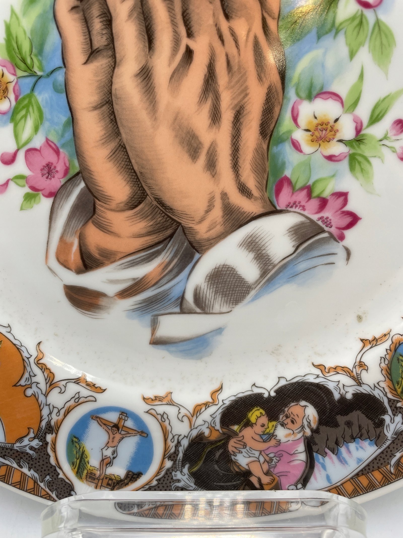 Dekoracyjny talerz porcelanowy z bogatą ikonografią religijną. W centralnej części znajduje się obraz złożonych do modlitwy dłoni na tle kwiatów. Brzeg talerza zdobią ilustracje przedstawiające sceny związane z Matką Boską, Jezusem i innymi świętymi, otoczone złoto-brązowym ornamentem.