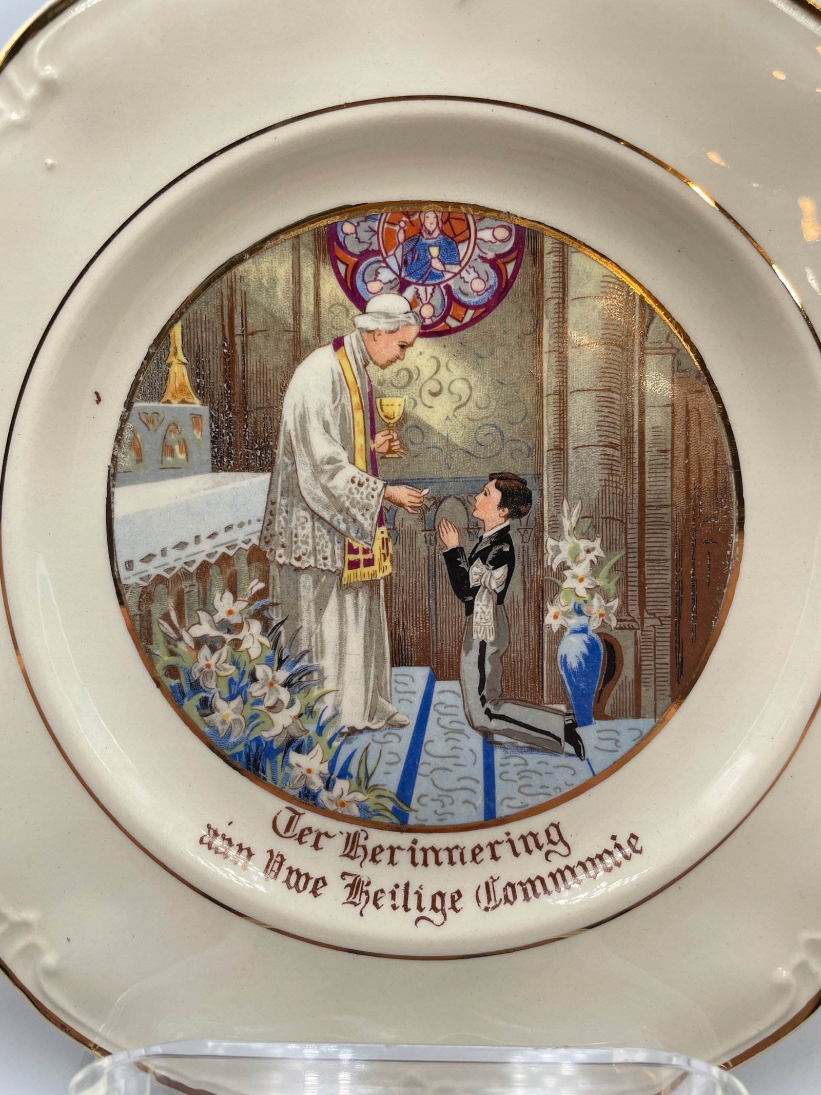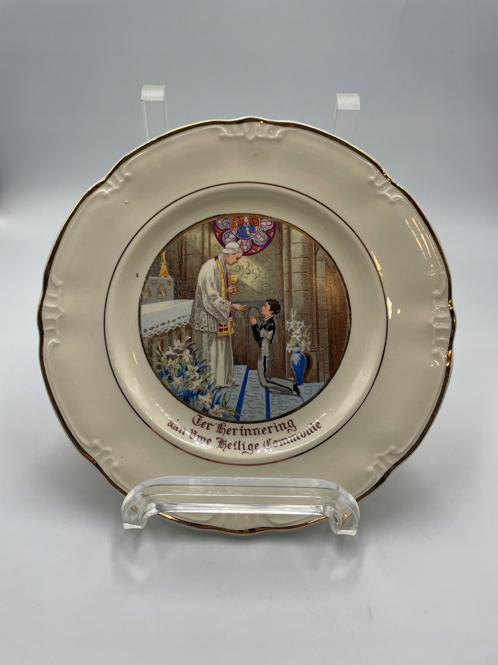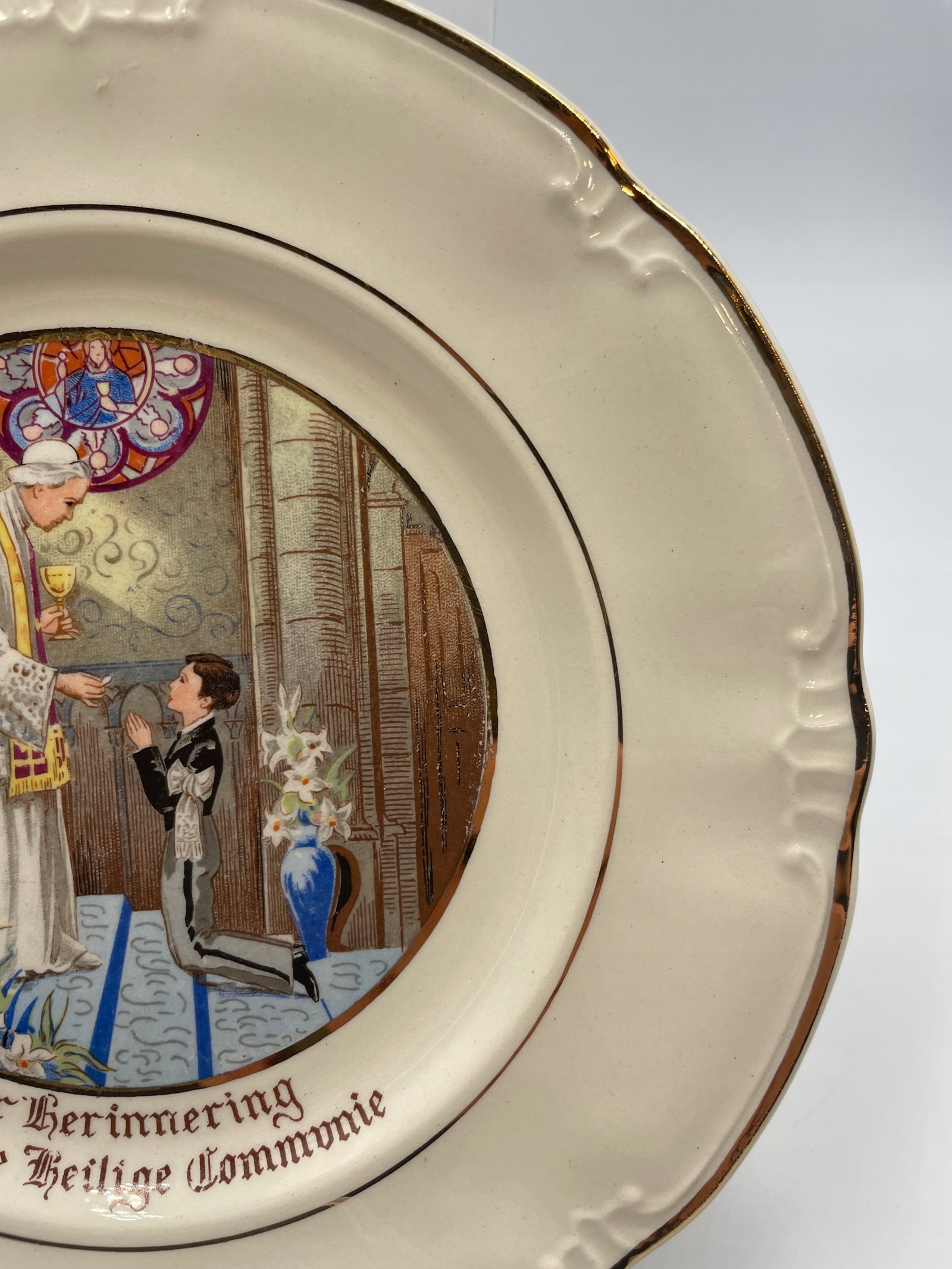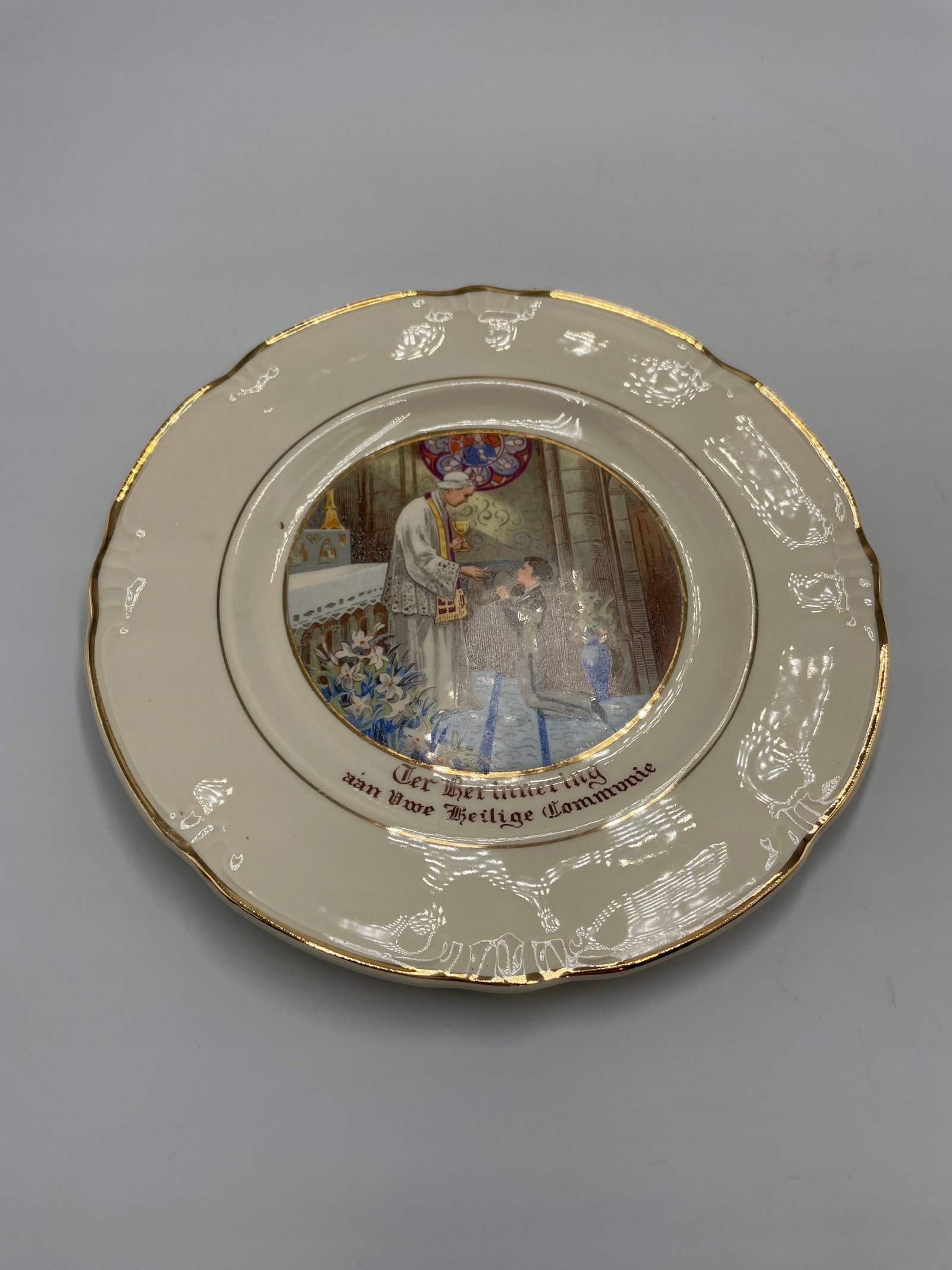 Porcelanowy talerz pamiątkowy upamiętniający Pierwszą Komunię Świętą. Centralnym elementem jest realistyczna scena sakramentu komunii – kapłan podaje hostię klęczącemu dziecku na tle wnętrza kościoła z witrażem i ołtarzem. Na dole umieszczony jest napis w języku niderlandzkim: „Ter Herinnering aan Uwe Heilige Communie”, co oznacza „Na pamiątkę Twojej Pierwszej Komunii Świętej”. Brzeg talerza ma kremowy odcień i delikatne złocenia na krawędziach.