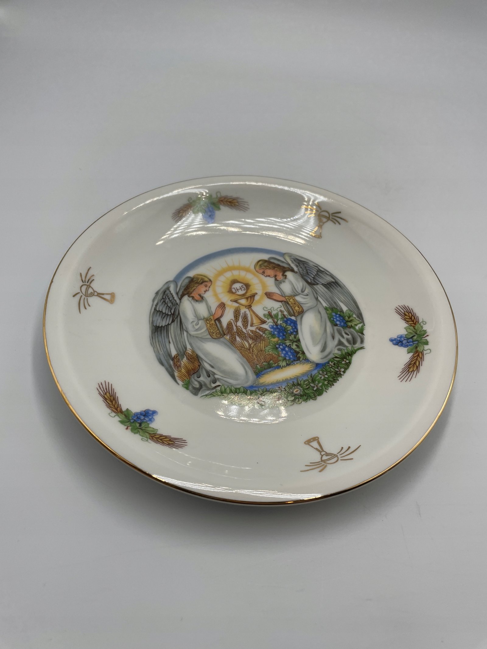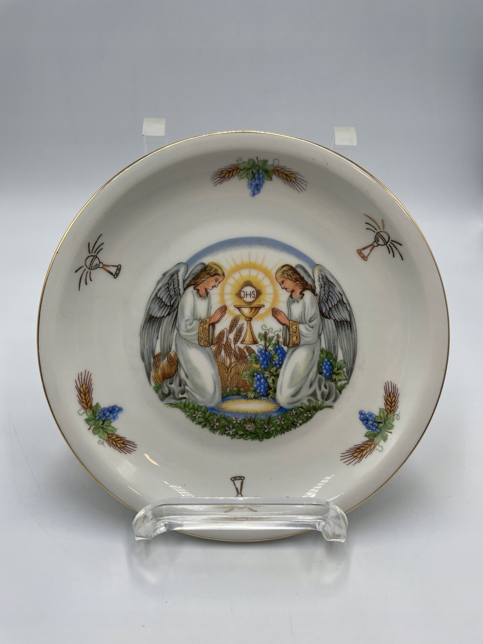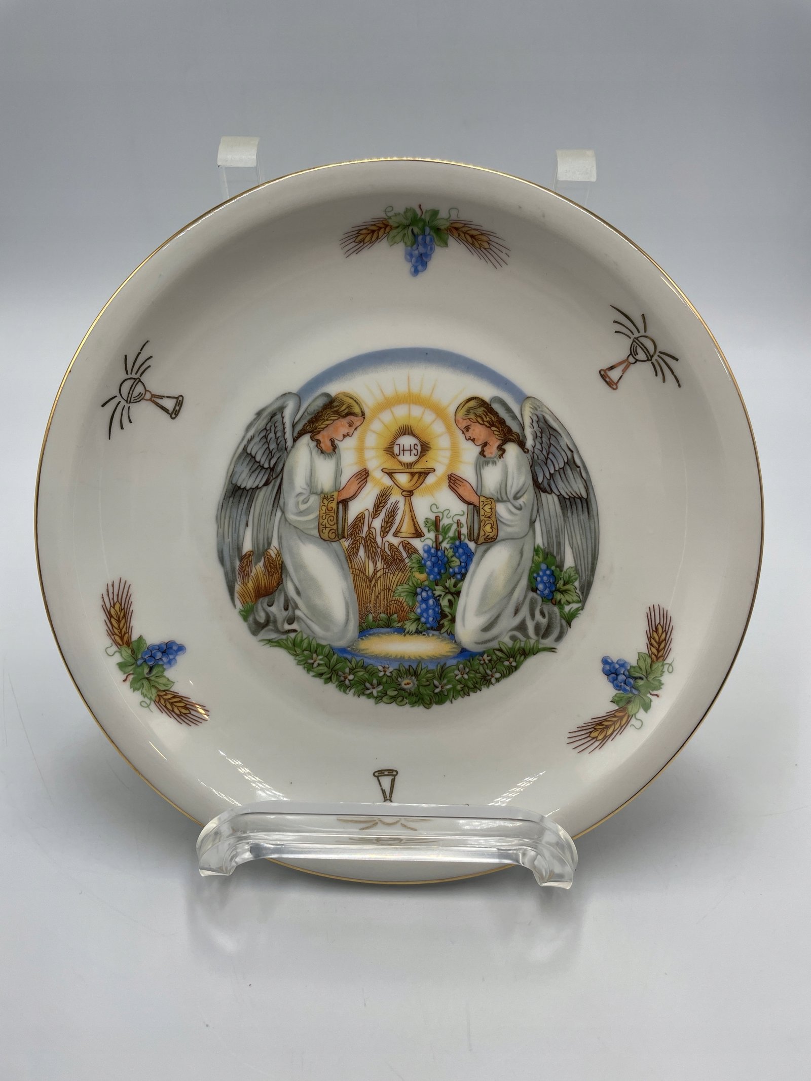 Porcelanowy talerz pamiątkowy upamiętniający Pierwszą Komunię Świętą. Centralny motyw przedstawia dwóch klęczących aniołów adorujących kielich eucharystyczny z monogramem IHS, otoczony promieniami światła, kłosami pszenicy oraz winogronami. Dodatkowe zdobienia na rancie w postaci złotych elementów, kłosów oraz stylizowanych kielichów. Brzeg talerza delikatnie podkreślony złotą linią.