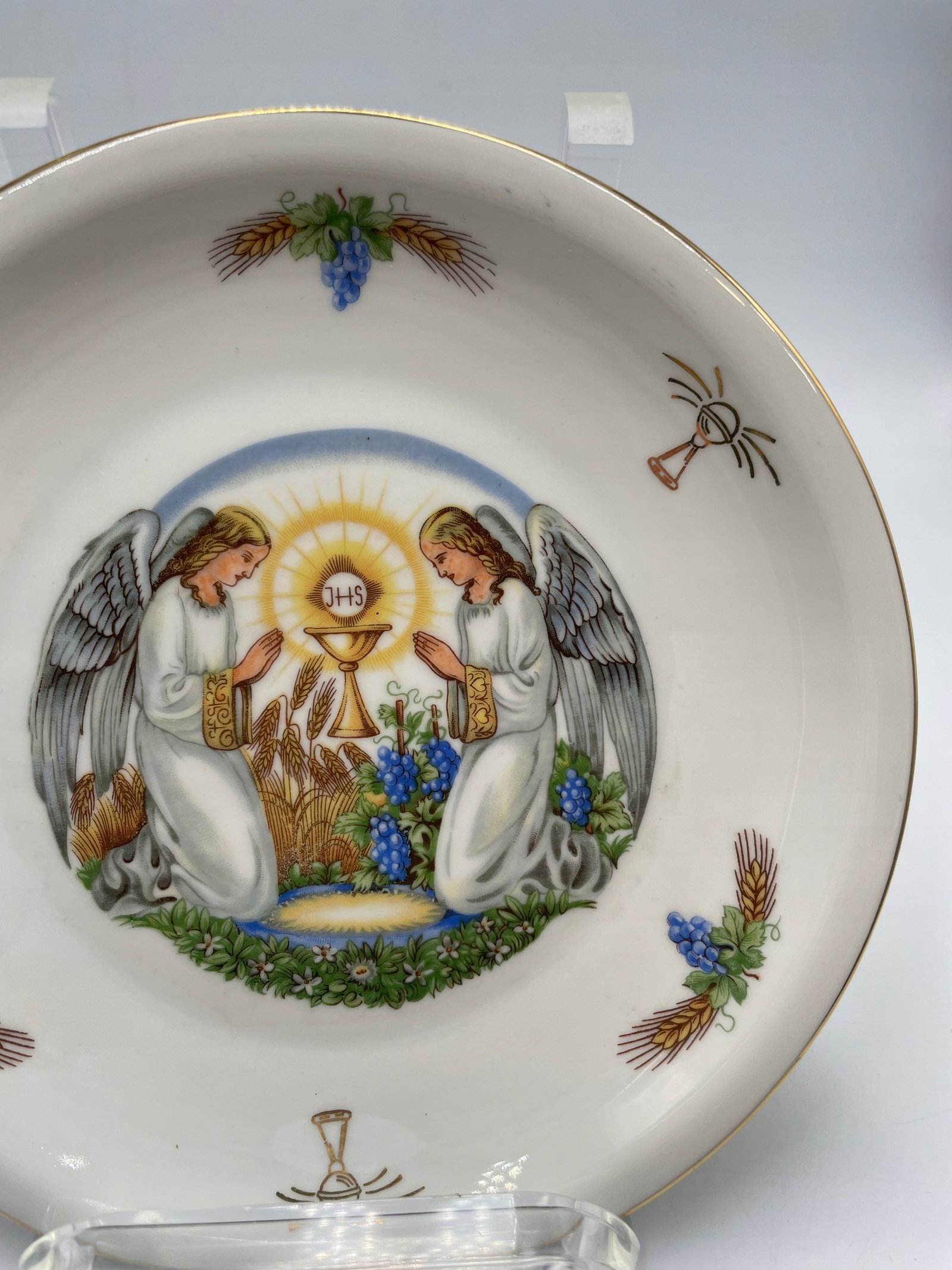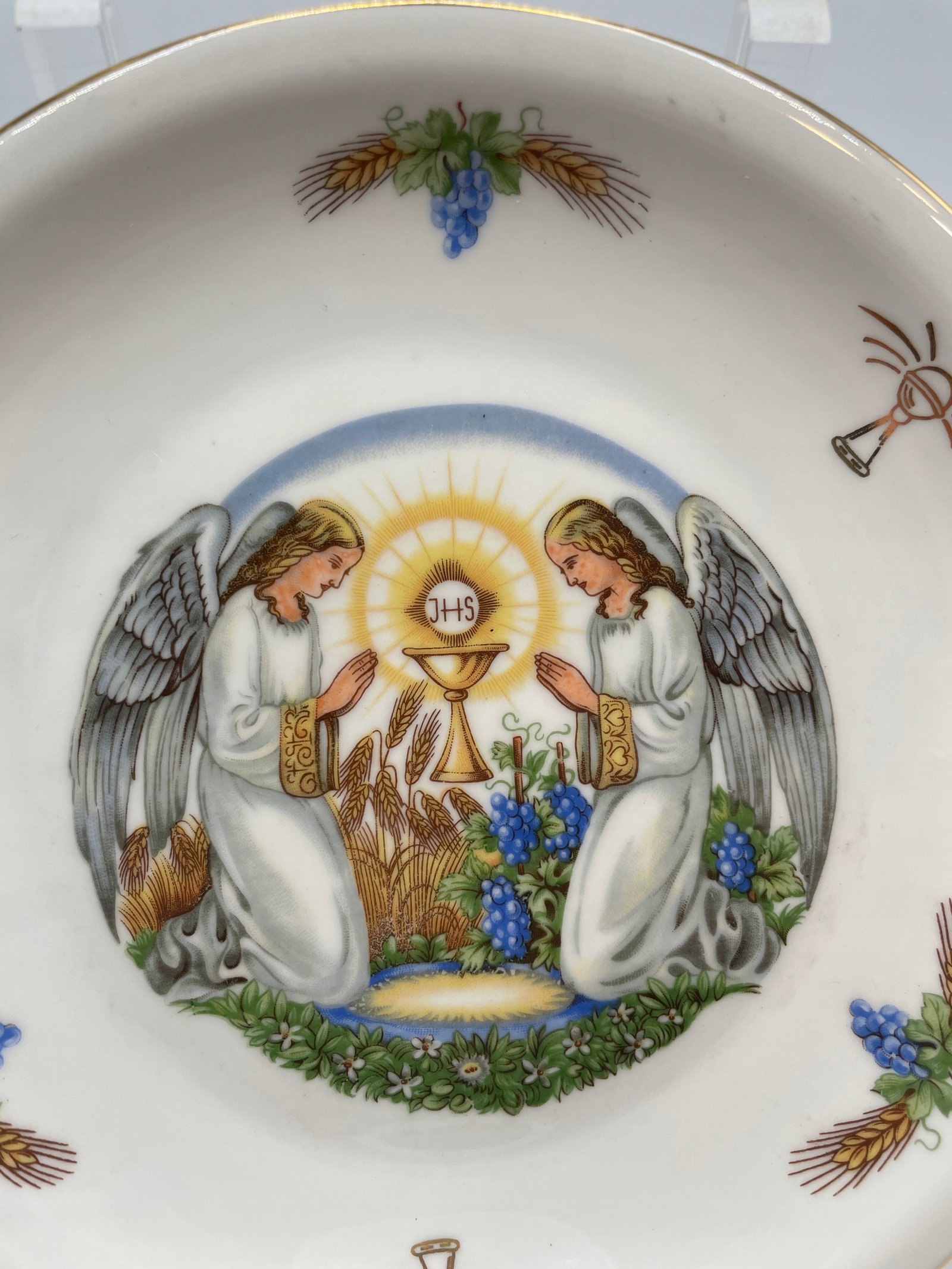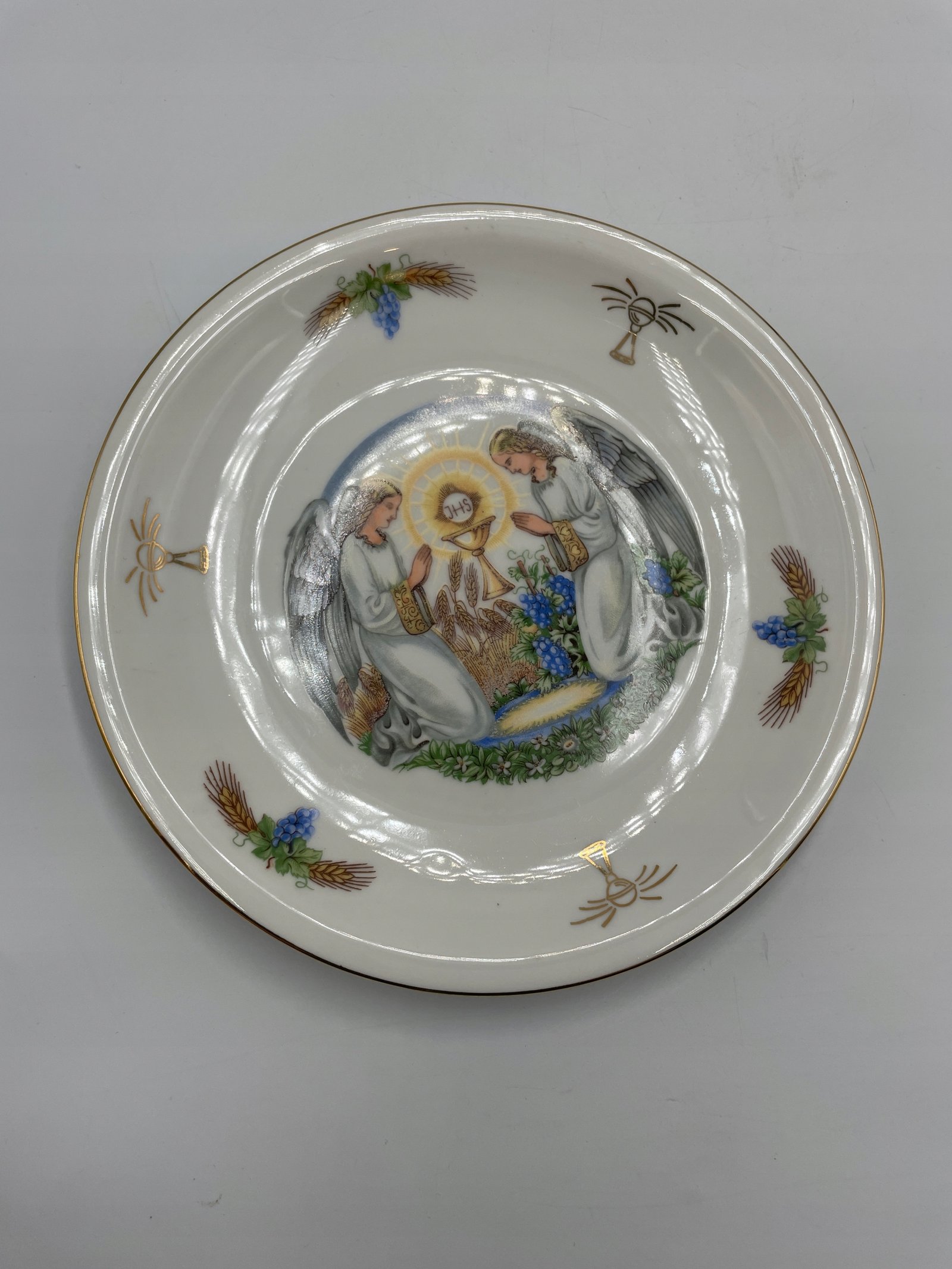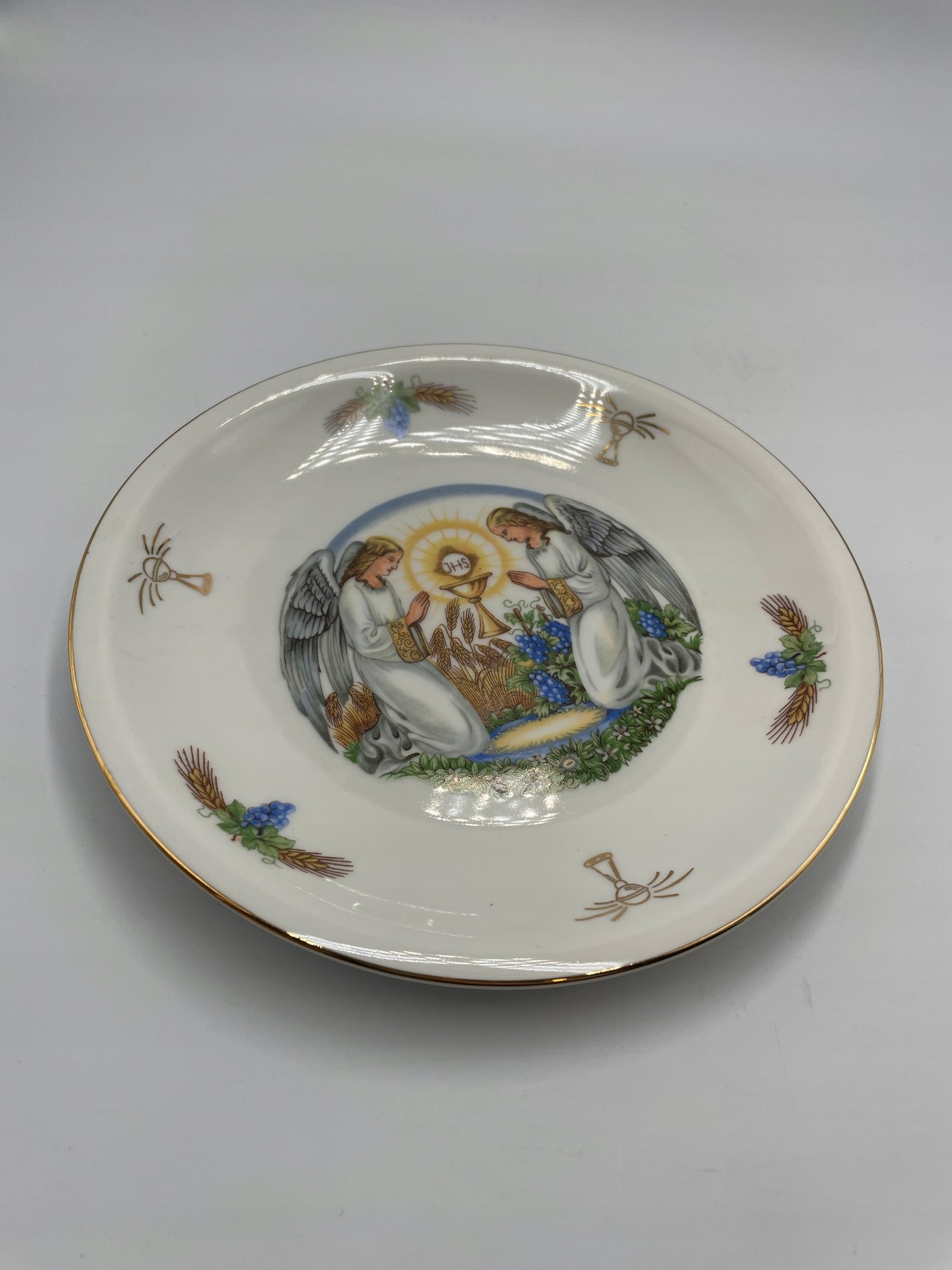 Porcelanowy talerz pamiątkowy upamiętniający Pierwszą Komunię Świętą. Centralny motyw przedstawia dwóch klęczących aniołów adorujących kielich eucharystyczny z monogramem IHS, otoczony promieniami światła, kłosami pszenicy oraz winogronami. Dodatkowe zdobienia na rancie w postaci złotych elementów, kłosów oraz stylizowanych kielichów. Brzeg talerza delikatnie podkreślony złotą linią.