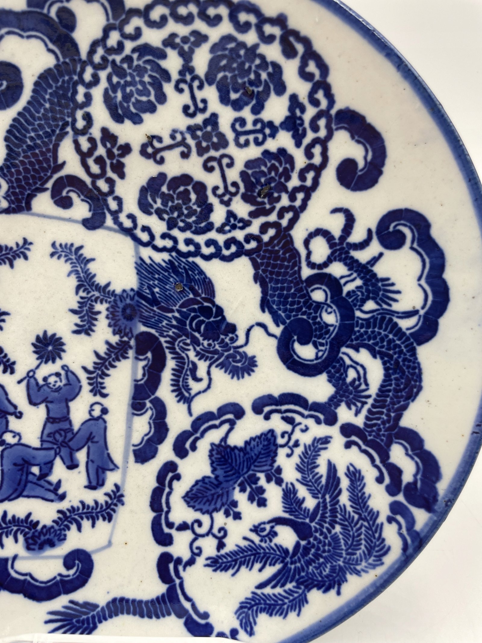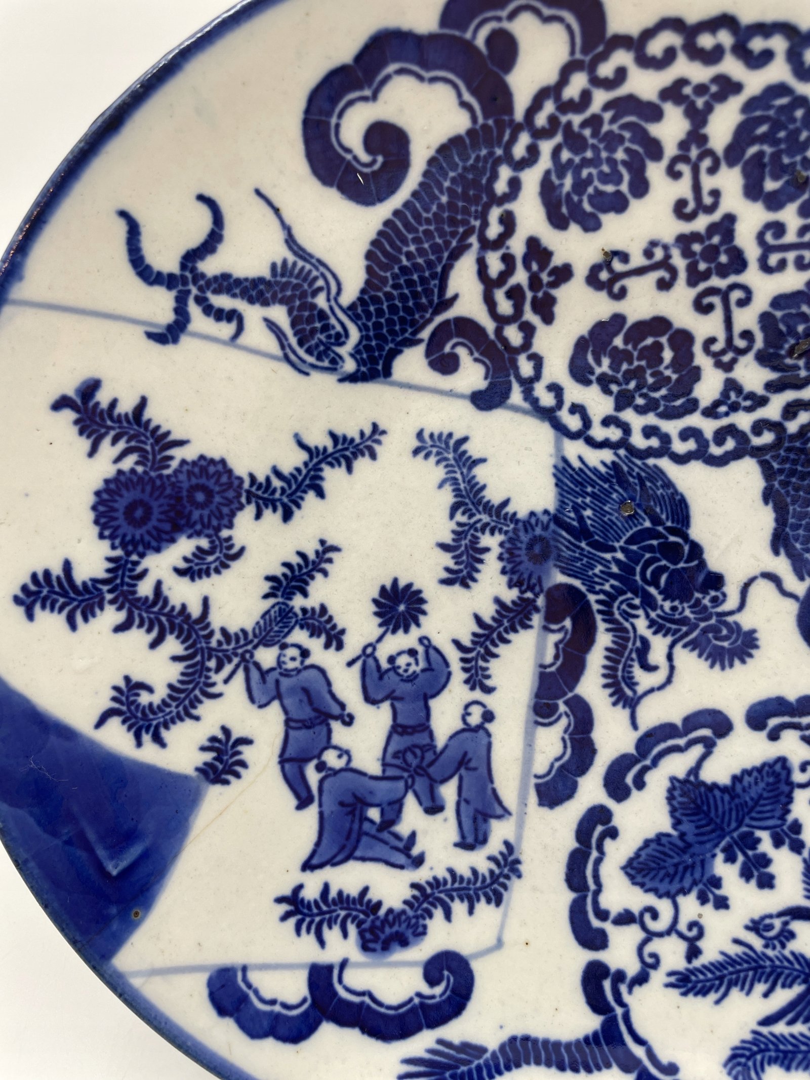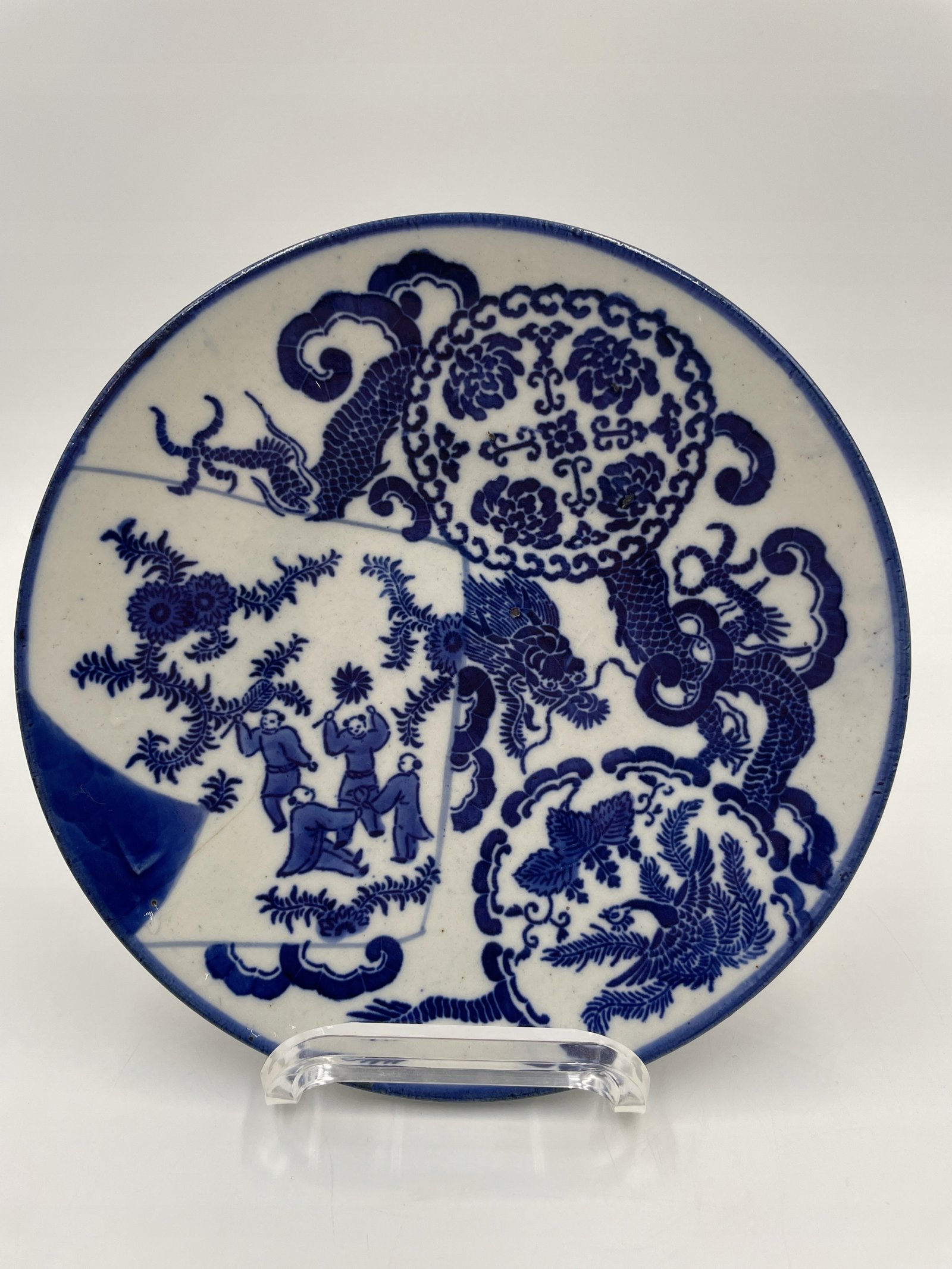 Talerz porcelanowy Chiny niebieskie zdobienie ze smokiem i scena 23cm