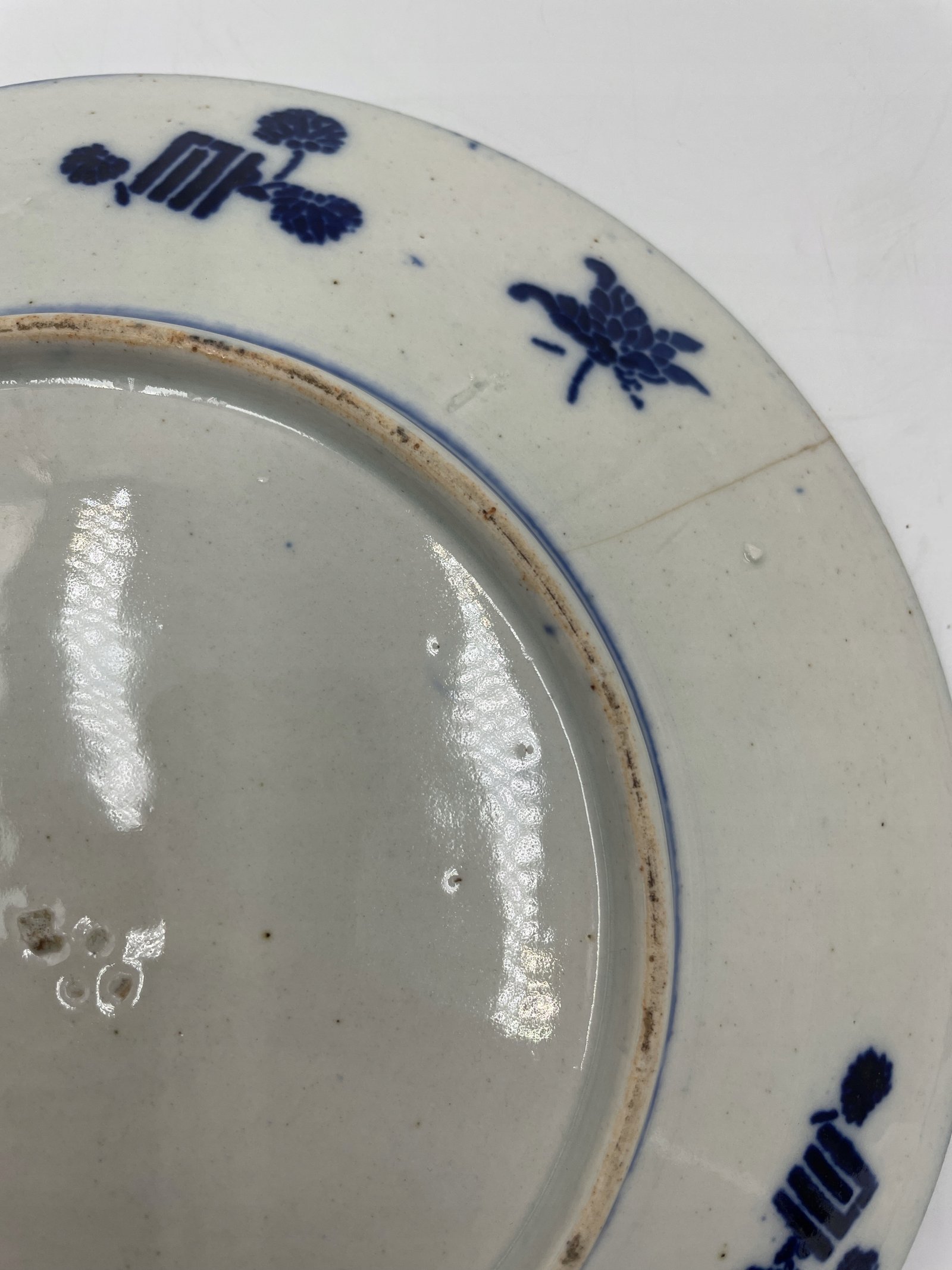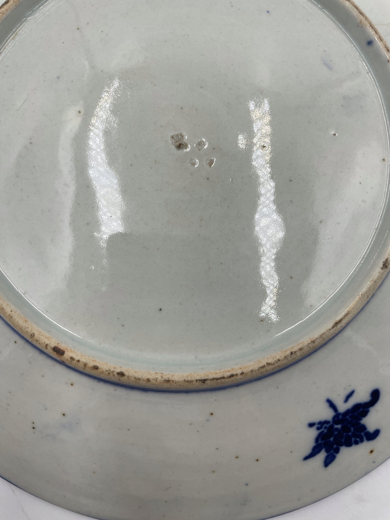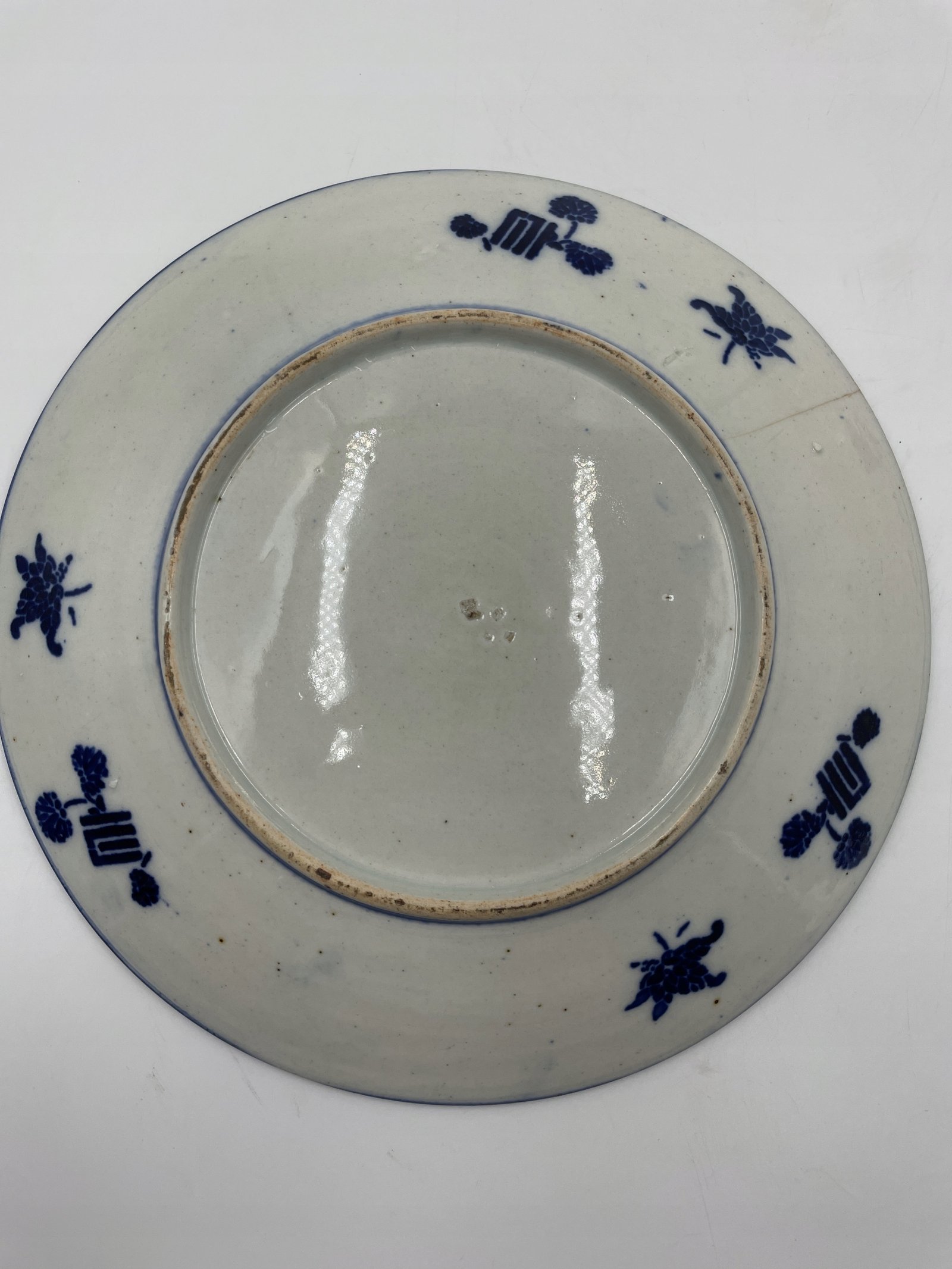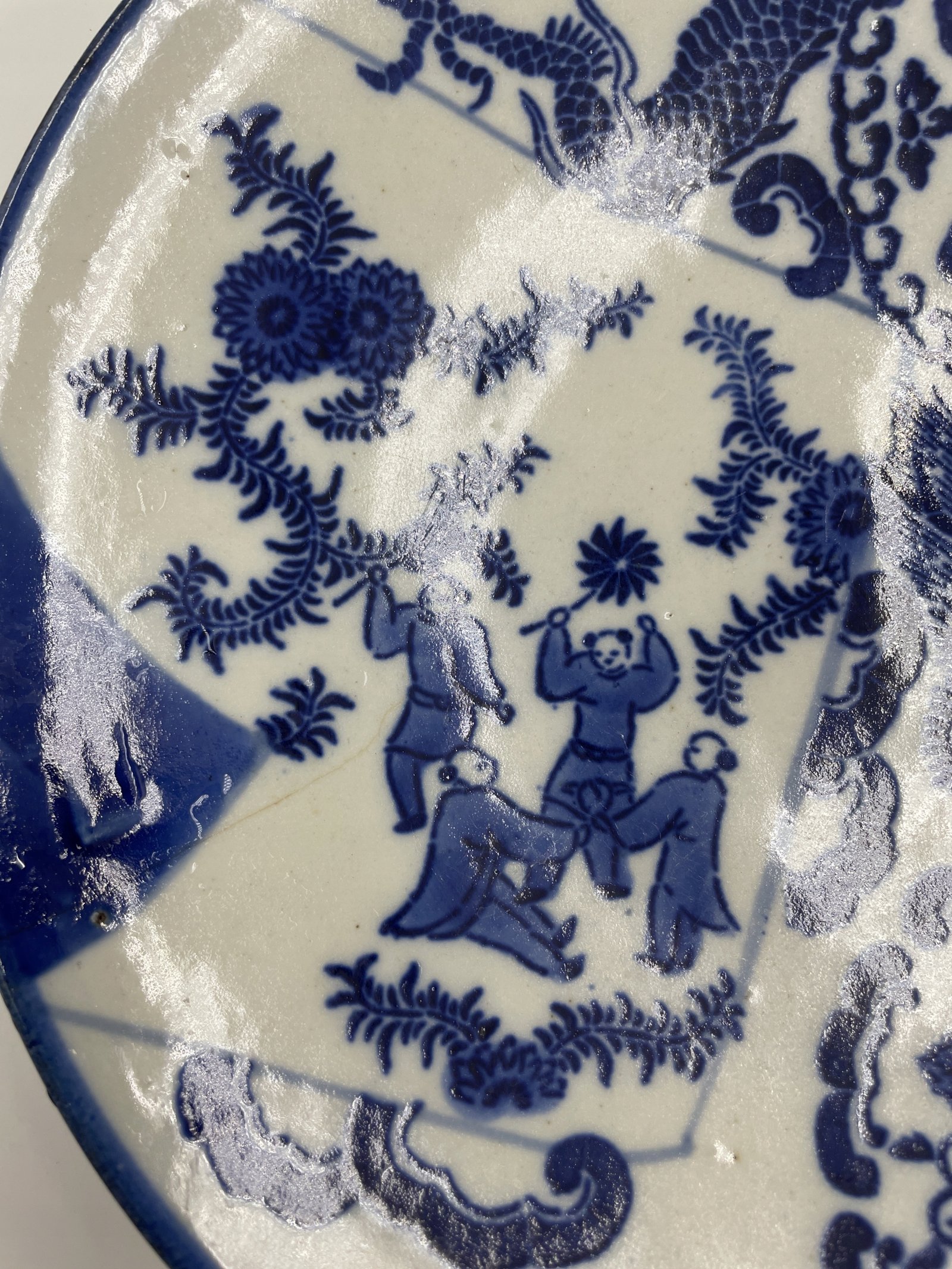 Talerz porcelanowy Chiny niebieskie zdobienie ze smokiem i scena 23cm