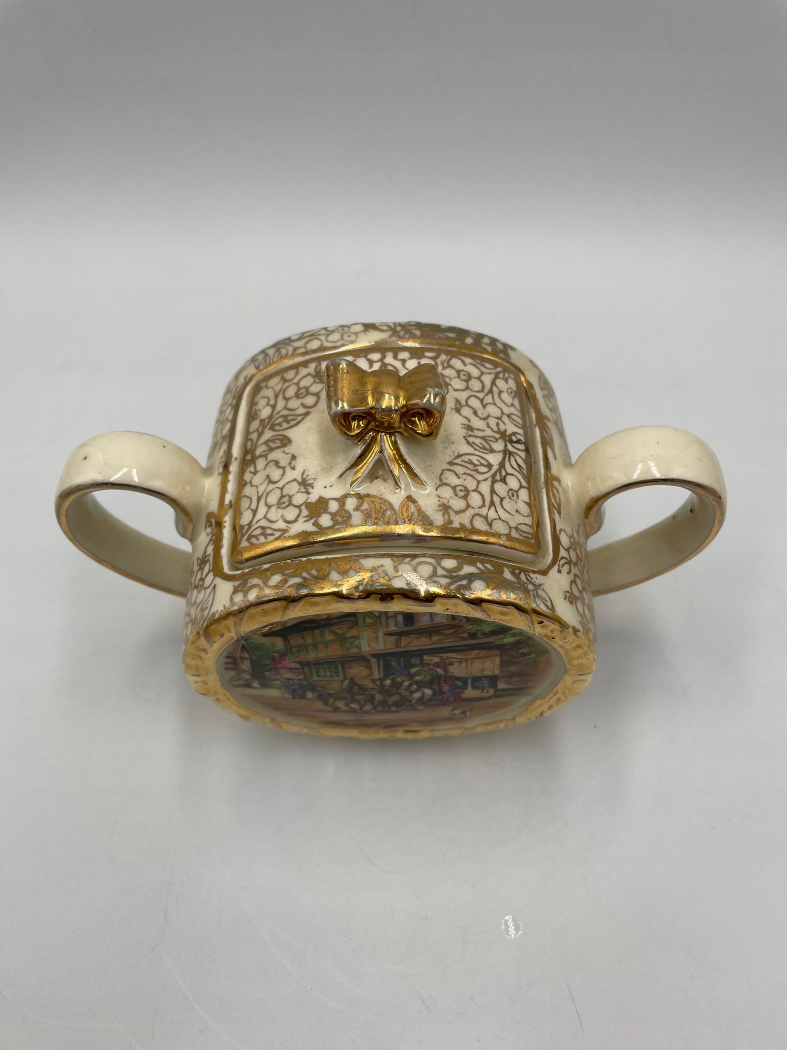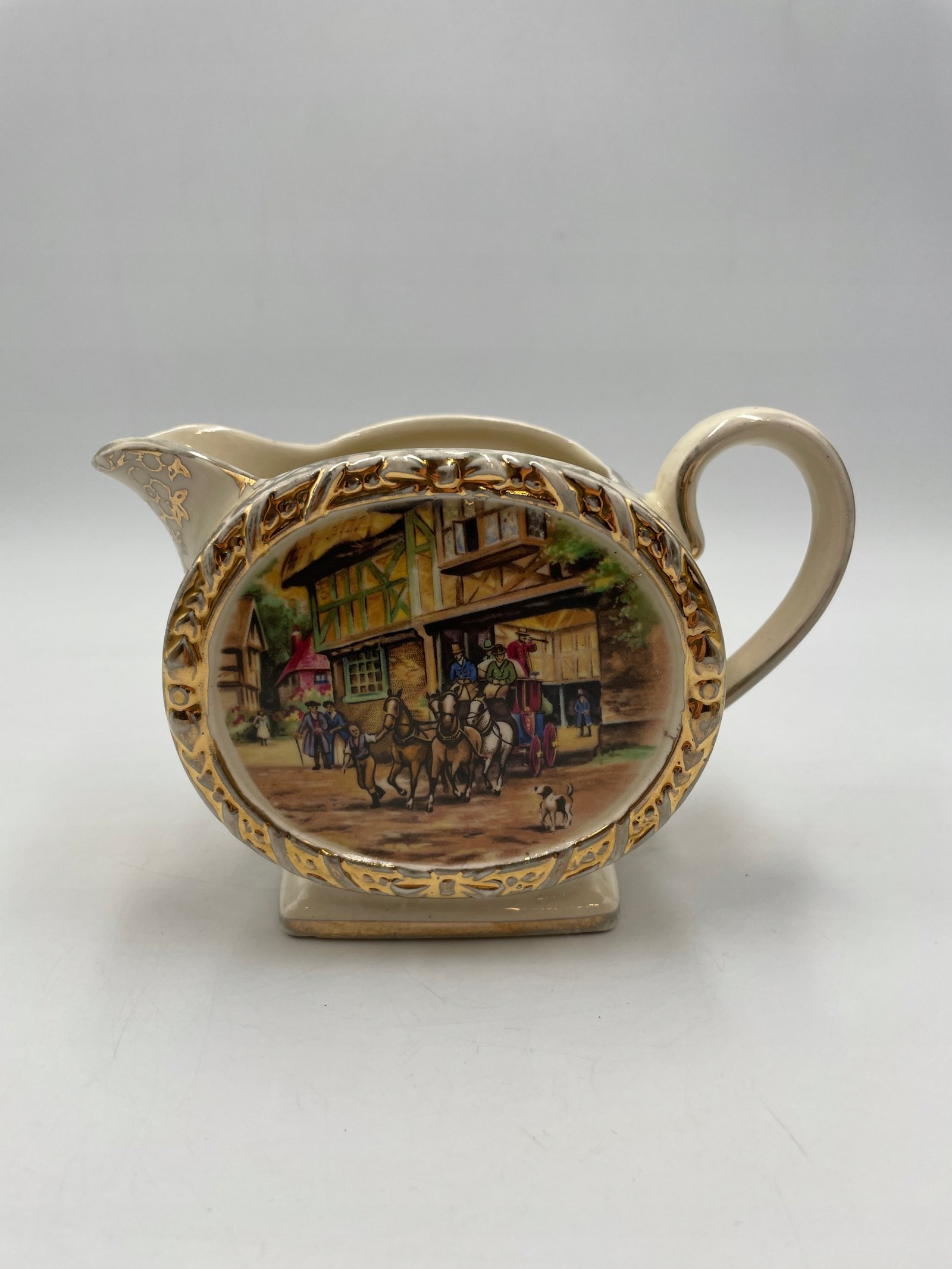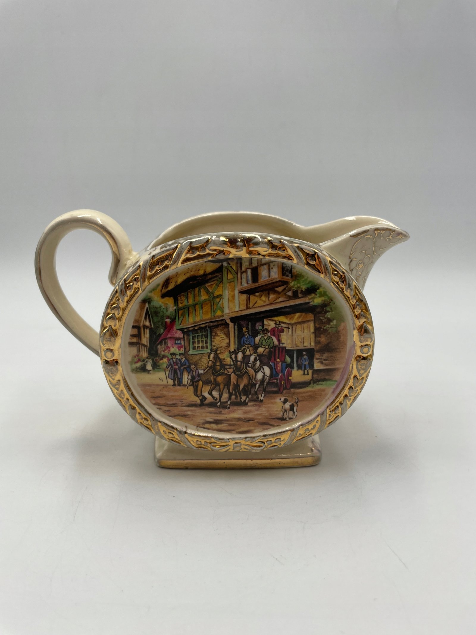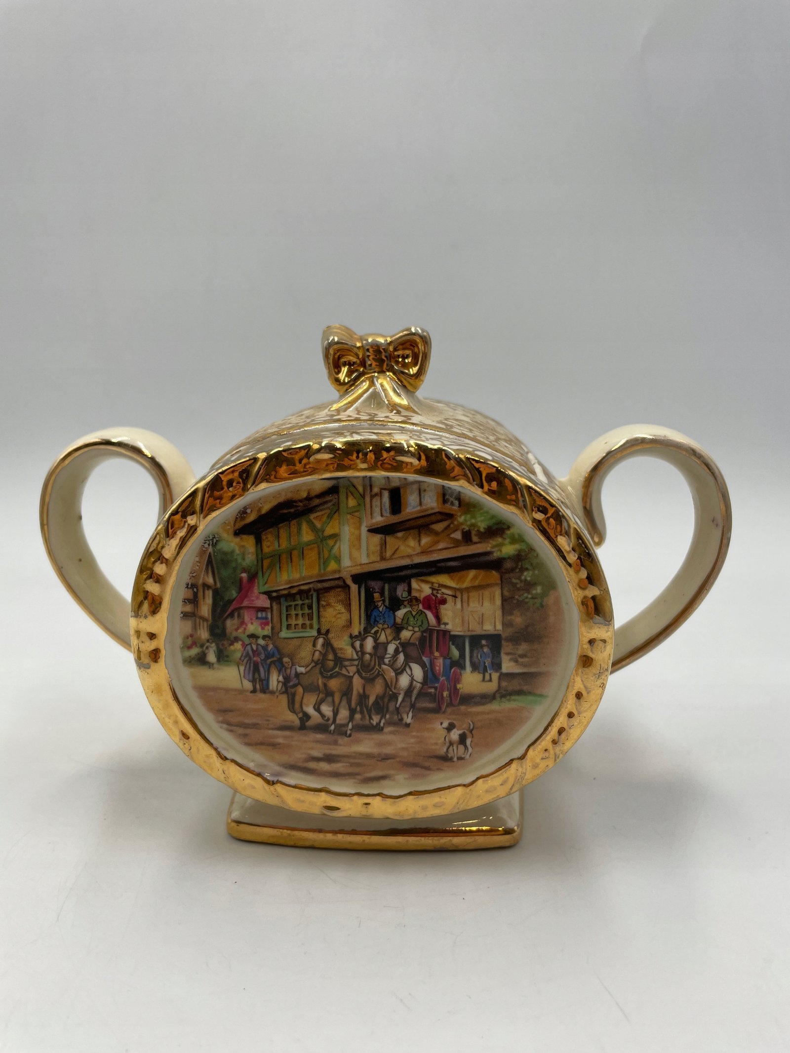 - Zdobienie: Ręcznie malowana scenka przedstawiająca powóz konny przed zabytkowym budynkiem