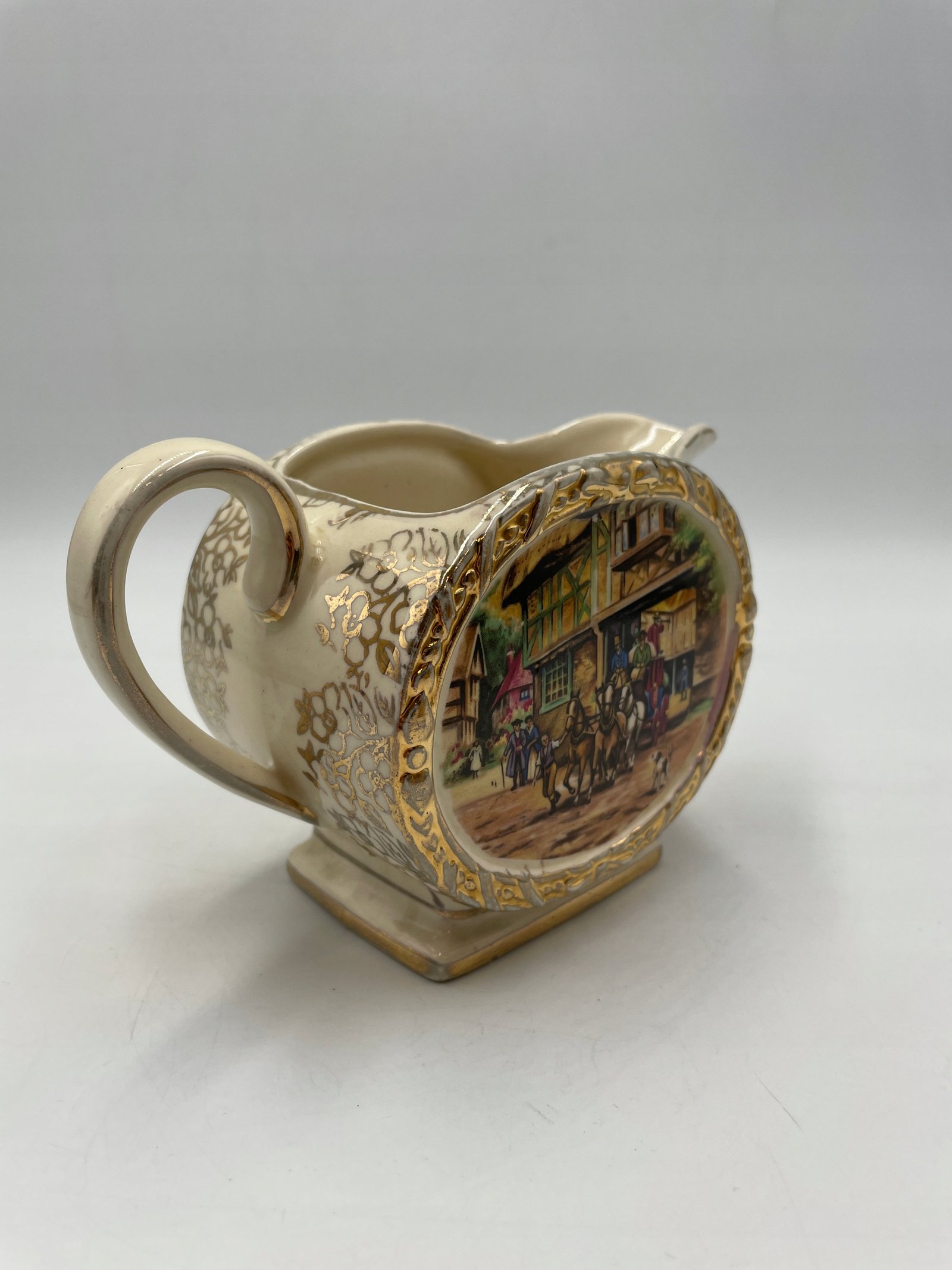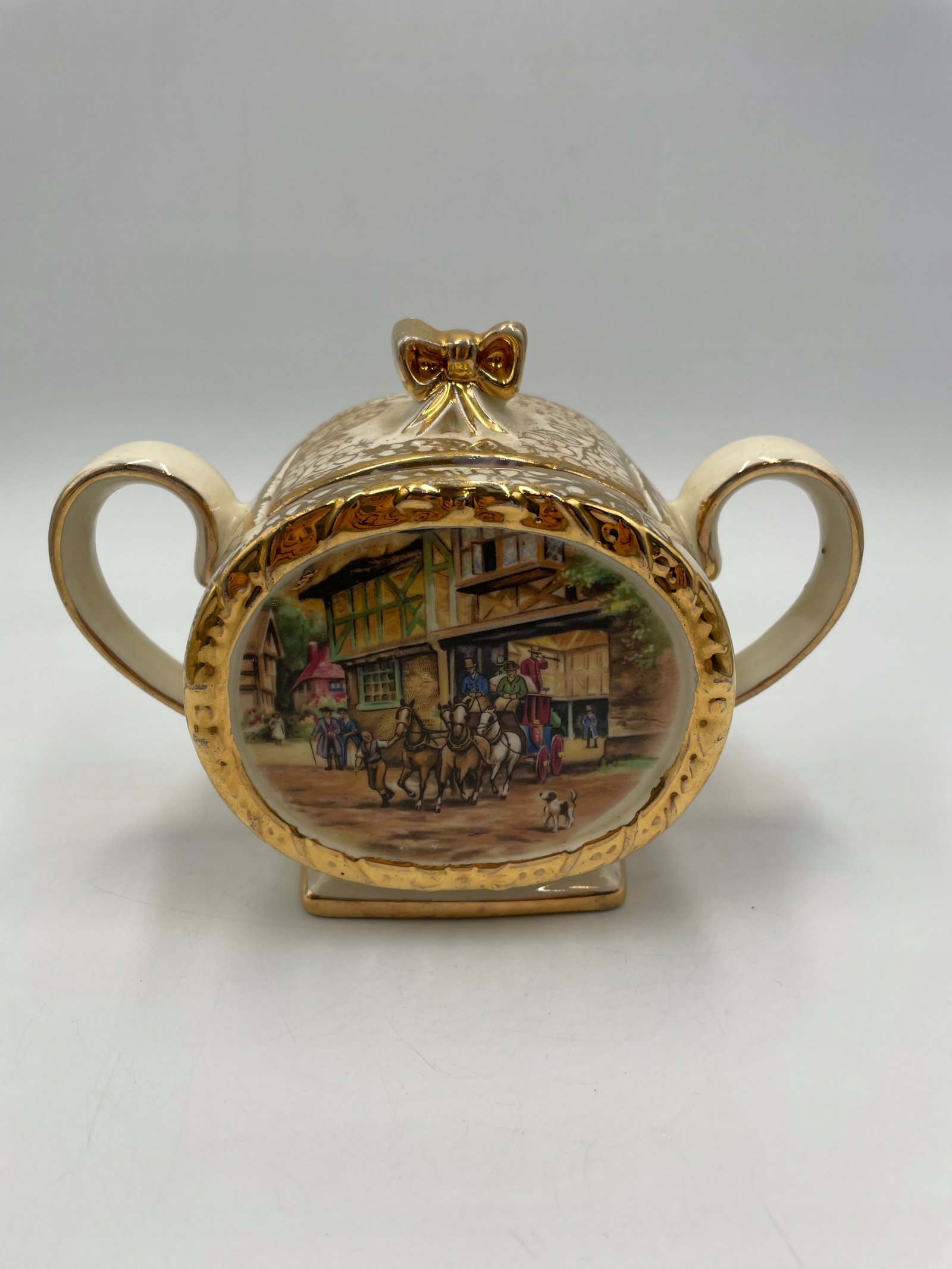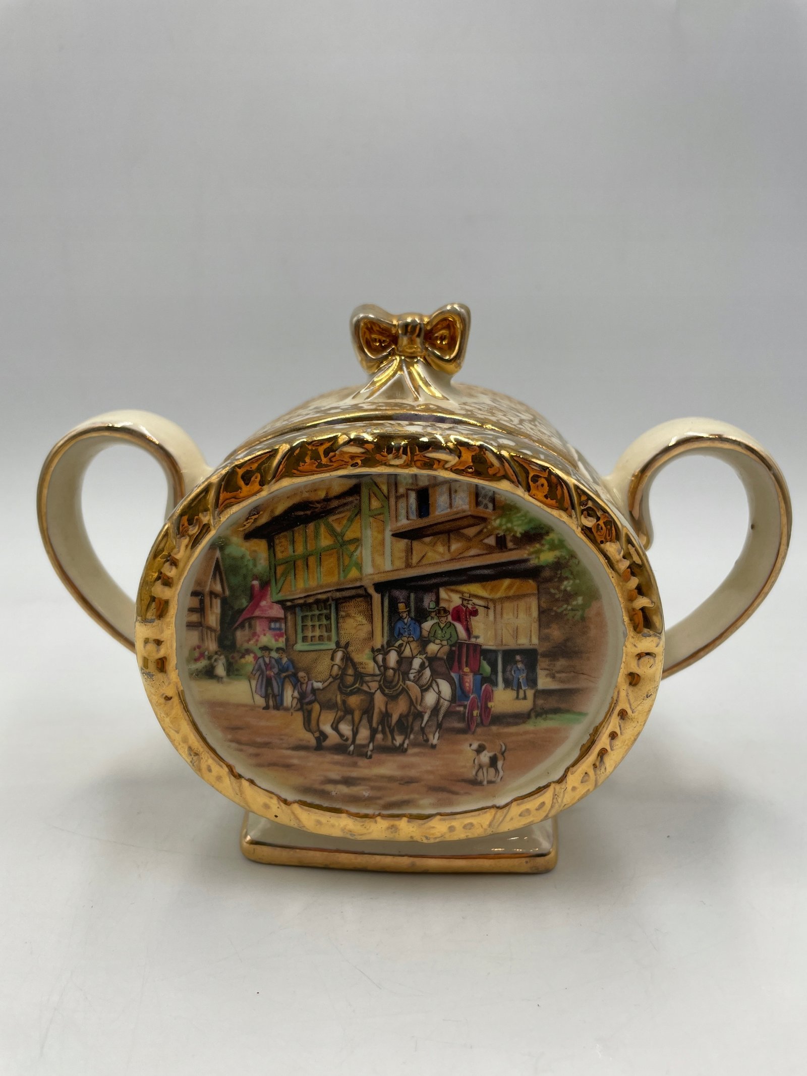 - Zdobienie: Ręcznie malowana scenka przedstawiająca powóz konny przed zabytkowym budynkiem
