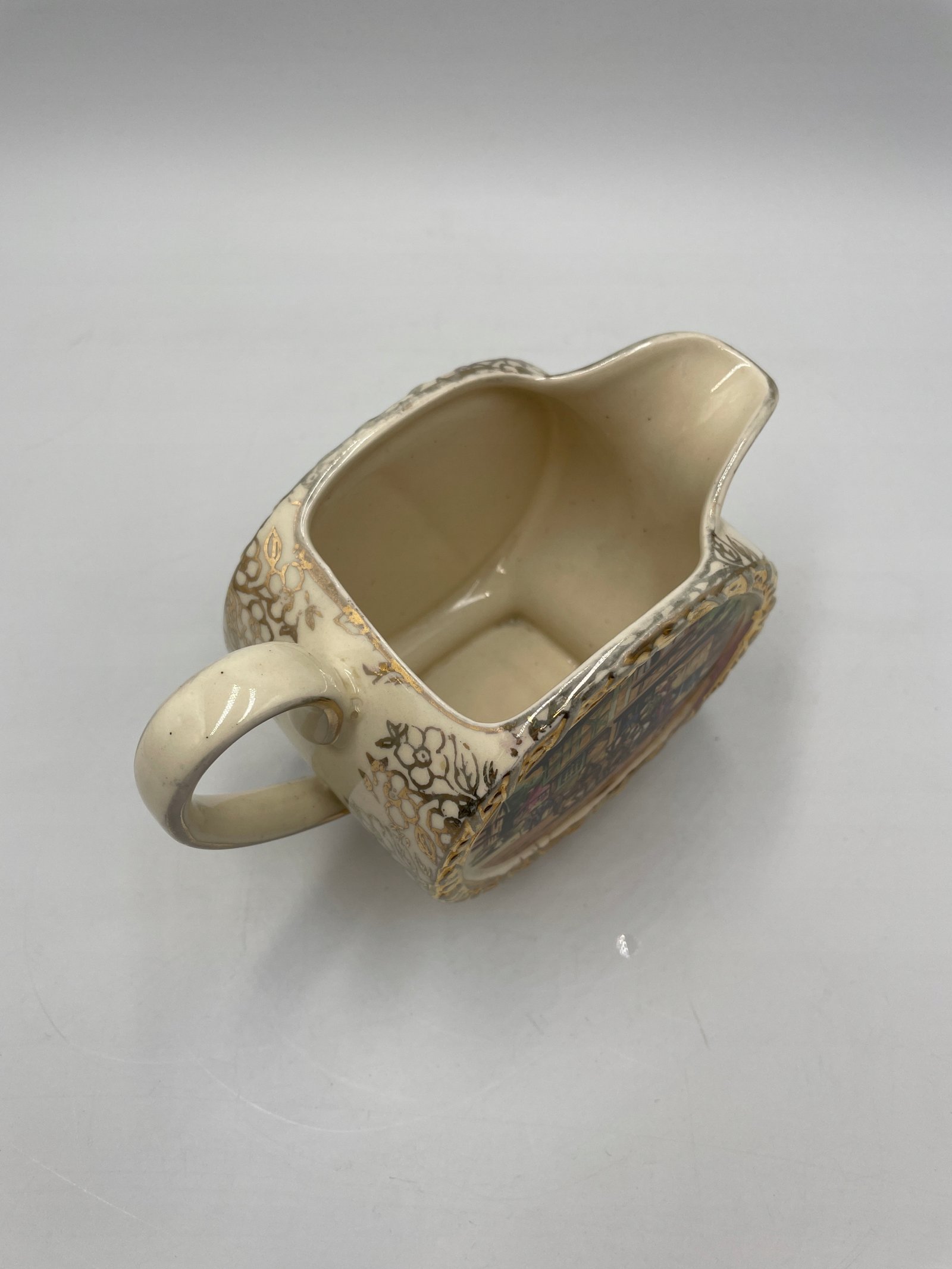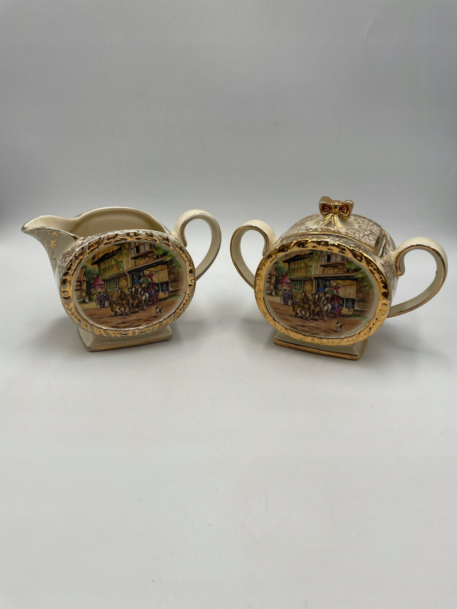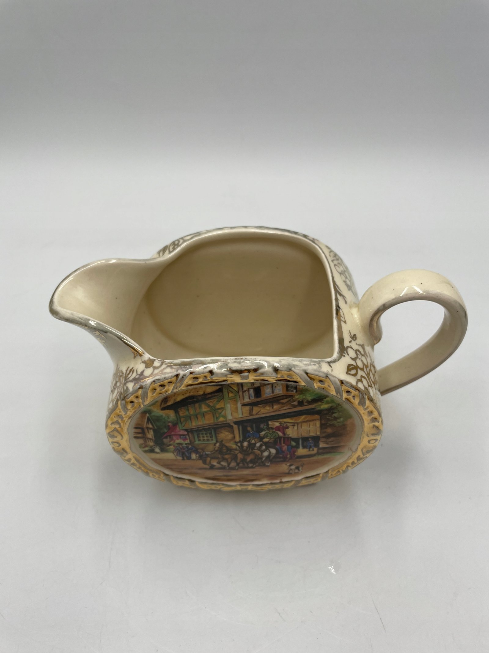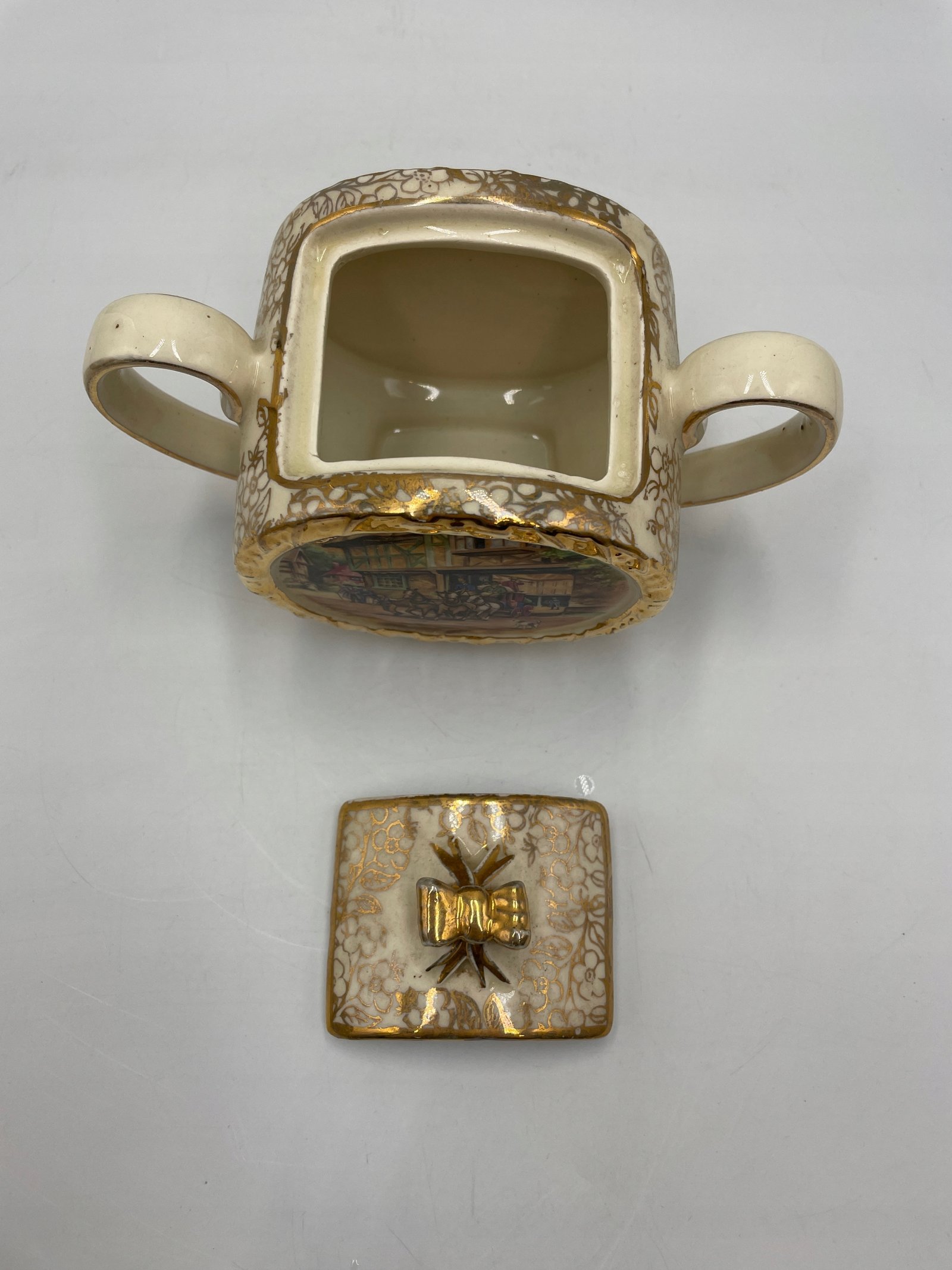 - Zdobienie: Ręcznie malowana scenka przedstawiająca powóz konny przed zabytkowym budynkiem