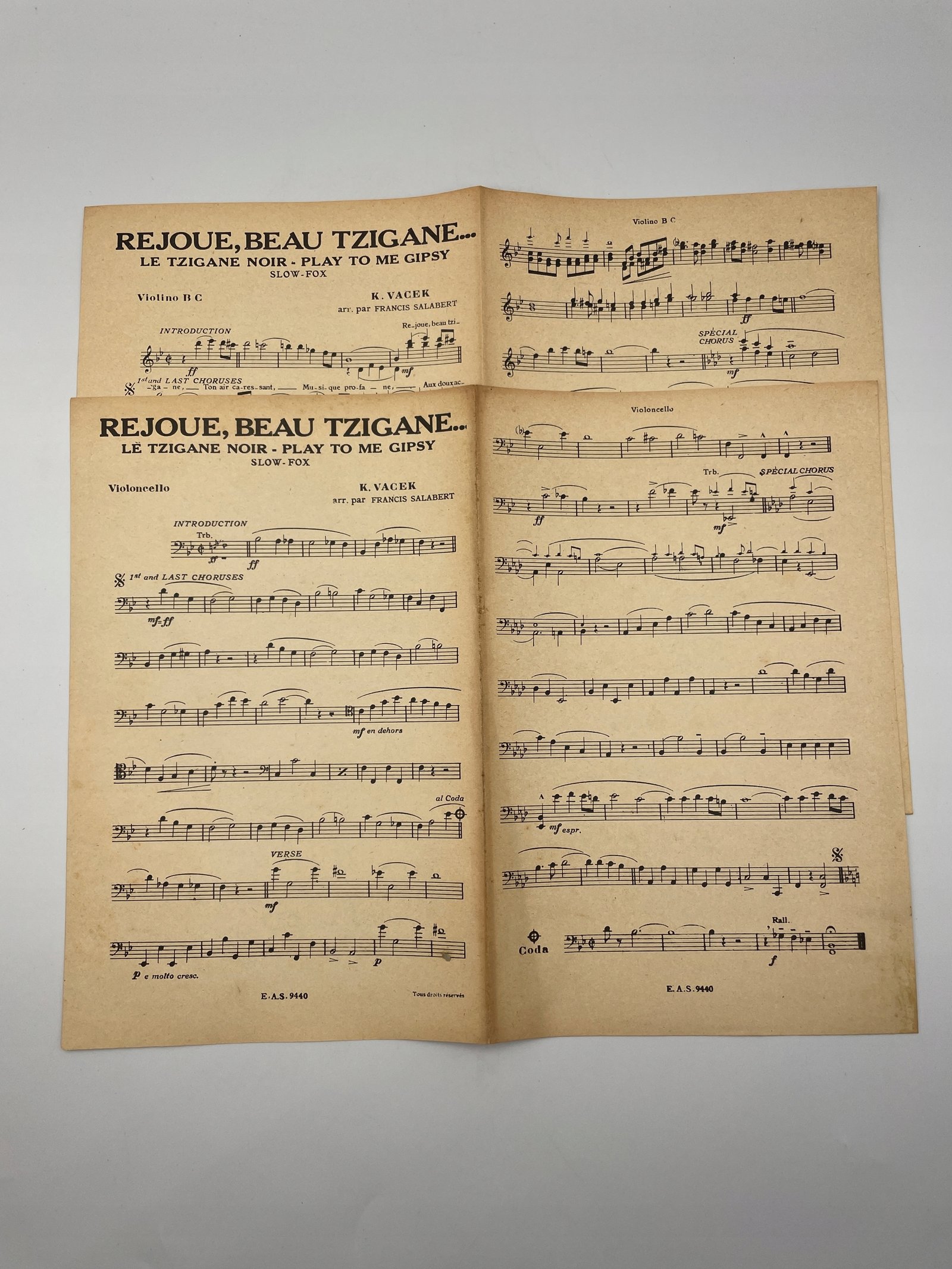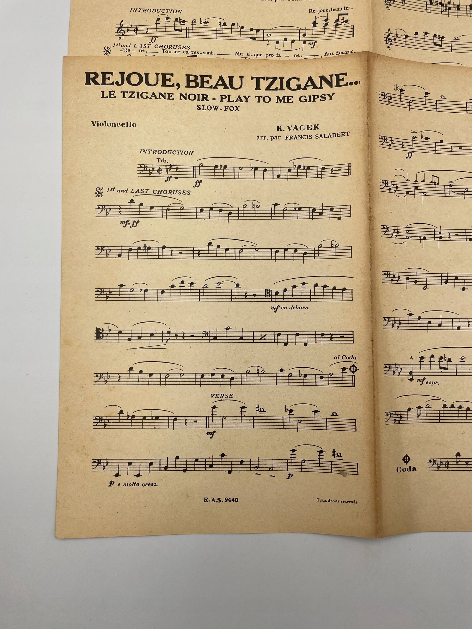 Oryginalne wydanie utworu „Rejoue Beau Tzigane (Le Tzigane Noir – Play to Me Gipsy)” autorstwa K. Vacka, z aranżacją Francisa Salaberta. To wolny fokstrot o nostalgicznej i tanecznej melodii, typowej dla francuskiej muzyki rozrywkowej lat międzywojennych.