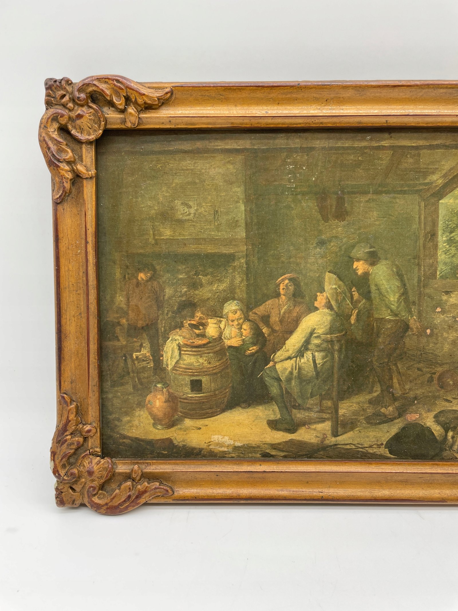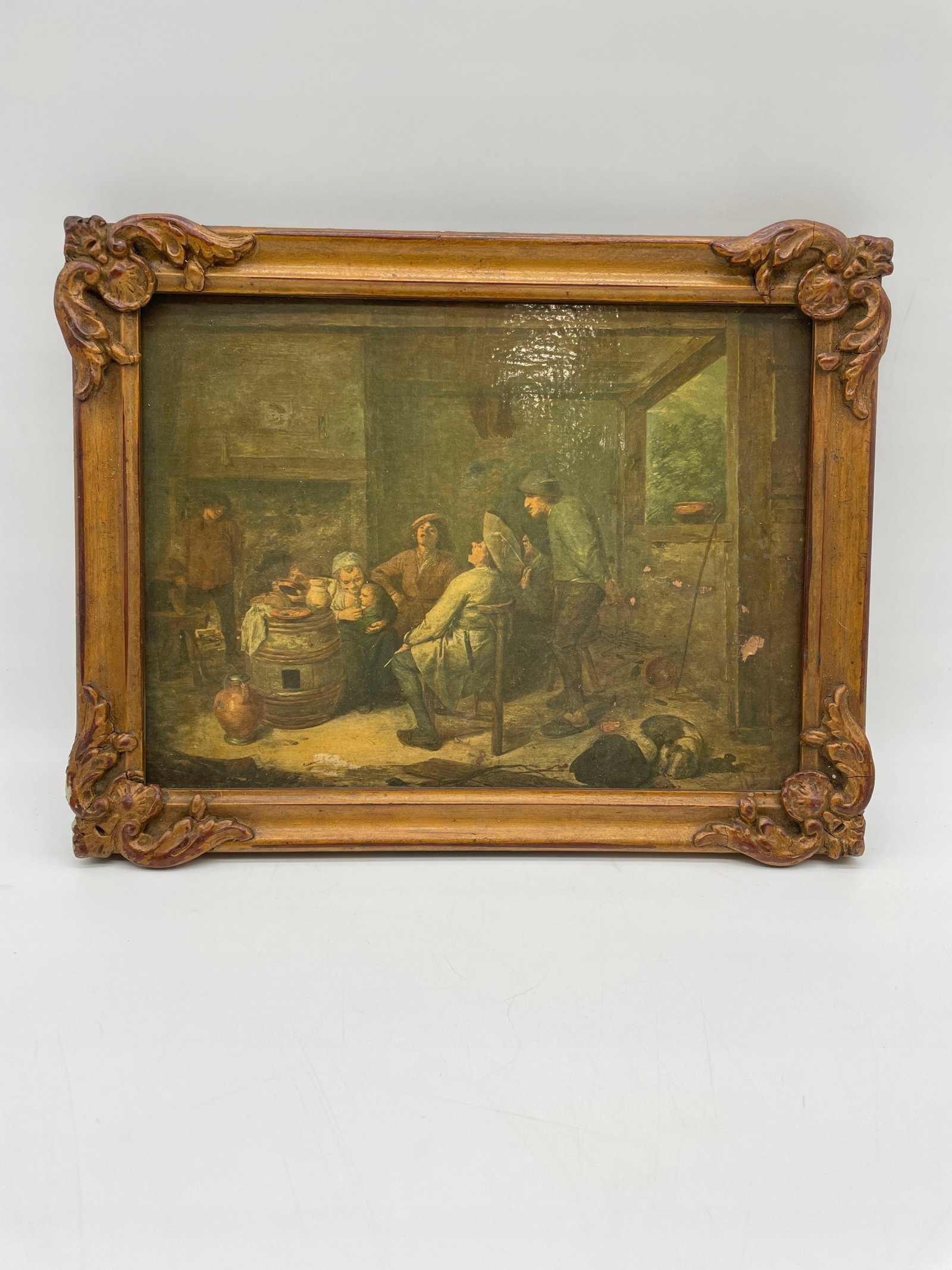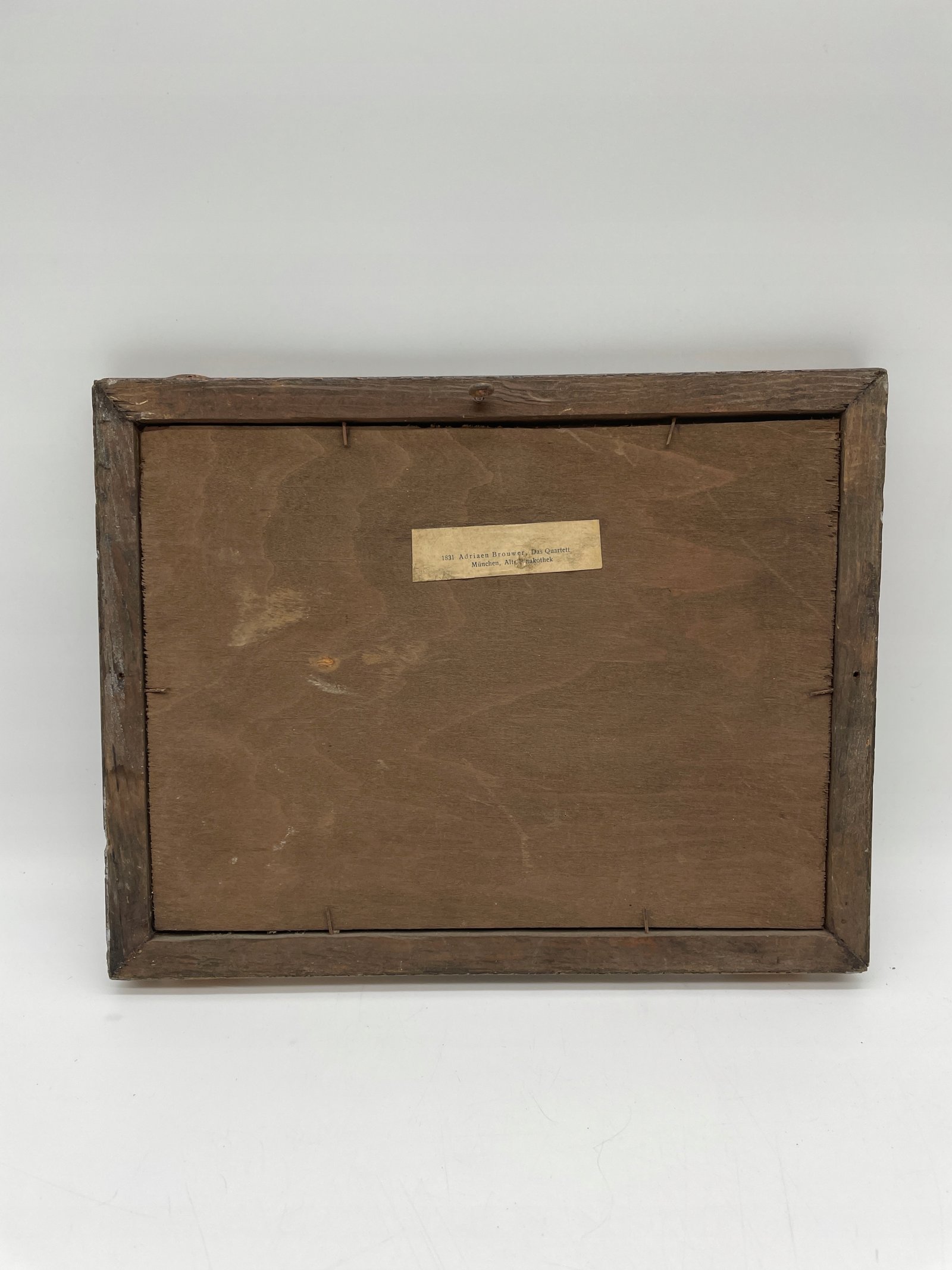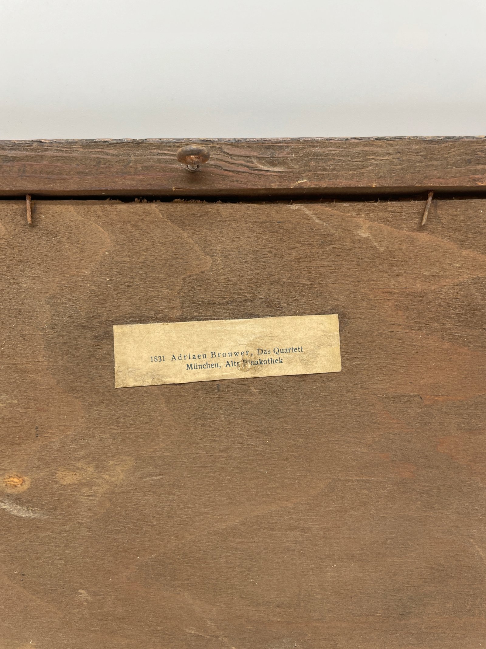 Reprodukcja obrazu „Das Quartett” autorstwa Adriaena Brouwera, według wersji z 1831 roku przechowywanej w Alte Pinakothek w Monachium. Obraz oprawiony jest w ozdobną, stylizowaną ramę z drewna. Widoczne ślady upływu czasu i uszkodzenia powierzchni (widoczne na zdjęciach). Wymiary całkowite z ramą: 28 cm x 21,5 cm.