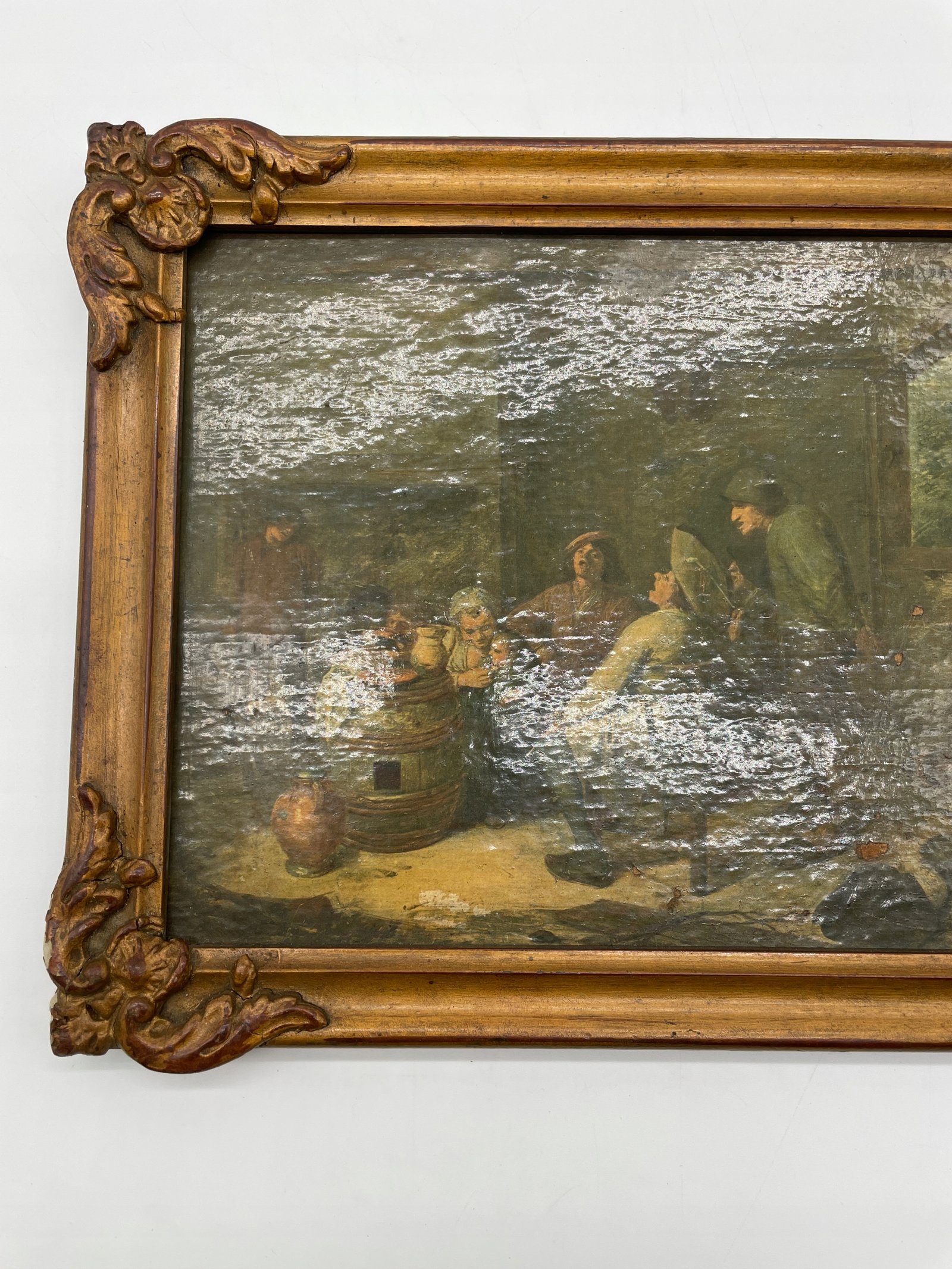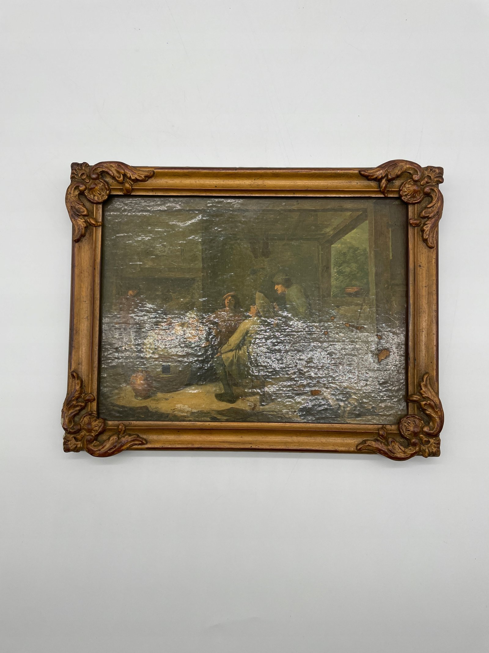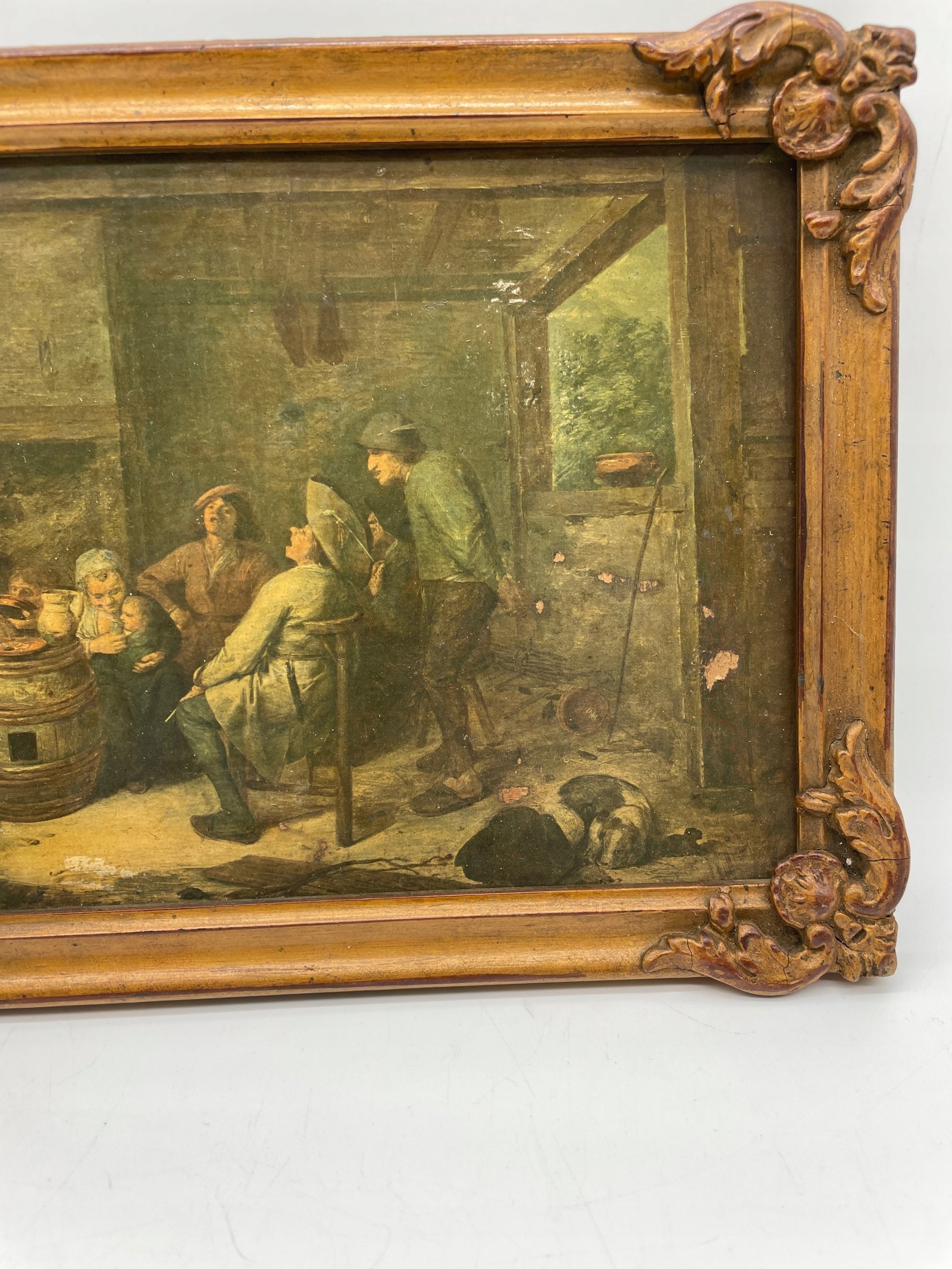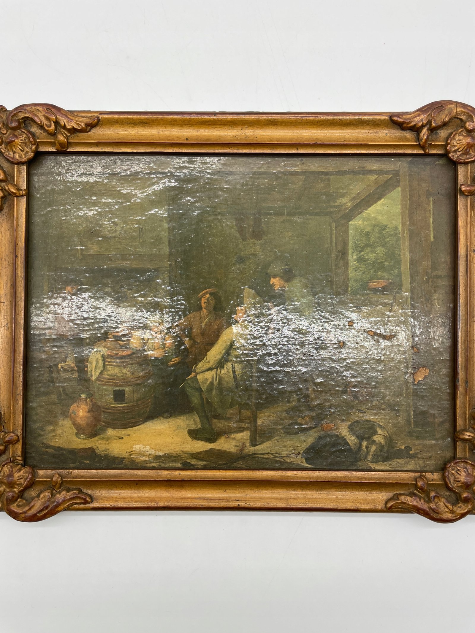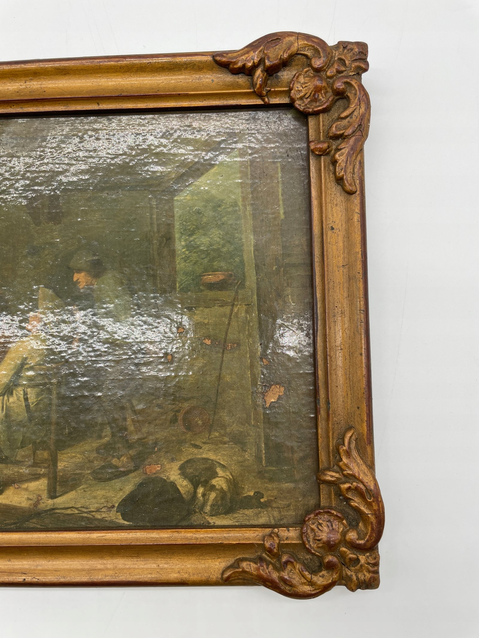 Reprodukcja obrazu „Das Quartett” autorstwa Adriaena Brouwera, według wersji z 1831 roku przechowywanej w Alte Pinakothek w Monachium. Obraz oprawiony jest w ozdobną, stylizowaną ramę z drewna. Widoczne ślady upływu czasu i uszkodzenia powierzchni (widoczne na zdjęciach). Wymiary całkowite z ramą: 28 cm x 21,5 cm.