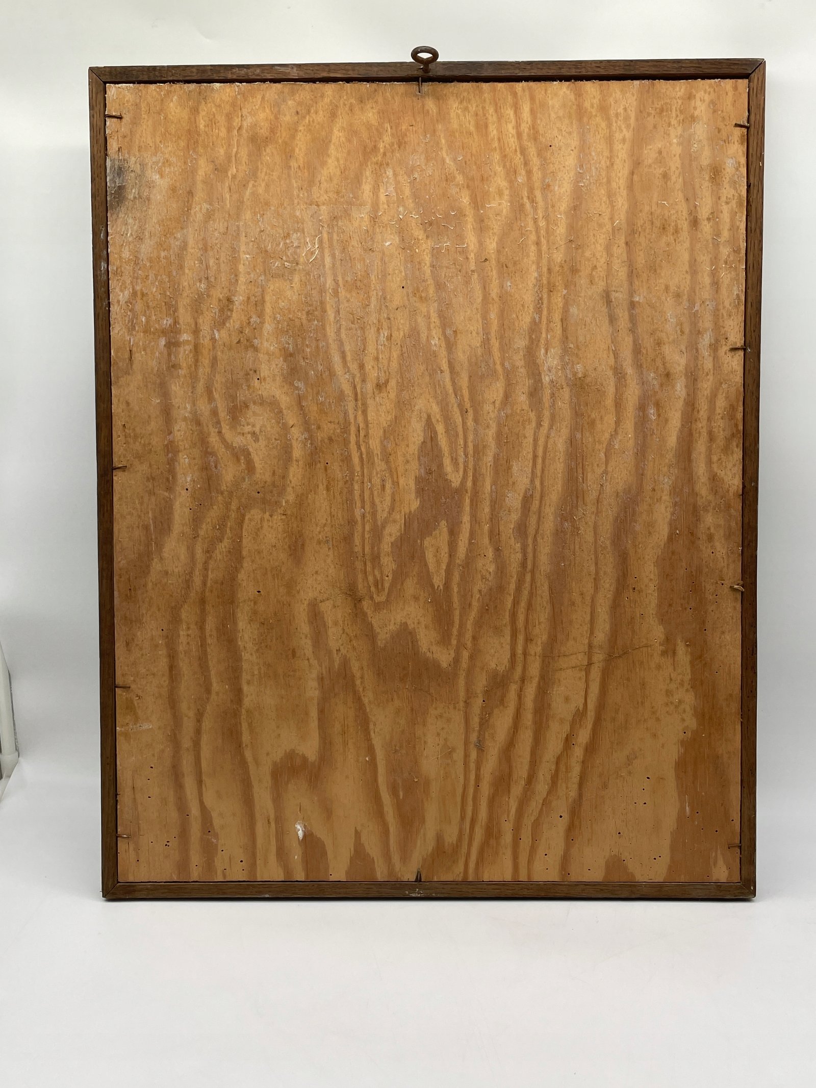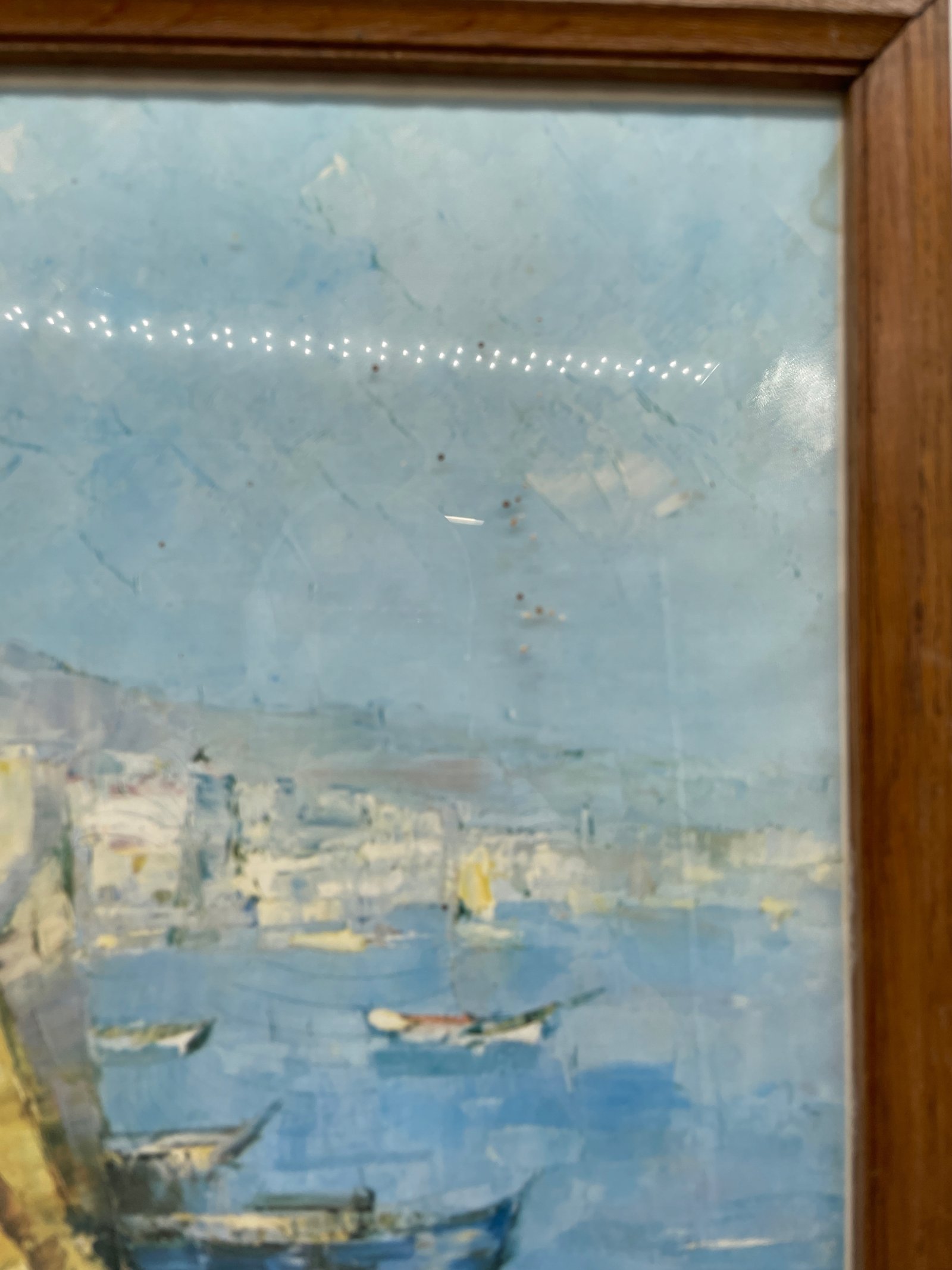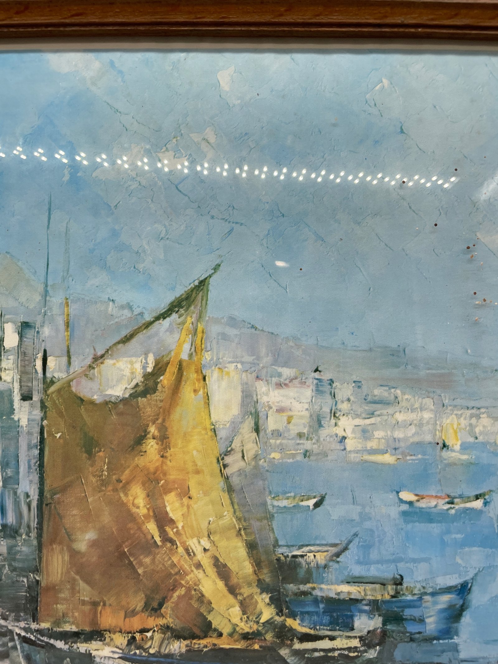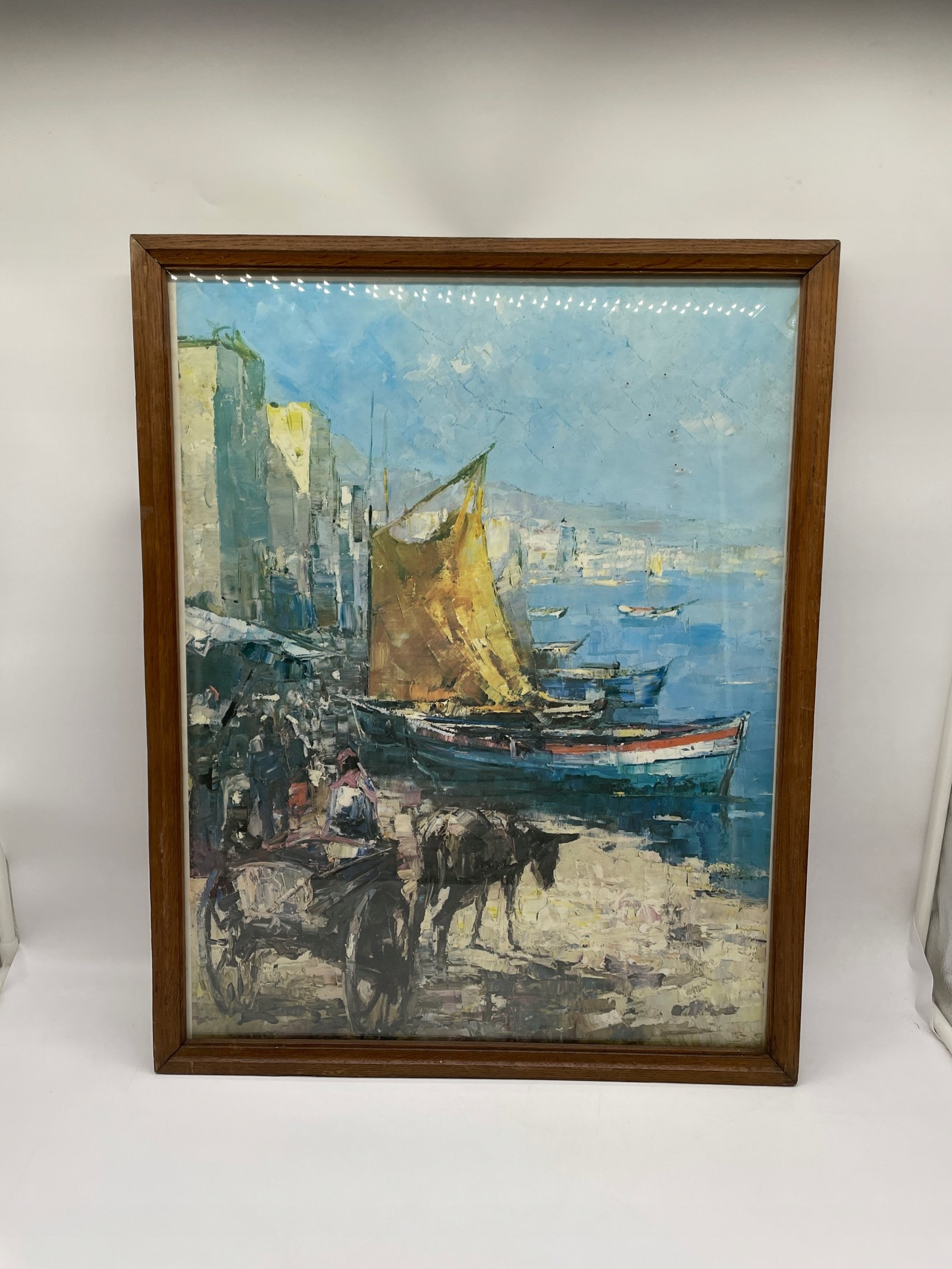 Dekoracyjna reprodukcja przedstawiająca malowniczy port z łodziami rybackimi, wozem i postaciami na nabrzeżu. Nie jest to obraz, lecz grafika drukowana pod szkłem, oprawiona w drewnianą ramę.