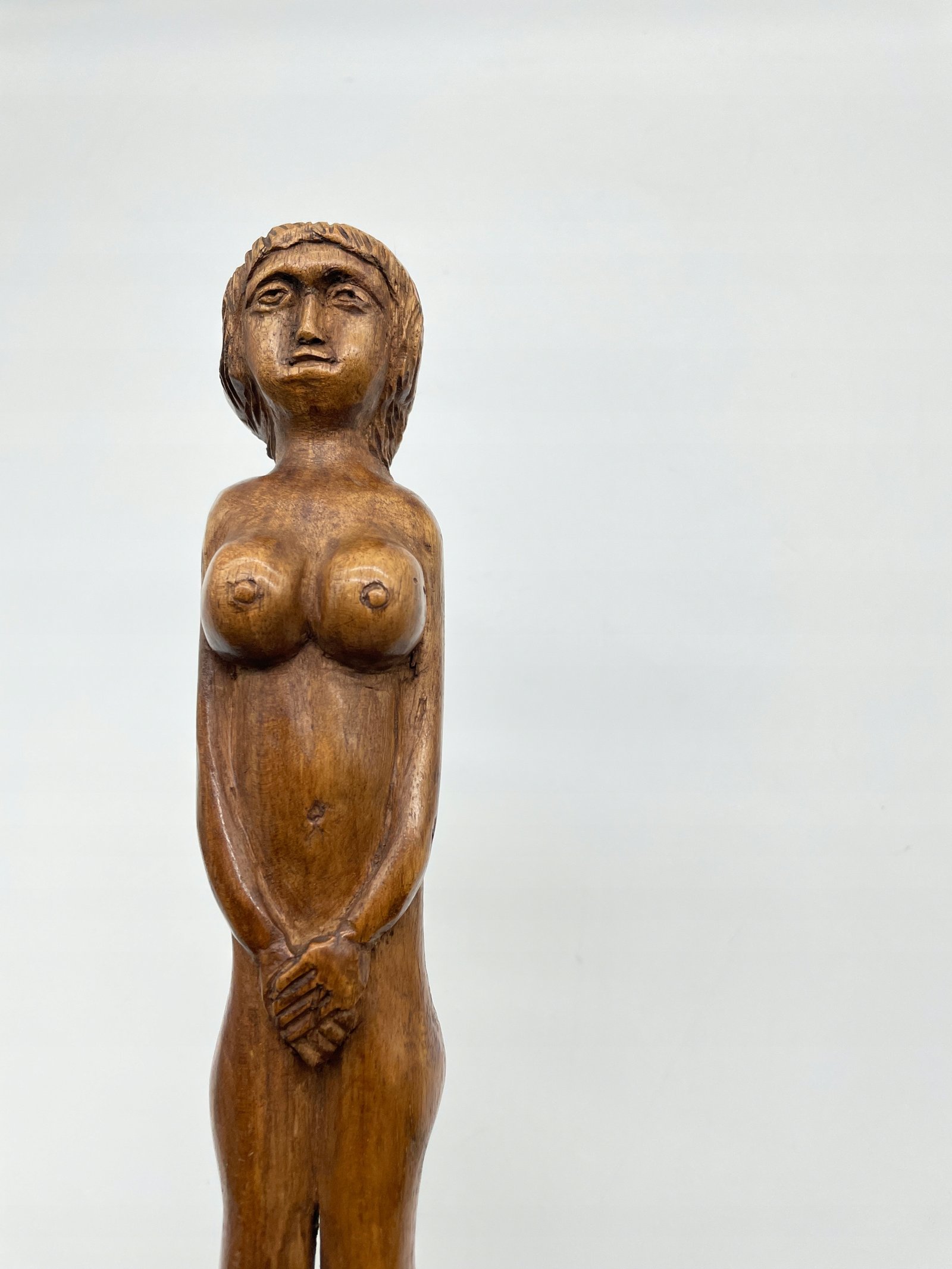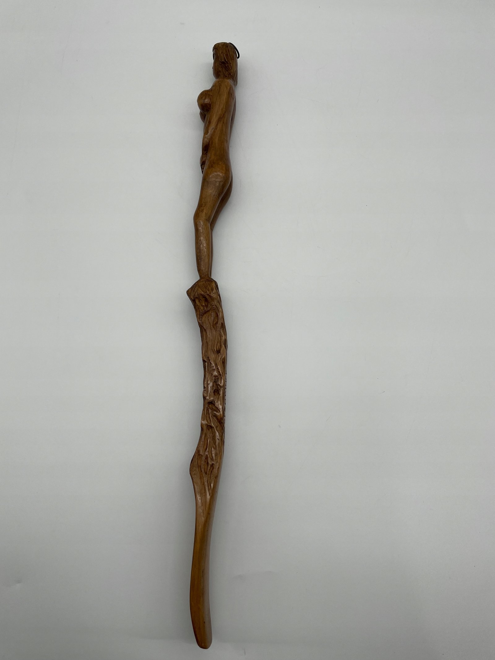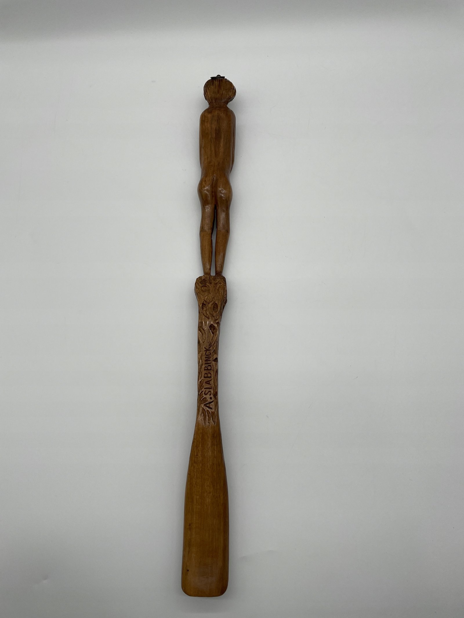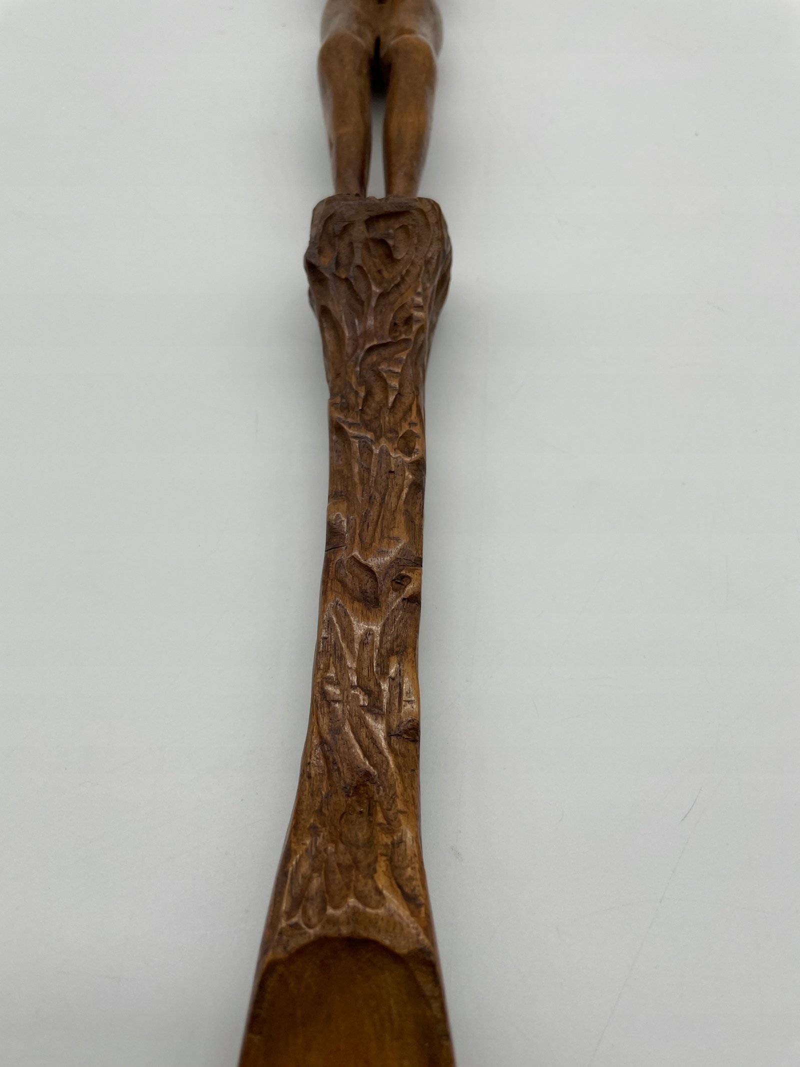 Unikatowa, ręcznie rzeźbiona łyżka do butów z drewna, ozdobiona figurą nagiej kobiety w stylu ludowym. Przedmiot o wyjątkowym charakterze, wykonany z dbałością o detale, stanowi zarówno funkcjonalny, jak i dekoracyjny element wyposażenia wnętrz.