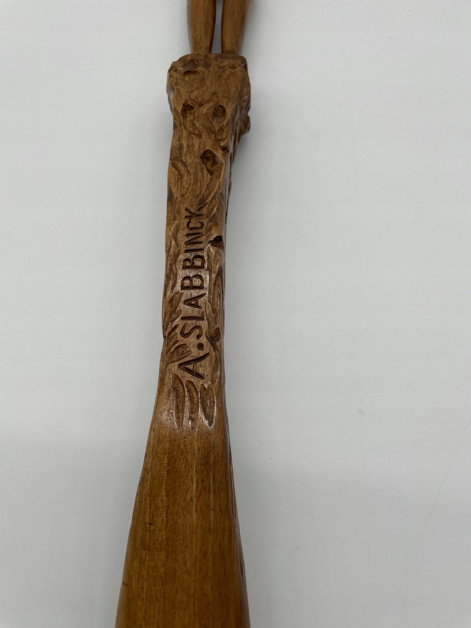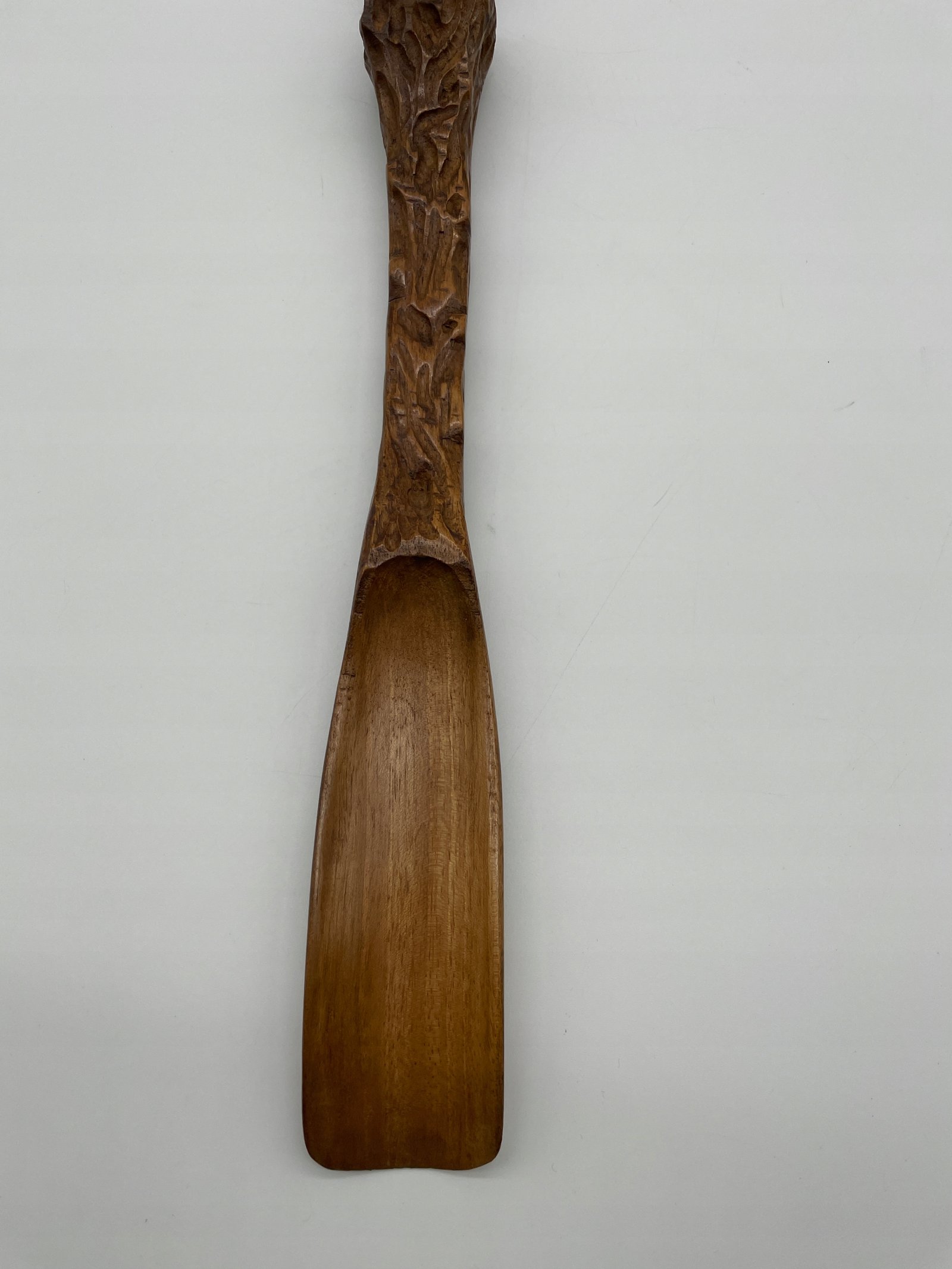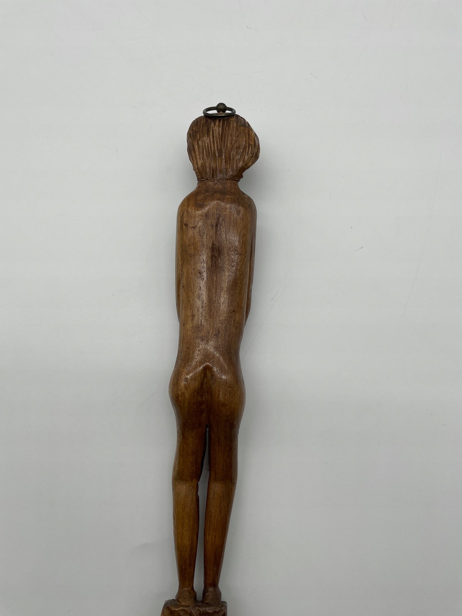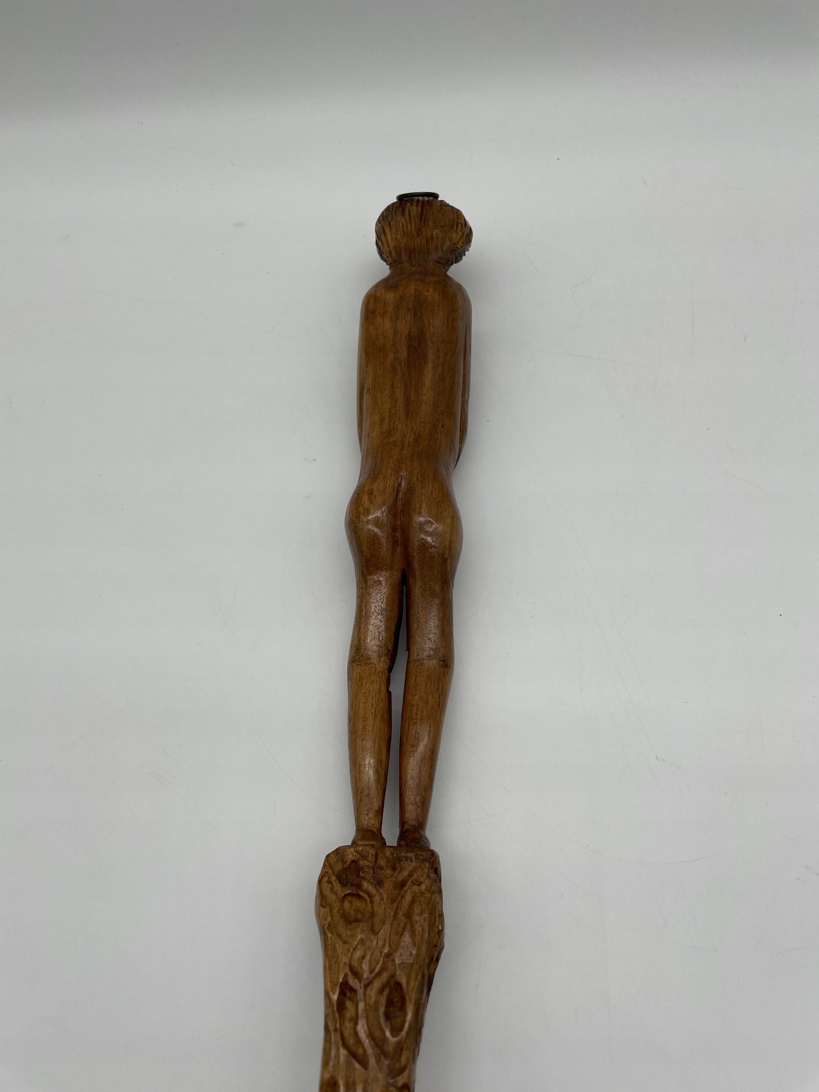 Unikatowa, ręcznie rzeźbiona łyżka do butów z drewna, ozdobiona figurą nagiej kobiety w stylu ludowym. Przedmiot o wyjątkowym charakterze, wykonany z dbałością o detale, stanowi zarówno funkcjonalny, jak i dekoracyjny element wyposażenia wnętrz.