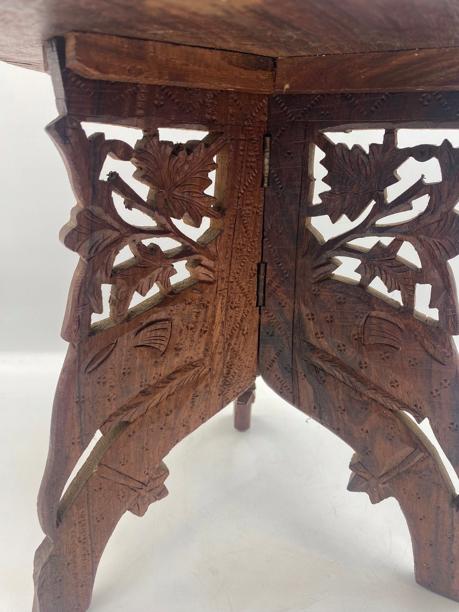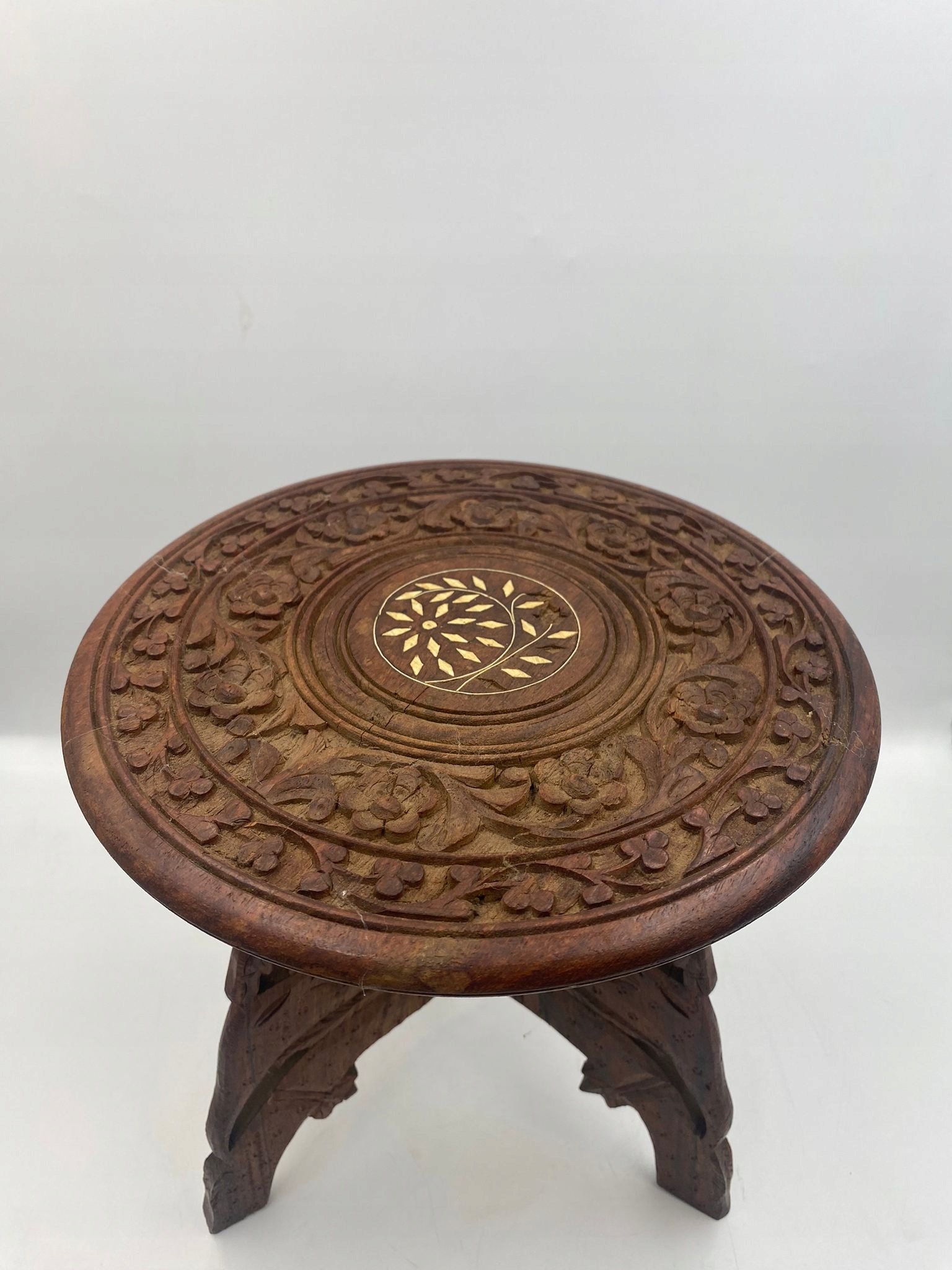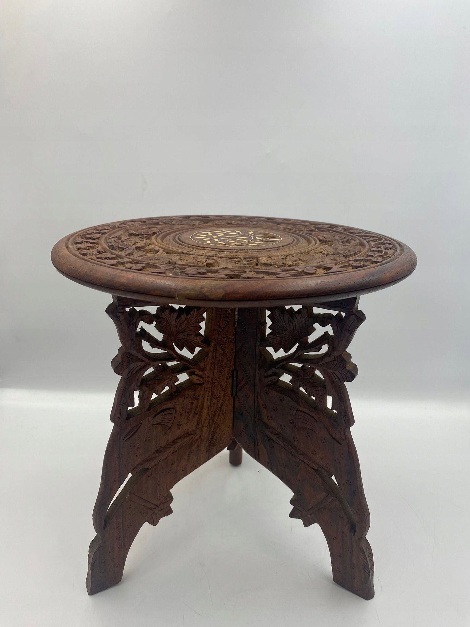 Drewniany rzeźbiony stolik z inkrustacją rozkładany Indie