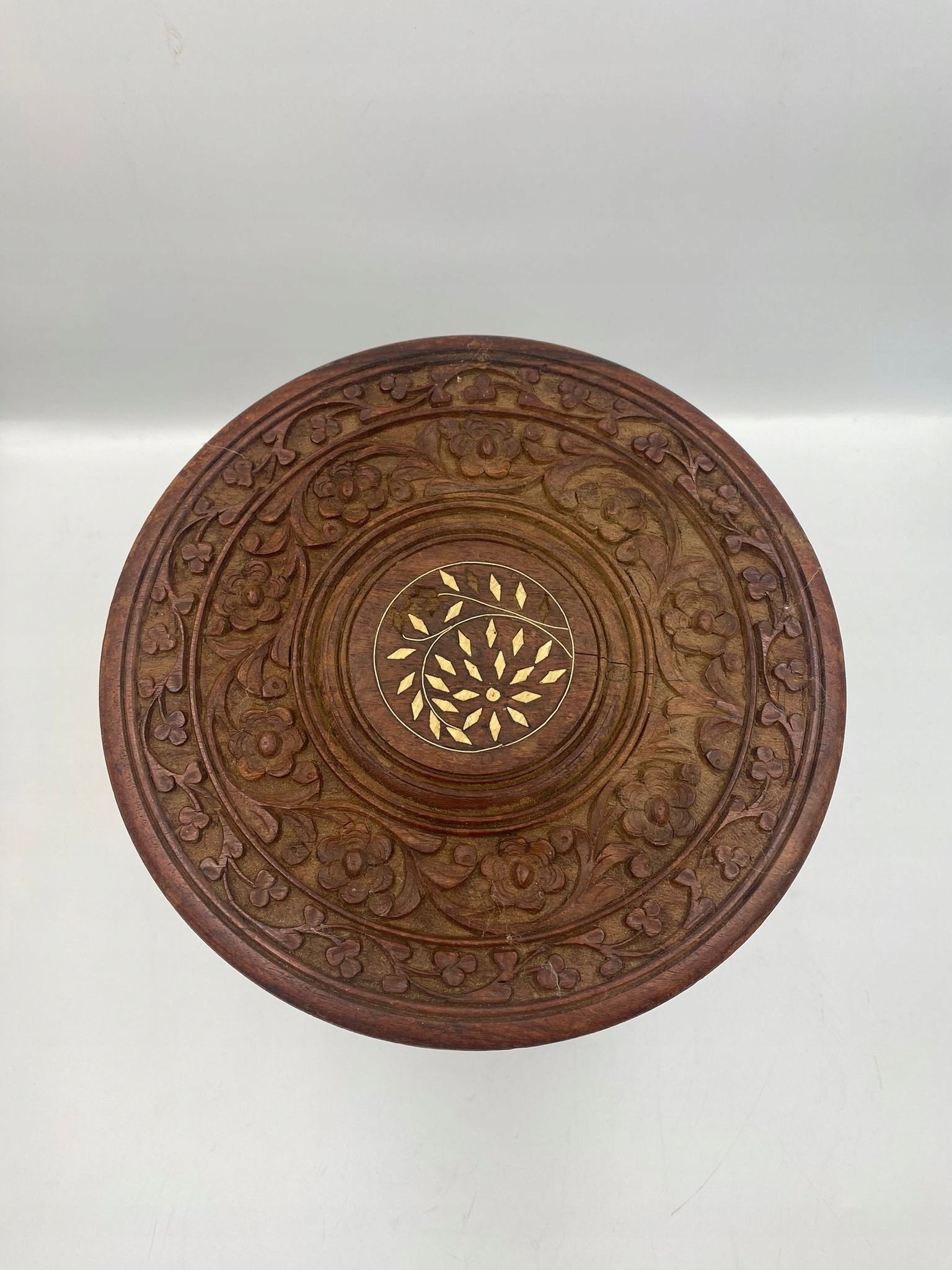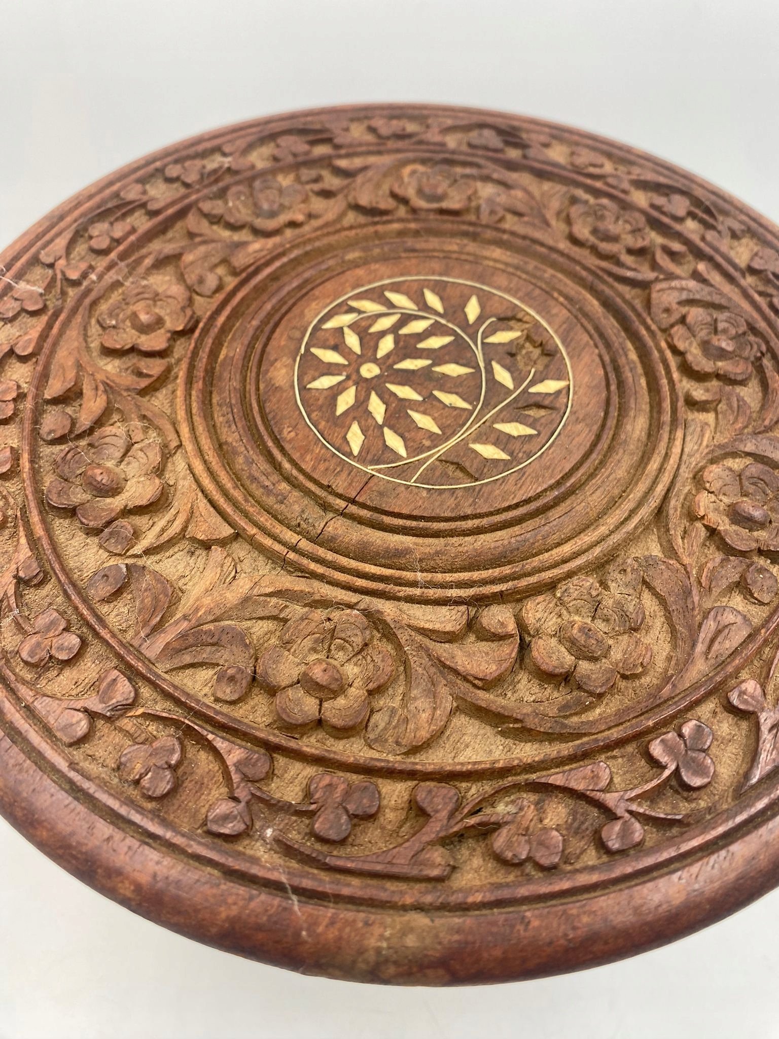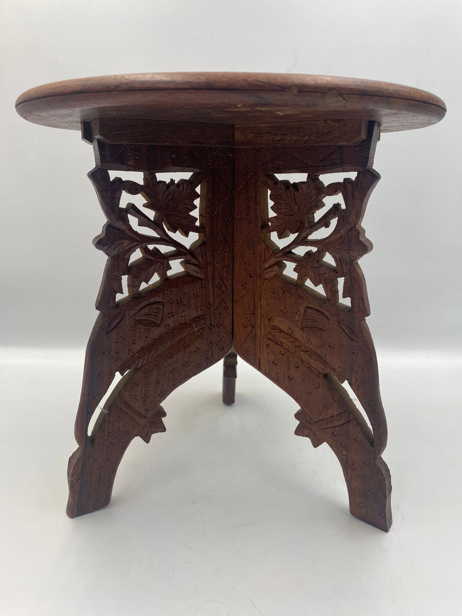 Drewniany rzeźbiony stolik z inkrustacją rozkładany Indie