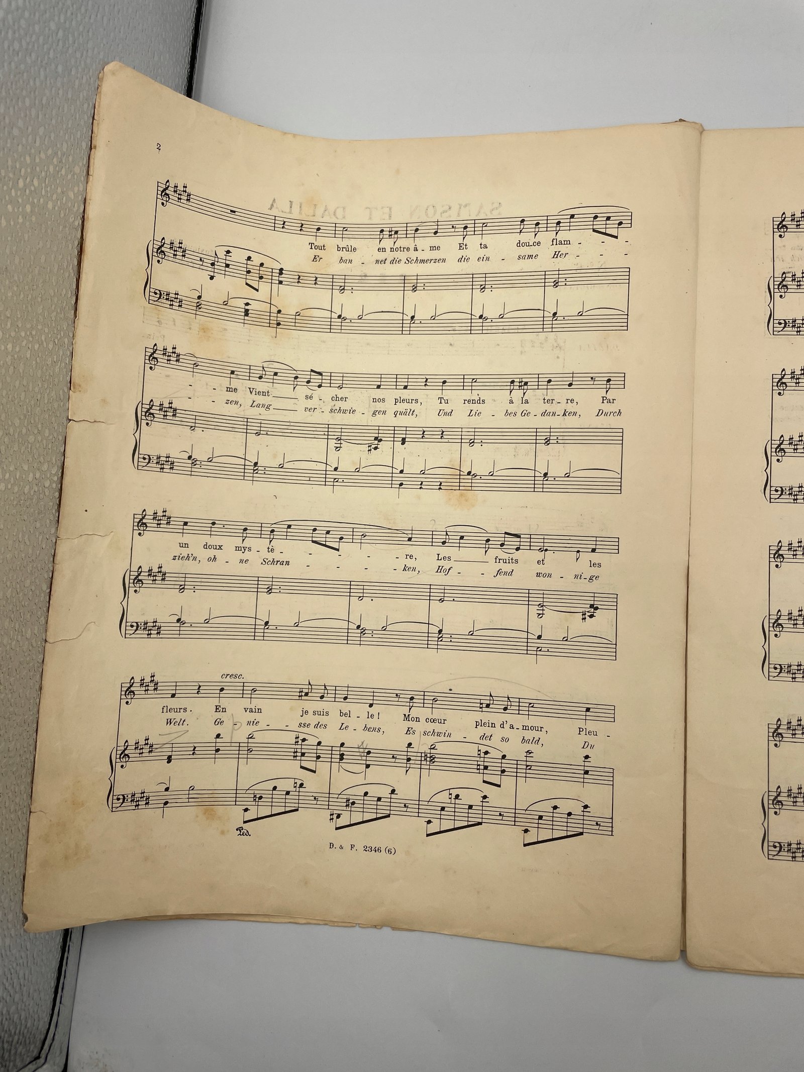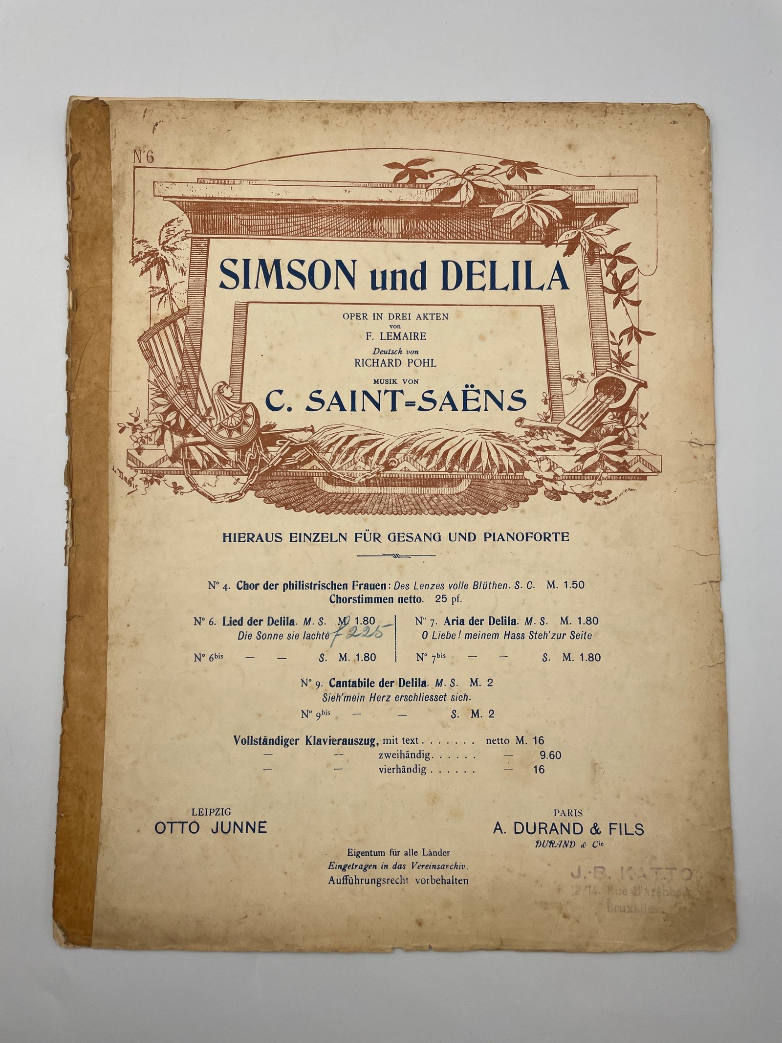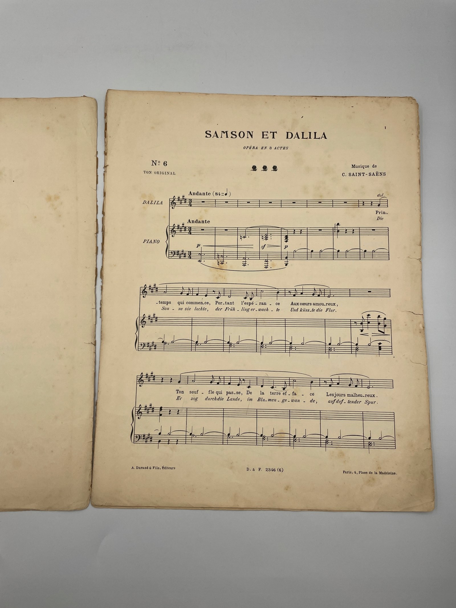 Oryginalne wydanie arii Dalili z opery „Samson i Dalila” autorstwa C. Saint-Saënsa. Jest to wokalno-instrumentalny utwór liryczny, pochodzący z jednej z najbardziej znanych oper w duchu romantyzmu, wyróżniający się piękną melodyką i emocjonalnym wyrazem. Nuty wydane przez wydawnictwa Otto Junne w Lipsku oraz A. Durand & Fils w Paryżu. Okładkę zdobi rama z motywami roślinnymi, harfą i wieńcem laurowym, typowa dla stylu akademickiego.