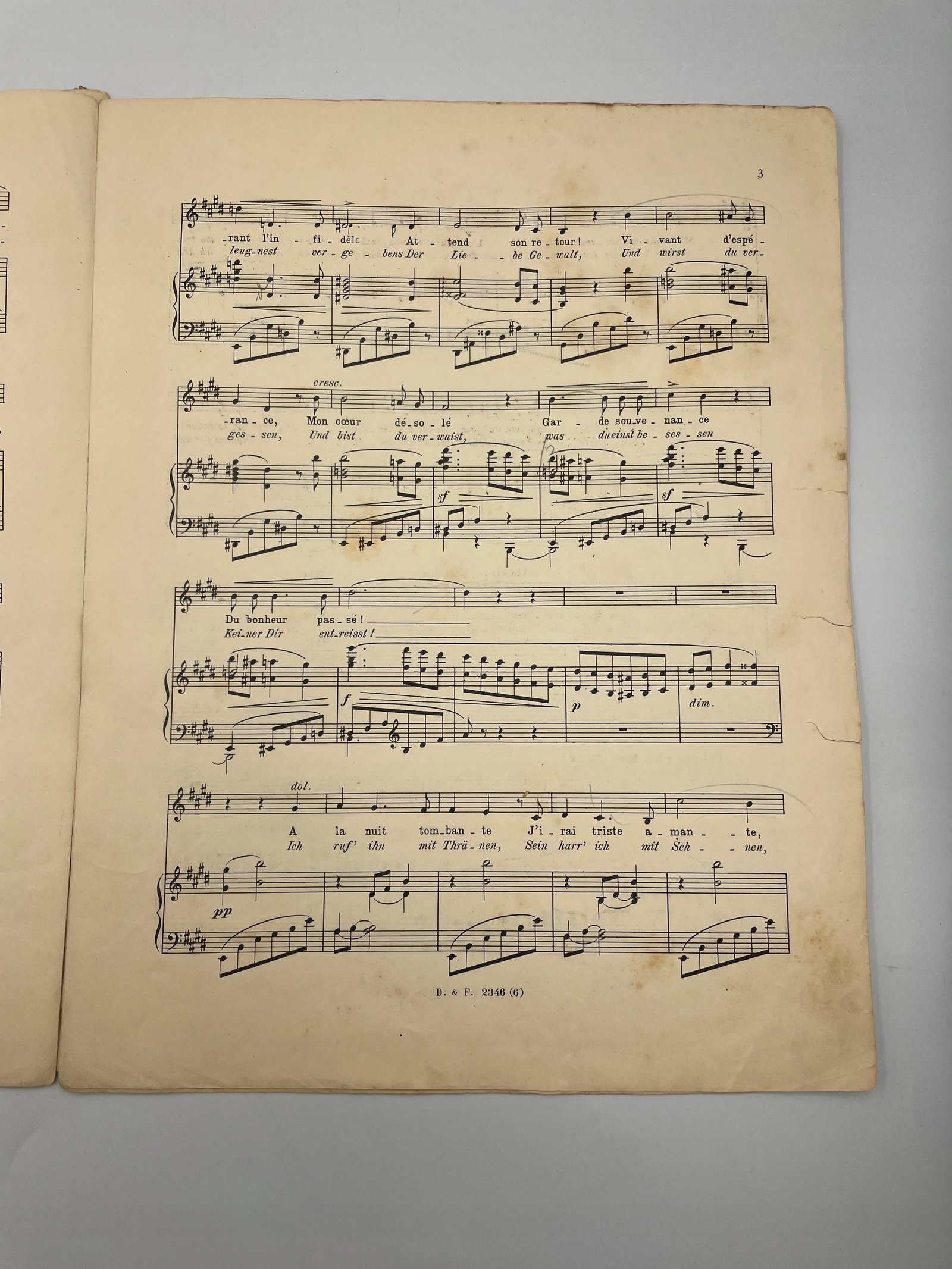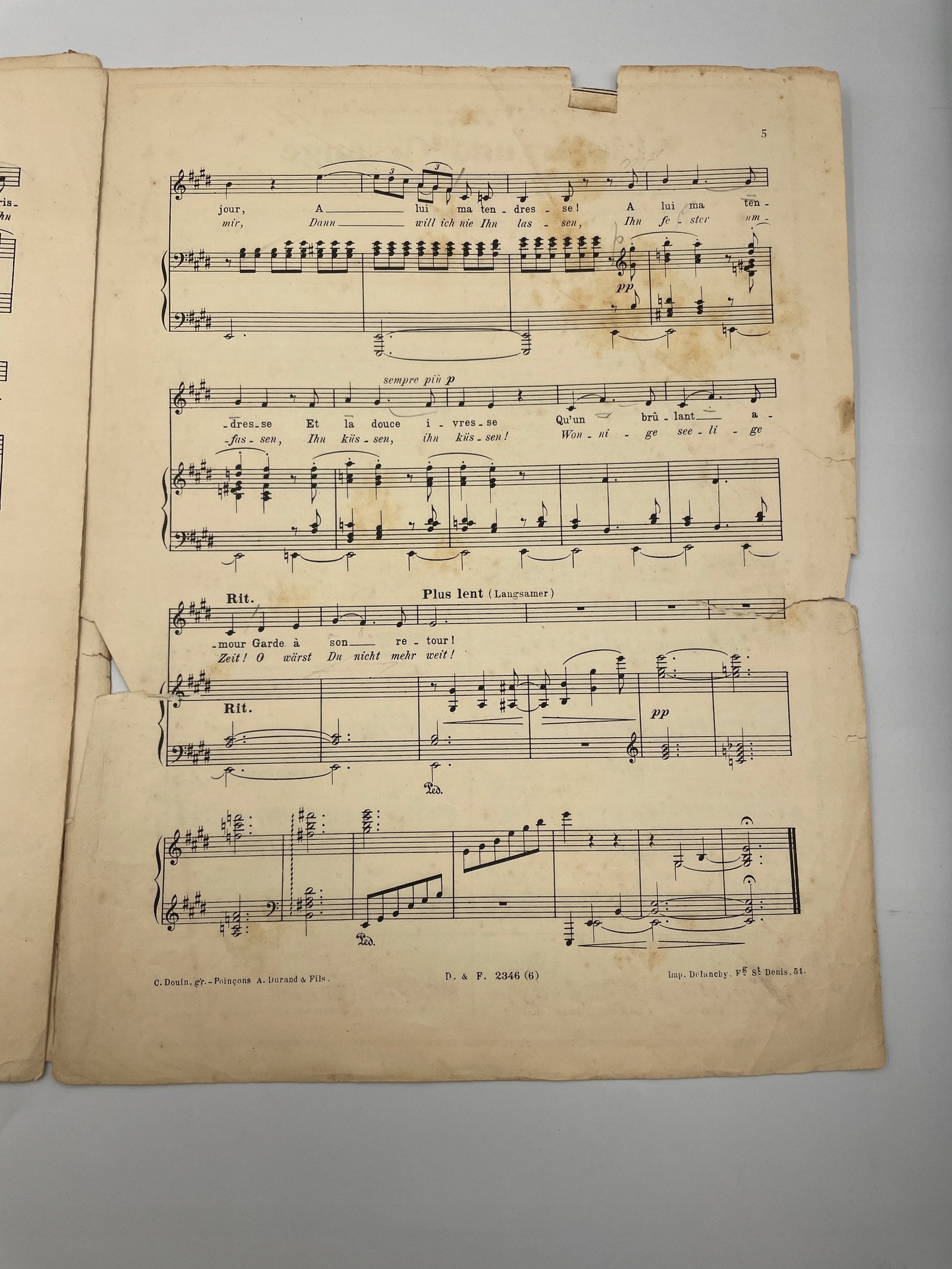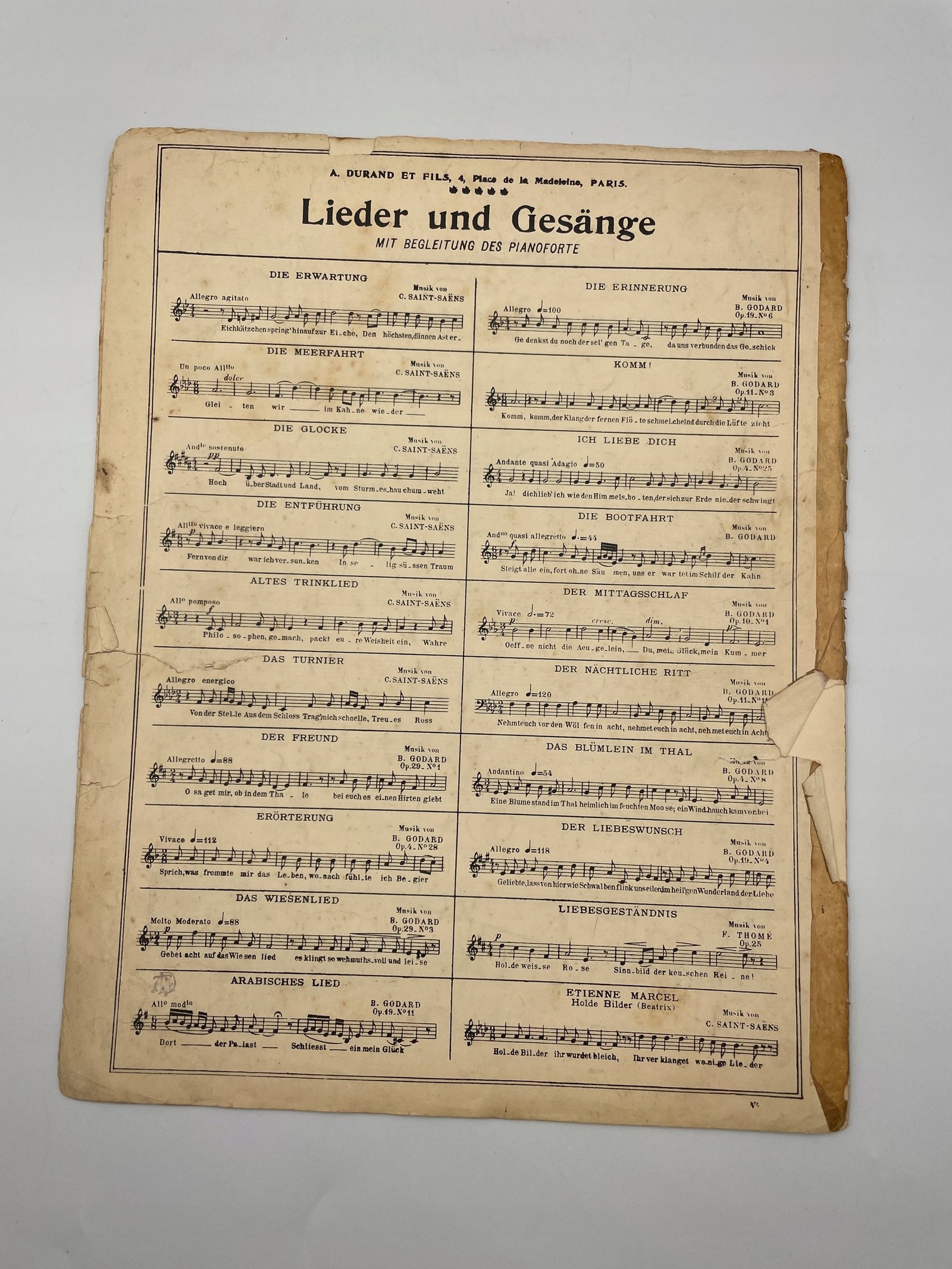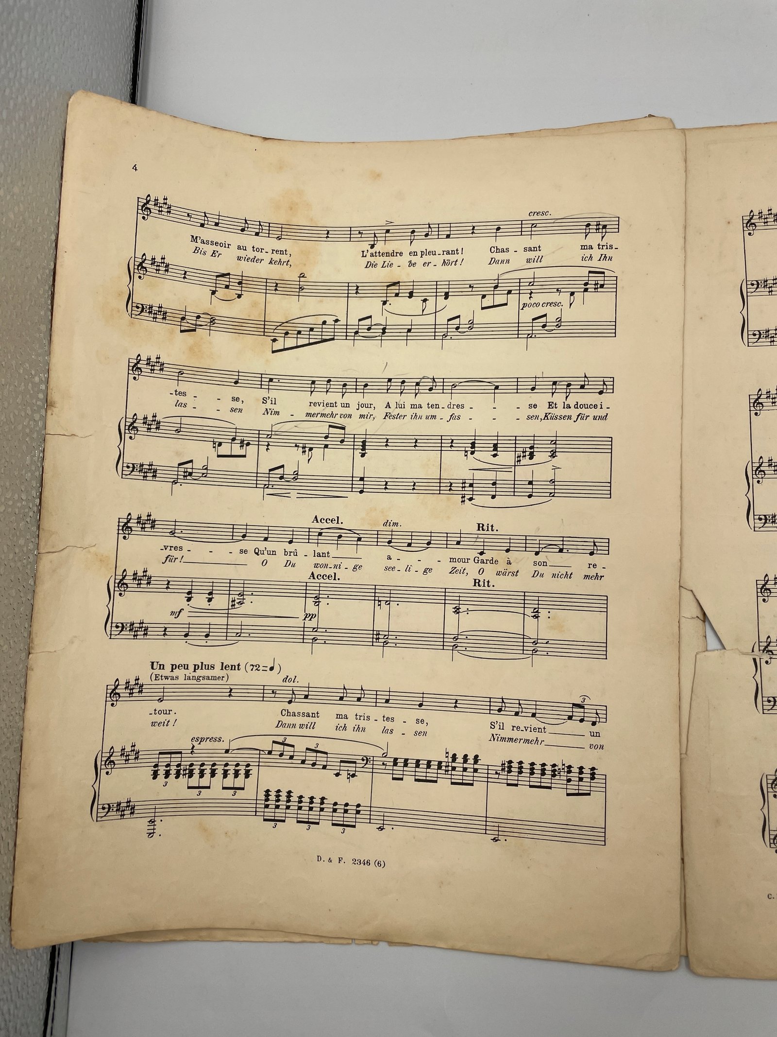Oryginalne wydanie arii Dalili z opery „Samson i Dalila” autorstwa C. Saint-Saënsa. Jest to wokalno-instrumentalny utwór liryczny, pochodzący z jednej z najbardziej znanych oper w duchu romantyzmu, wyróżniający się piękną melodyką i emocjonalnym wyrazem. Nuty wydane przez wydawnictwa Otto Junne w Lipsku oraz A. Durand & Fils w Paryżu. Okładkę zdobi rama z motywami roślinnymi, harfą i wieńcem laurowym, typowa dla stylu akademickiego.