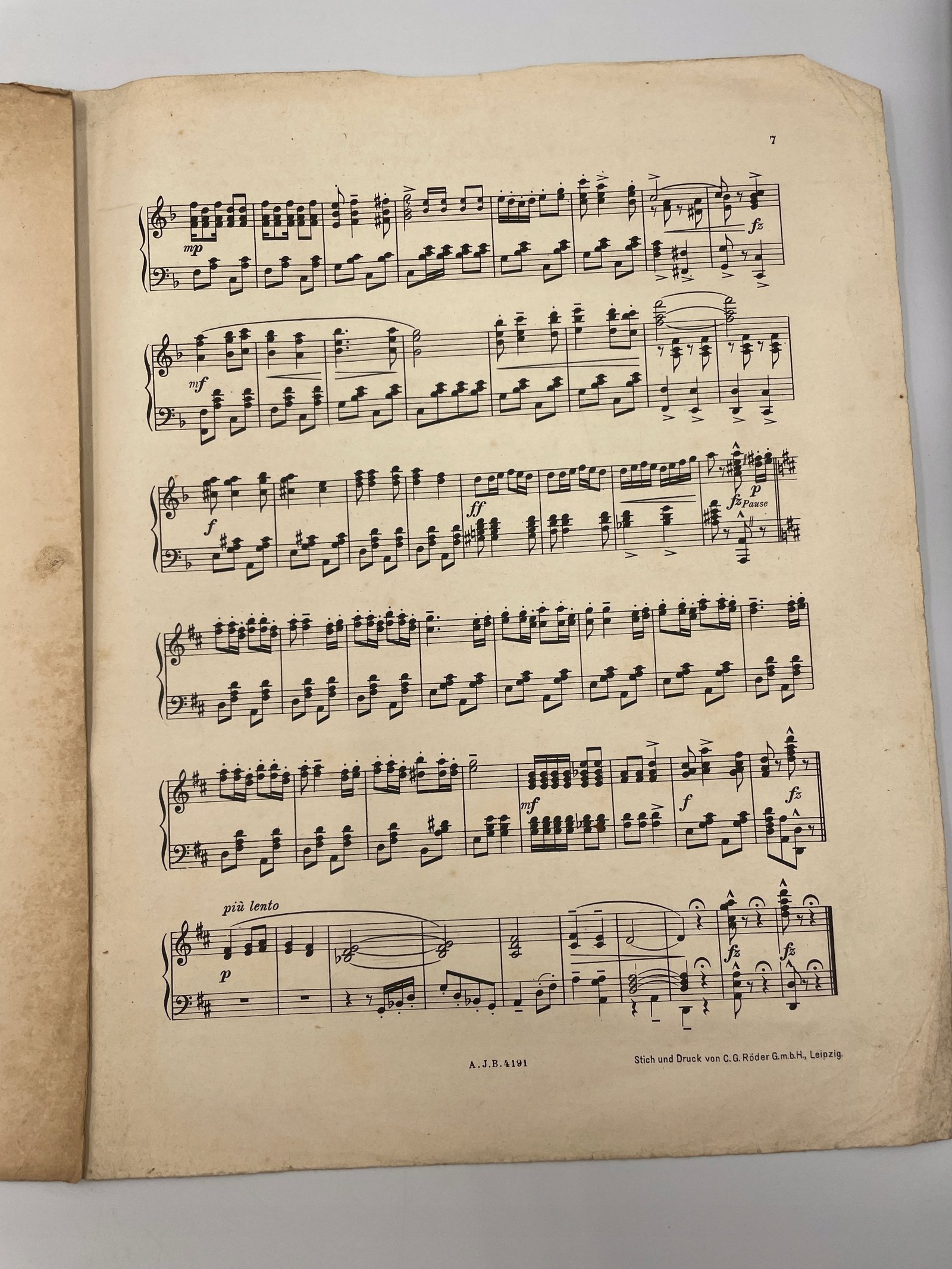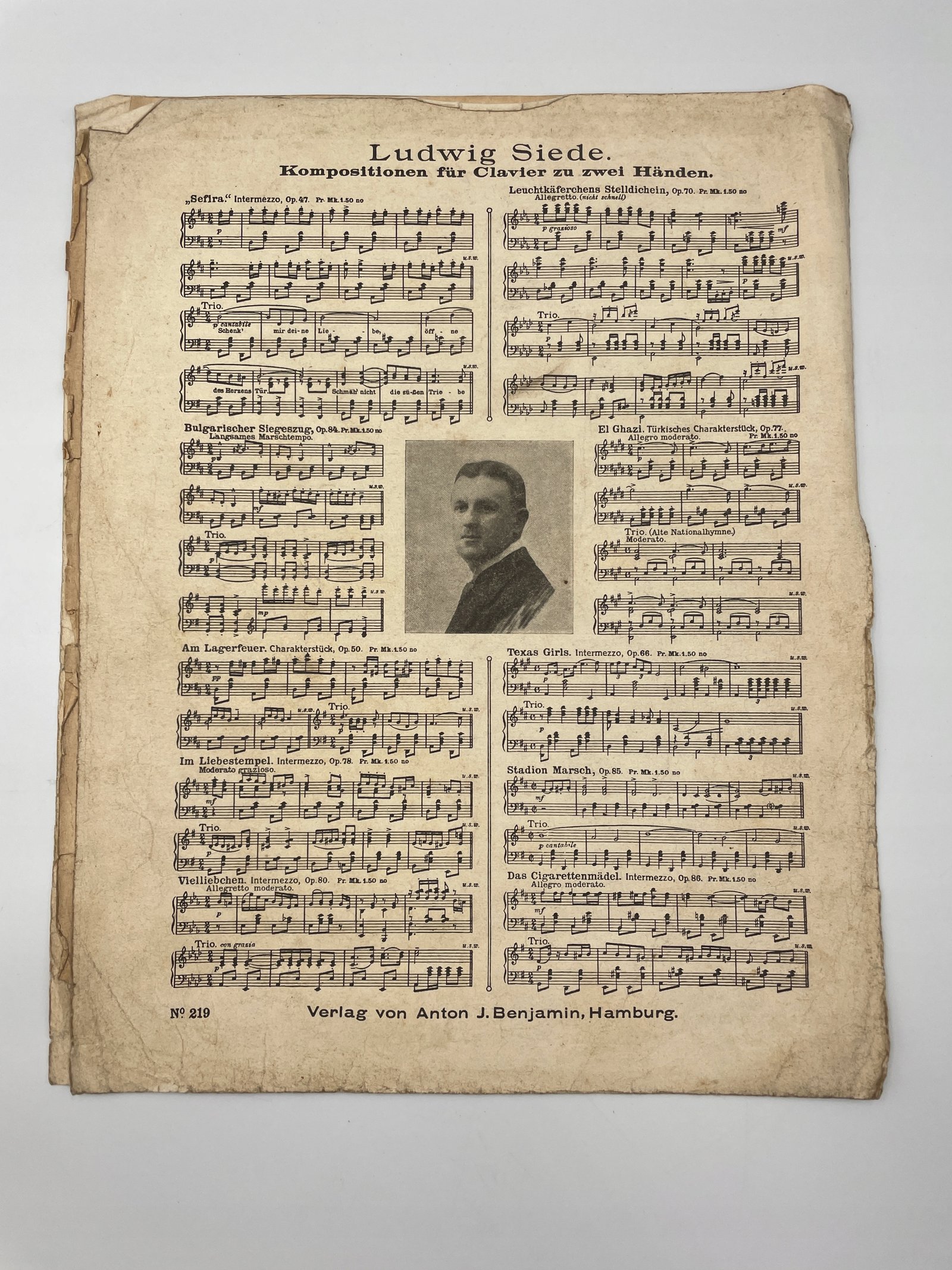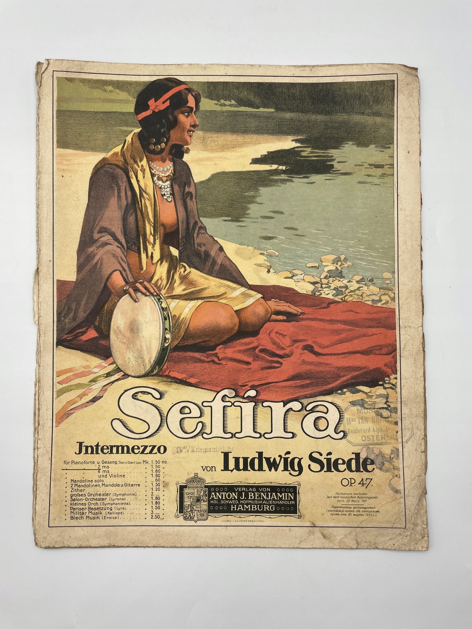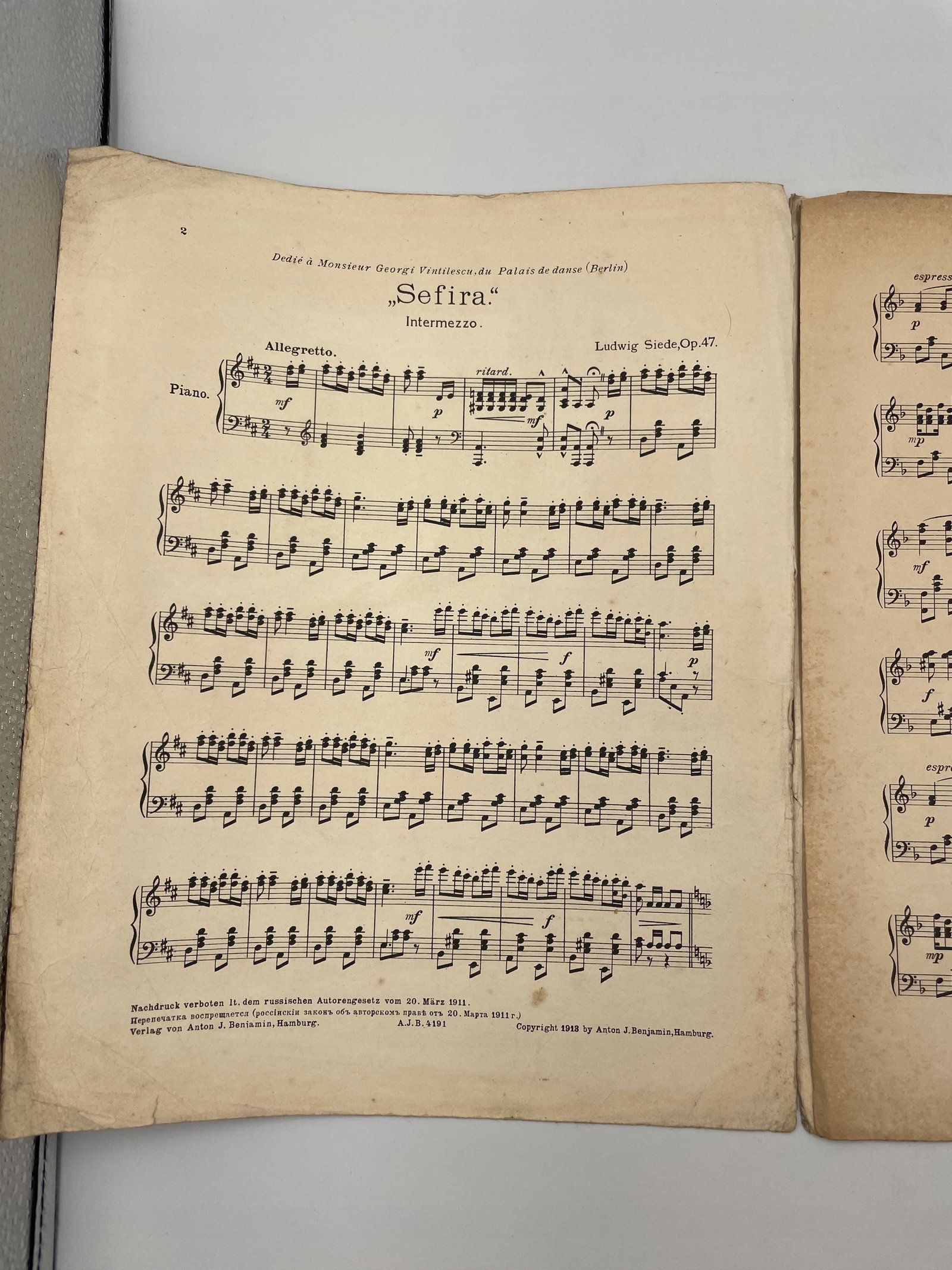 Oryginalne nuty „Sefira. Intermezzo” autorstwa Ludwiga Siede, Opus 47. Wydane przez renomowane wydawnictwo Anton J. Benjamin w Hamburgu, w roku 1918 (data potwierdzona nadrukiem copyright na drugiej stronie). Nuty przeznaczone na fortepian, format broszurowy, z piękną ilustrowaną okładką typową dla początków XX wieku.