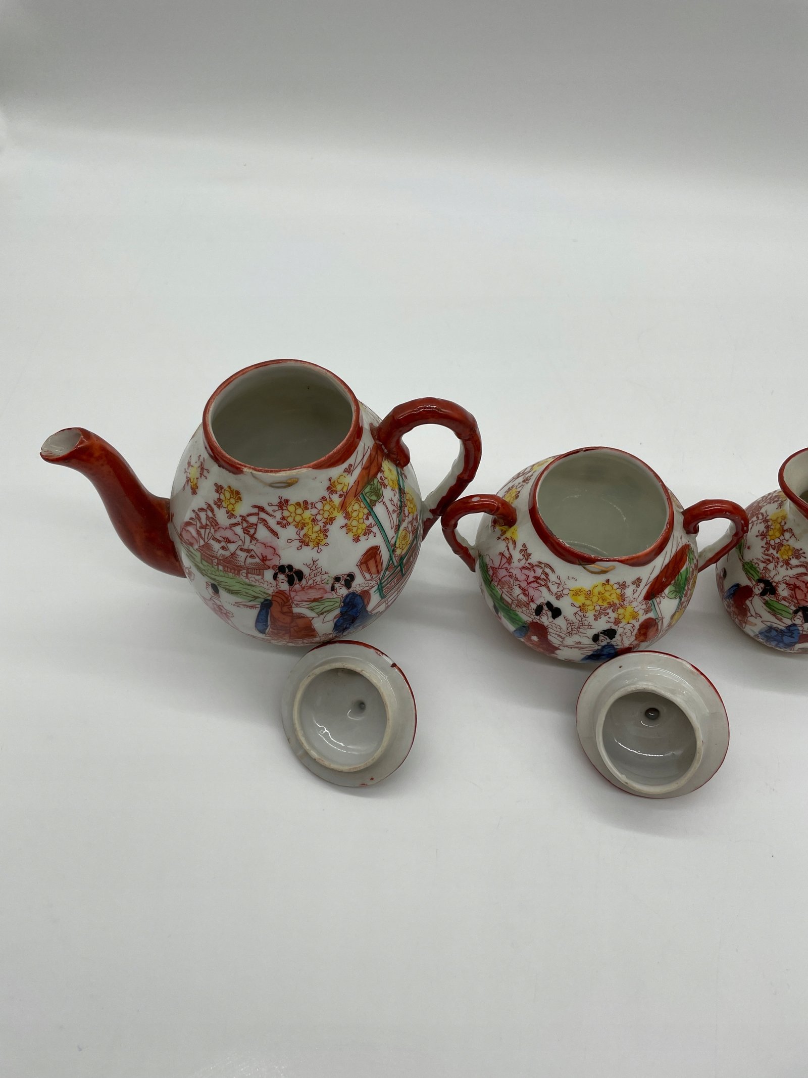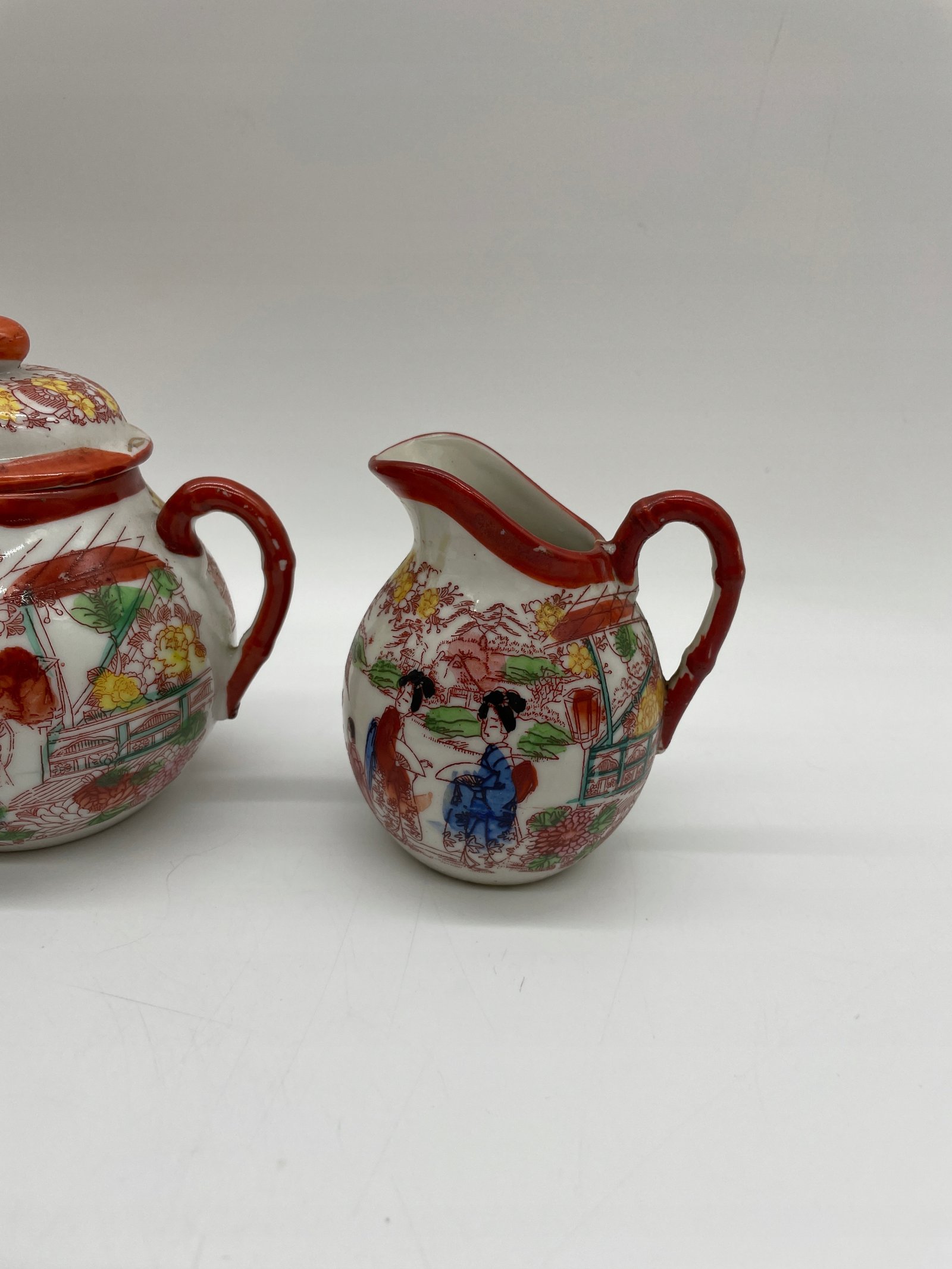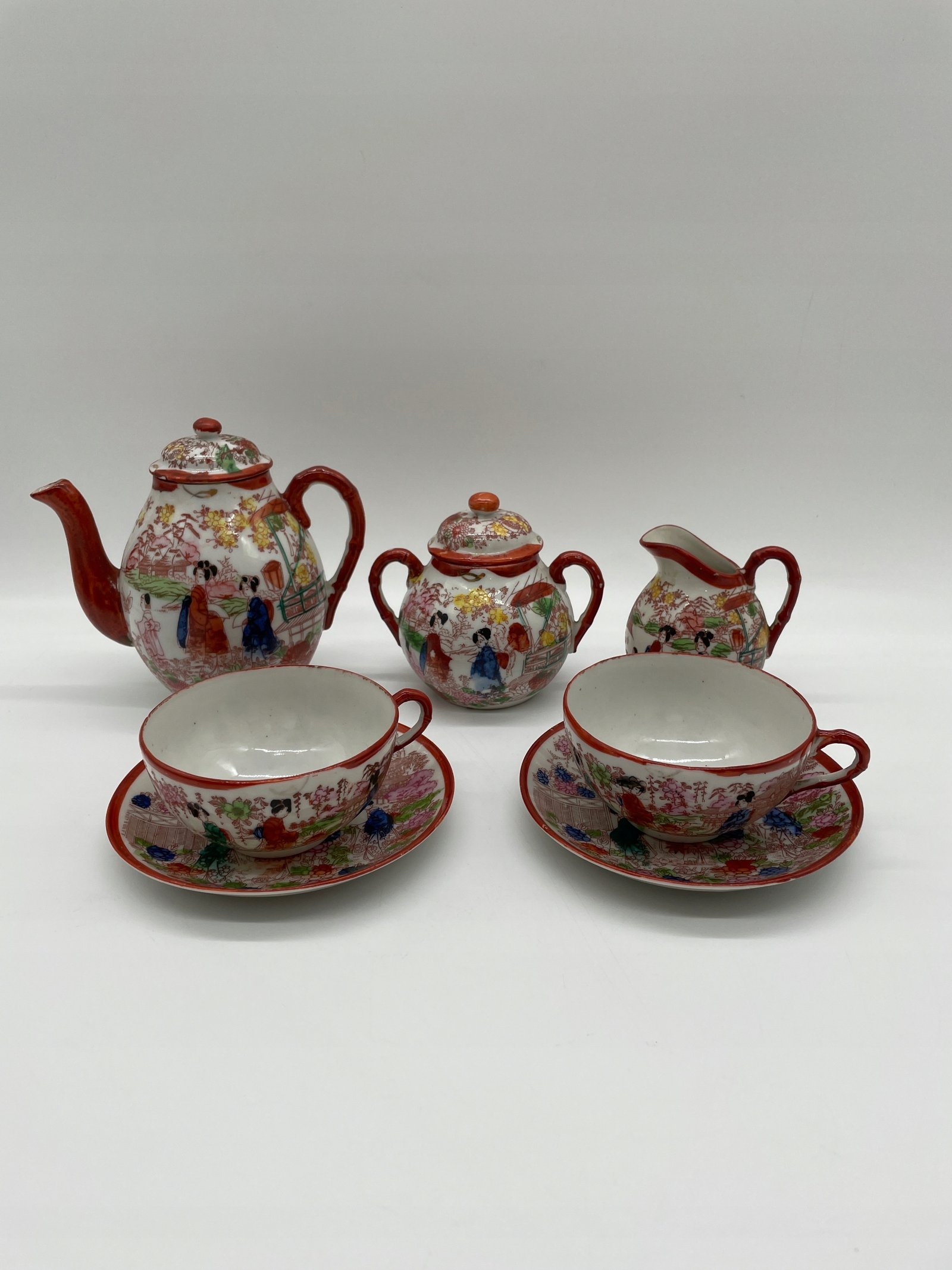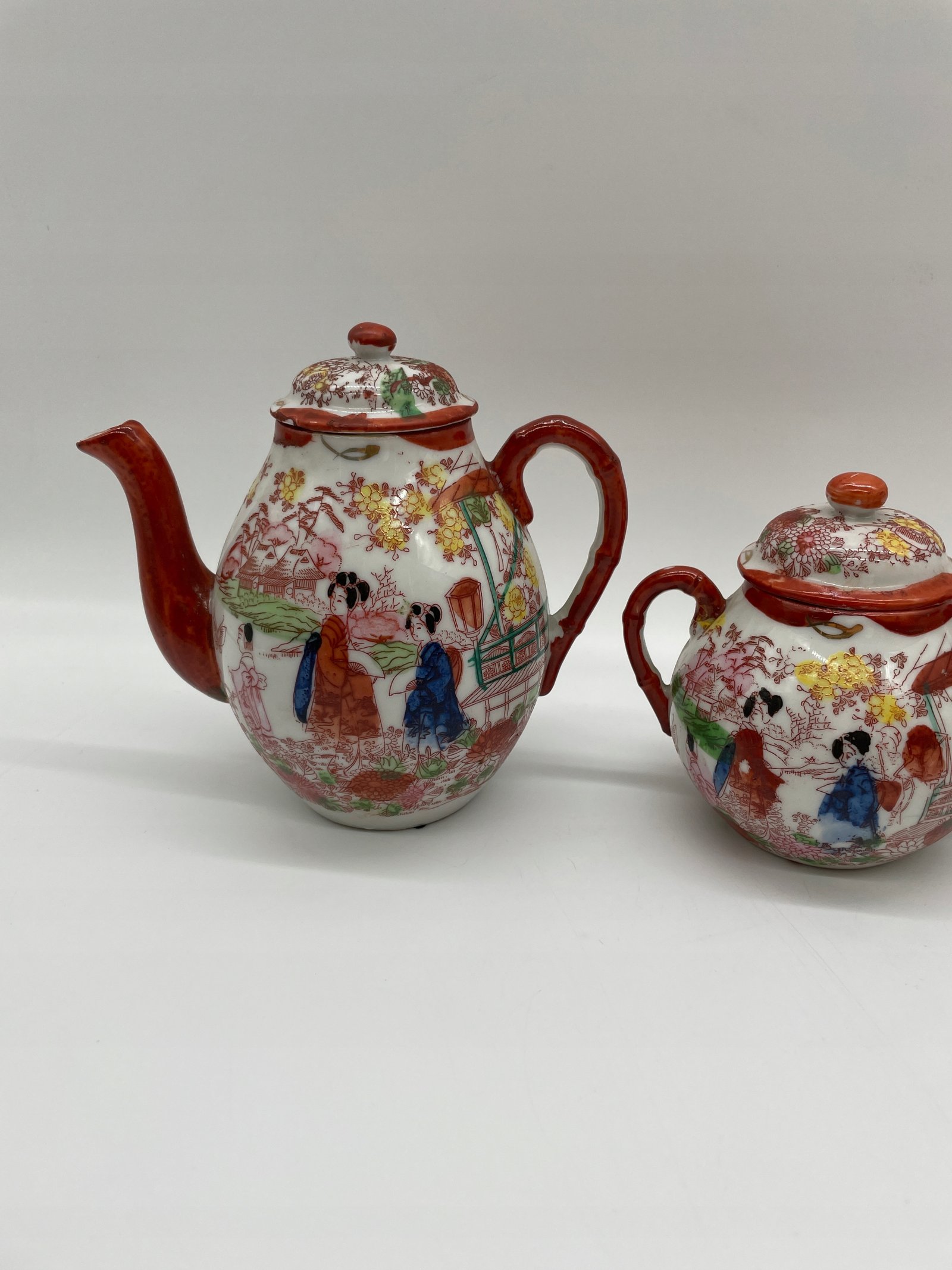 Zestaw herbaciany porcelanowy, zdobiony wielobarwnym malowaniem ręcznym w stylu japońskim, przedstawiającym sceny dworskiego życia, kwiaty i ornamenty ze złocistymi detalami. W skład kompletu wchodzi: czajnik z pokrywką (15×16×10 cm), cukiernica z pokrywką (10×12 cm), mlecznik (9,5×8 cm), dwie filiżanki (5×12×9,5 cm) oraz dwa spodki (średnica 13,5 cm). Ornamentyka typowa dla wyrobów japońskich z połowy XX wieku, przeznaczonych na eksport. Stan ogólny dobry, widoczne ślady użytkowania i możliwe przetarcia malatury.