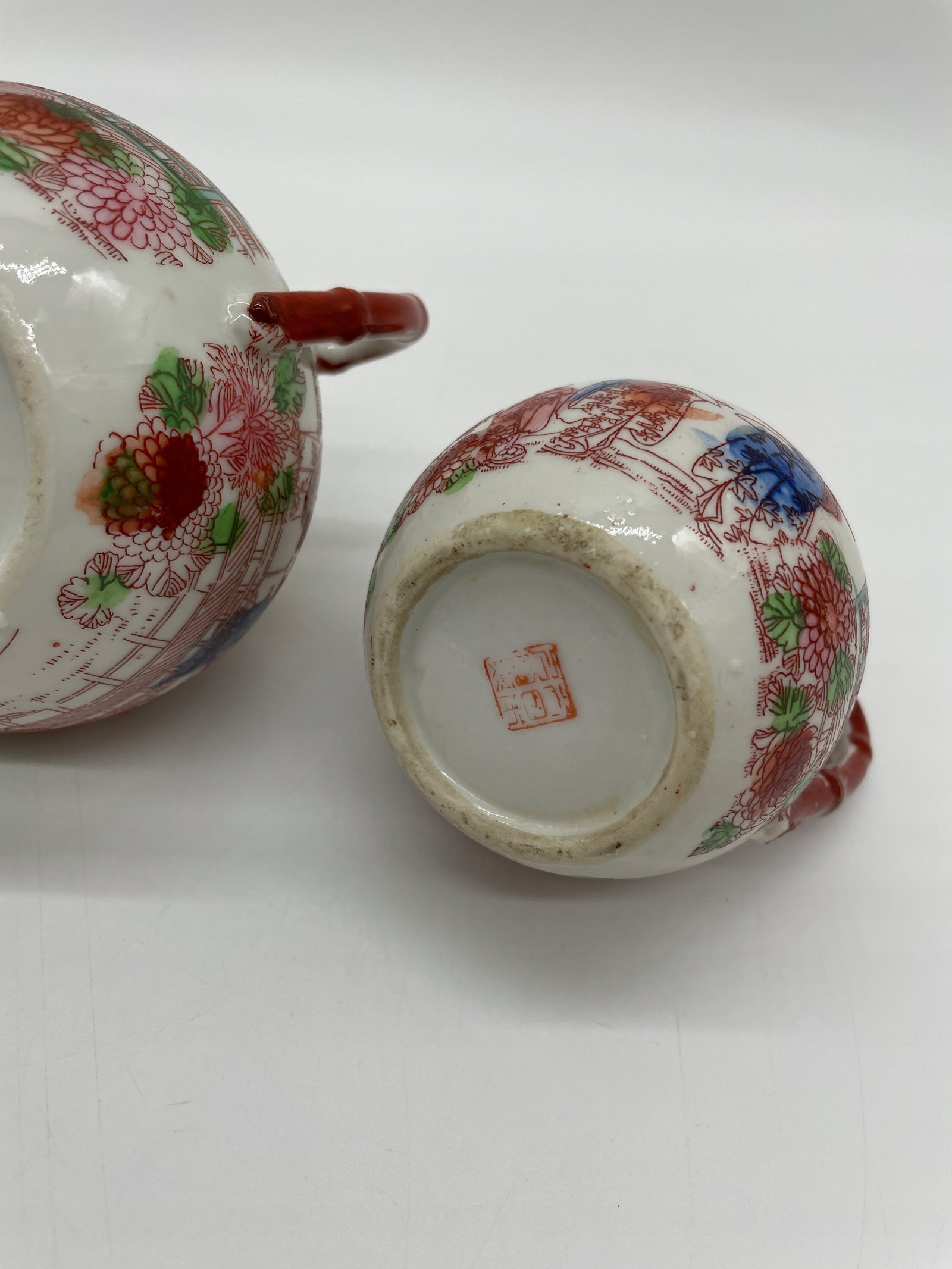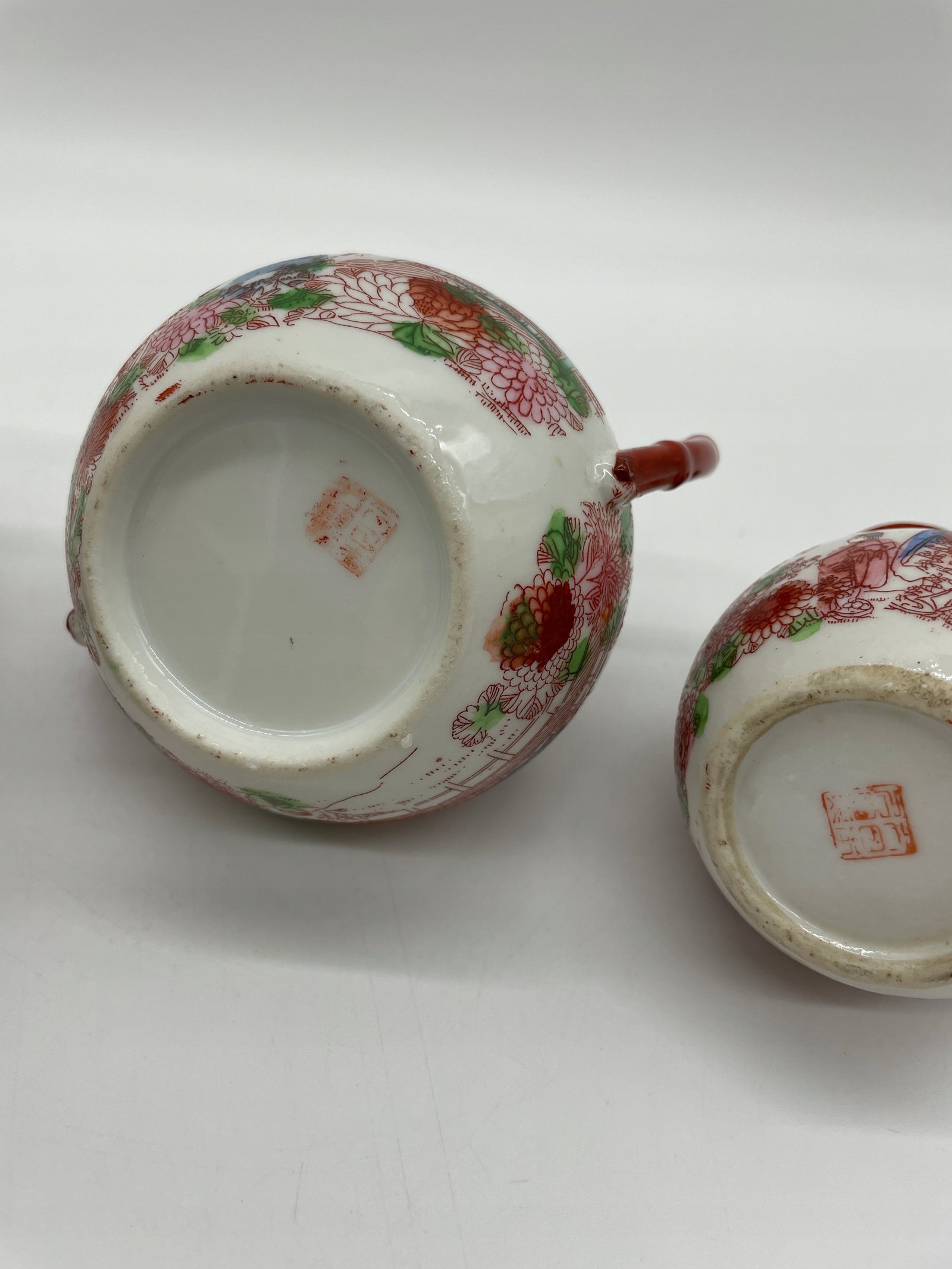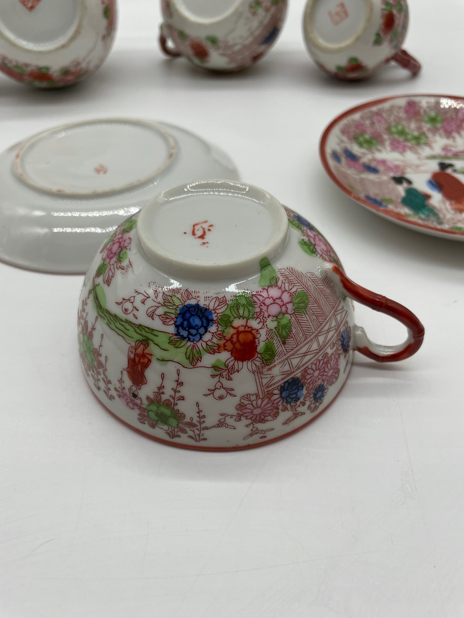 Zestaw herbaciany porcelanowy, zdobiony wielobarwnym malowaniem ręcznym w stylu japońskim, przedstawiającym sceny dworskiego życia, kwiaty i ornamenty ze złocistymi detalami. W skład kompletu wchodzi: czajnik z pokrywką (15×16×10 cm), cukiernica z pokrywką (10×12 cm), mlecznik (9,5×8 cm), dwie filiżanki (5×12×9,5 cm) oraz dwa spodki (średnica 13,5 cm). Ornamentyka typowa dla wyrobów japońskich z połowy XX wieku, przeznaczonych na eksport. Stan ogólny dobry, widoczne ślady użytkowania i możliwe przetarcia malatury.