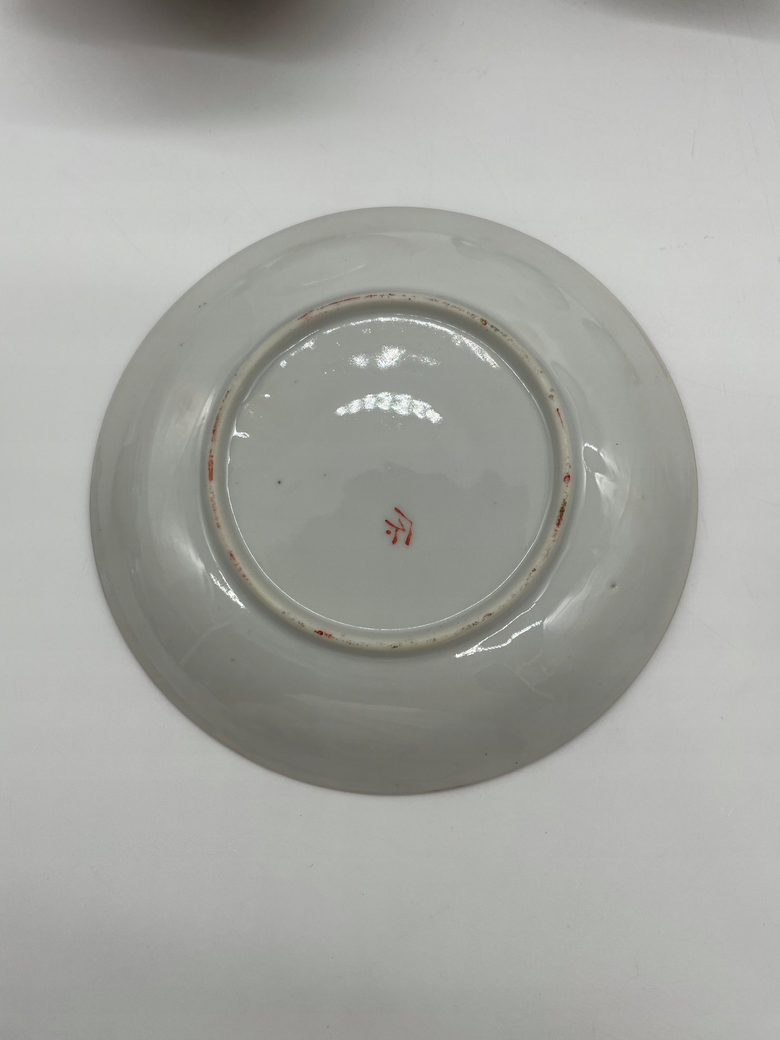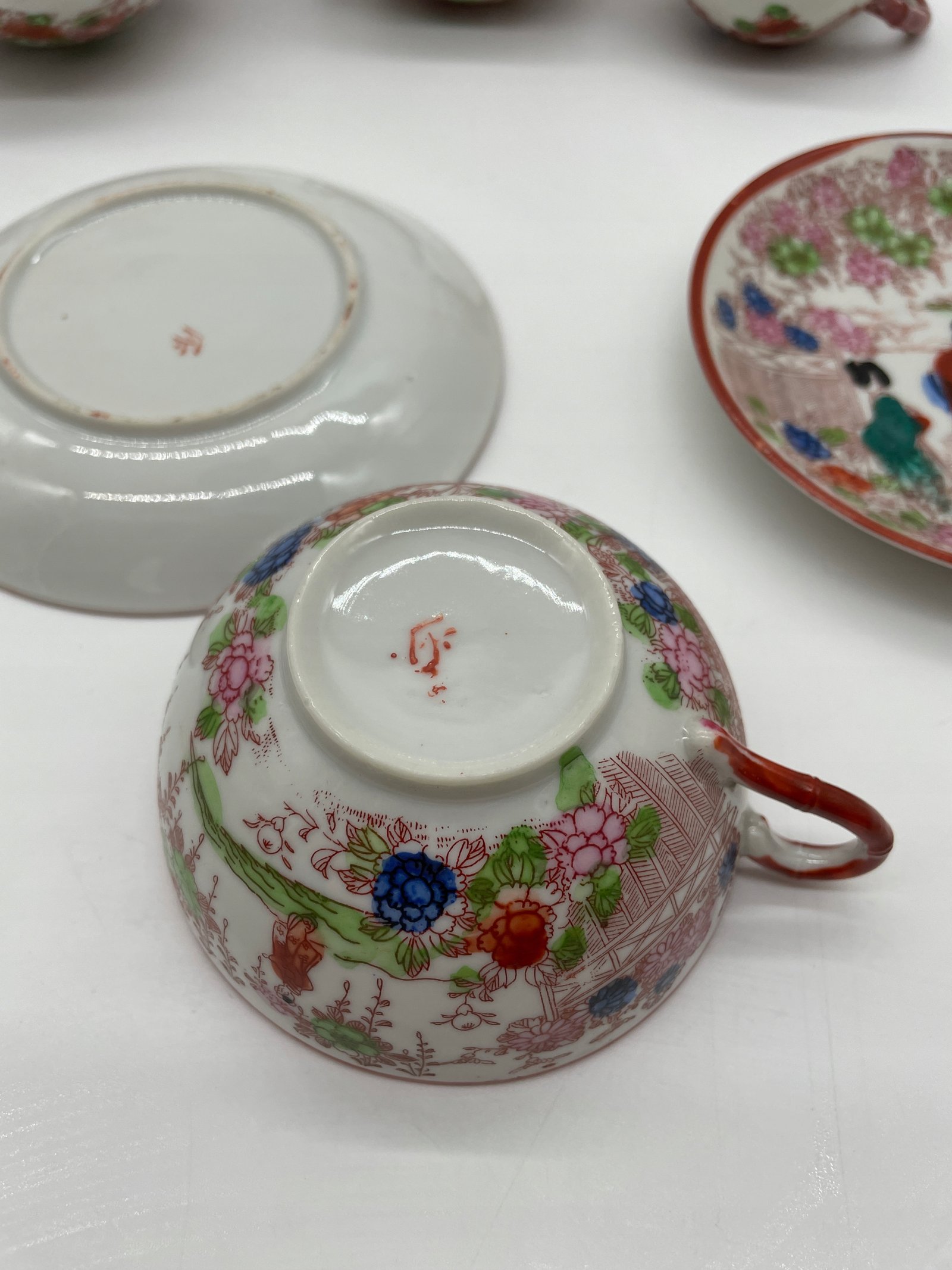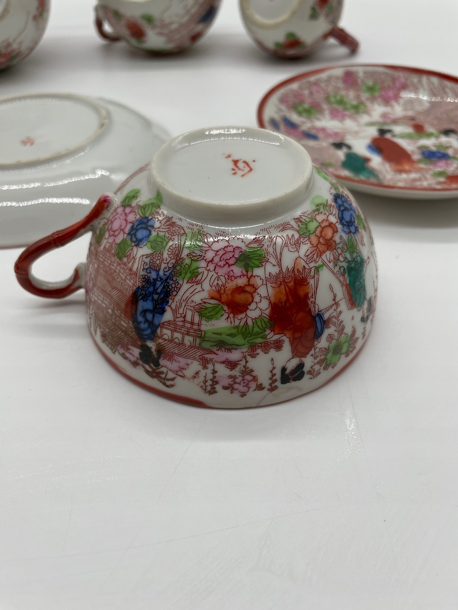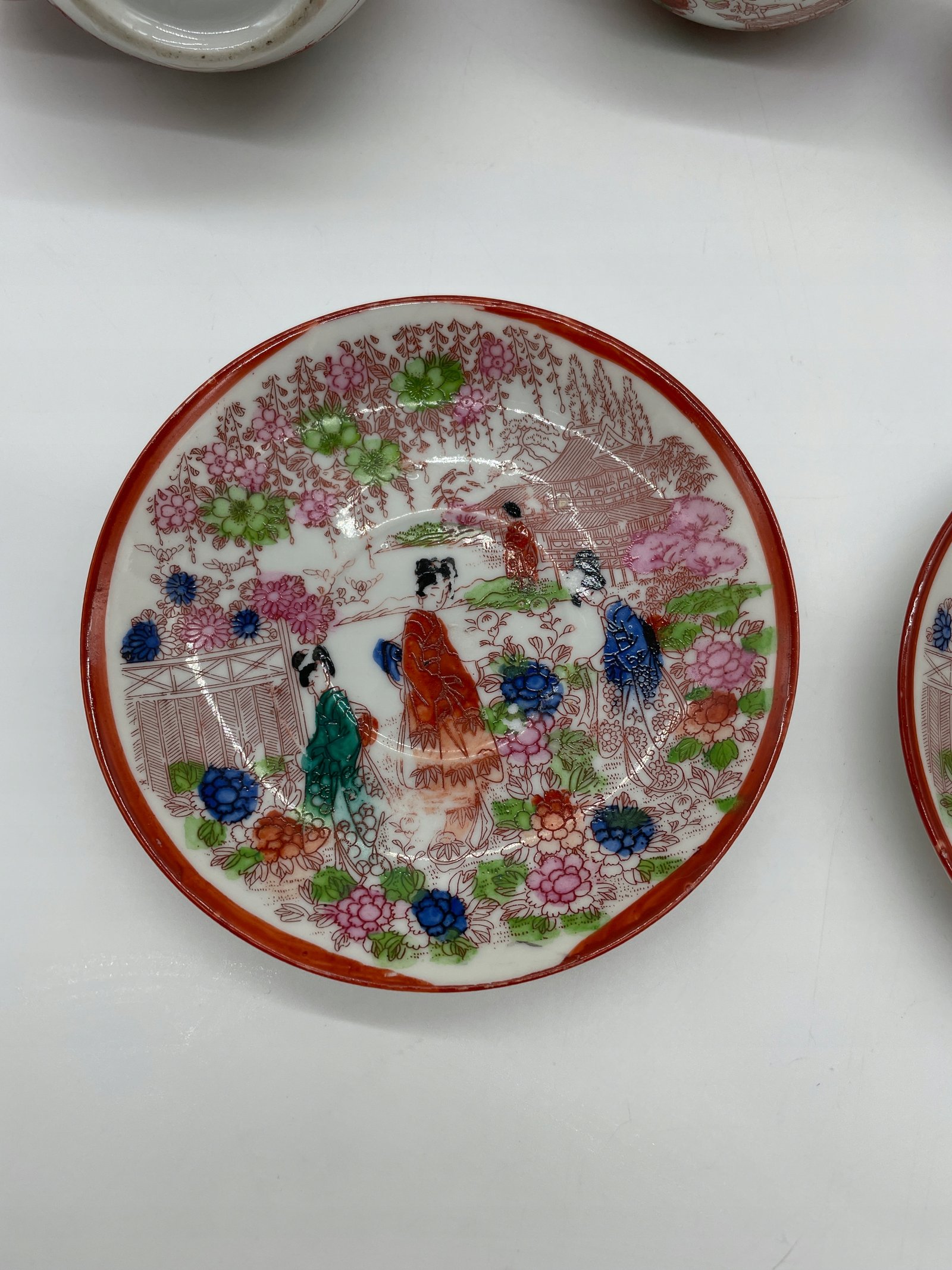 Zestaw herbaciany porcelanowy, zdobiony wielobarwnym malowaniem ręcznym w stylu japońskim, przedstawiającym sceny dworskiego życia, kwiaty i ornamenty ze złocistymi detalami. W skład kompletu wchodzi: czajnik z pokrywką (15×16×10 cm), cukiernica z pokrywką (10×12 cm), mlecznik (9,5×8 cm), dwie filiżanki (5×12×9,5 cm) oraz dwa spodki (średnica 13,5 cm). Ornamentyka typowa dla wyrobów japońskich z połowy XX wieku, przeznaczonych na eksport. Stan ogólny dobry, widoczne ślady użytkowania i możliwe przetarcia malatury.
