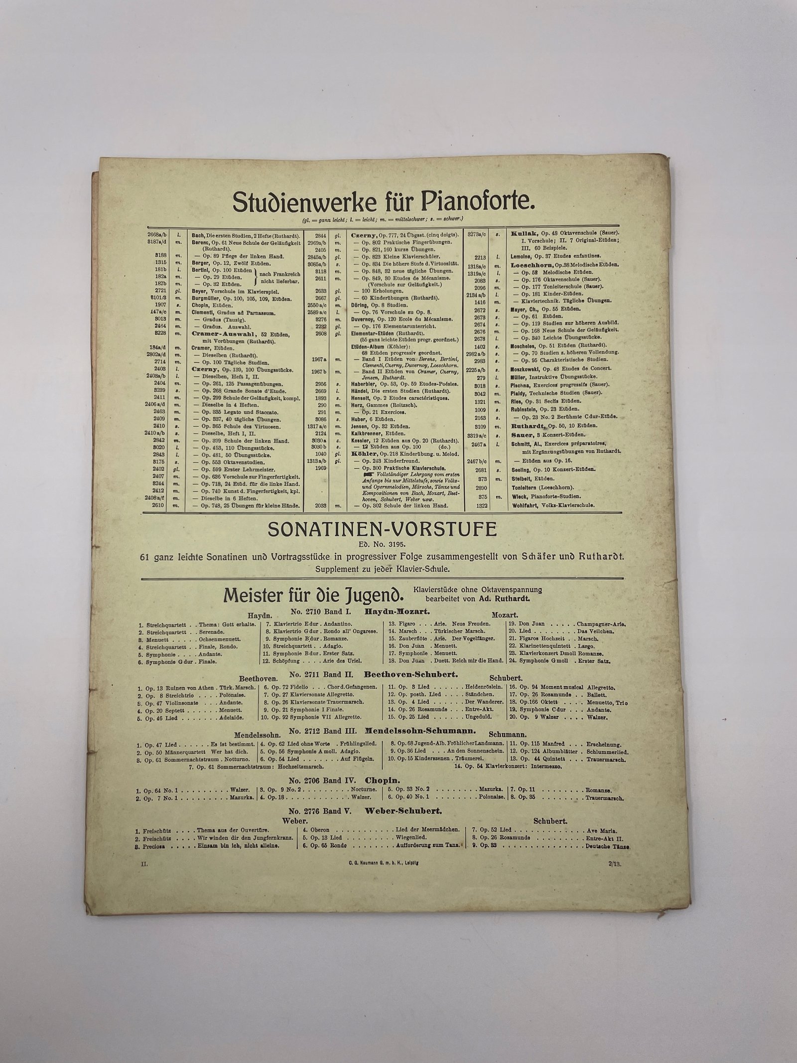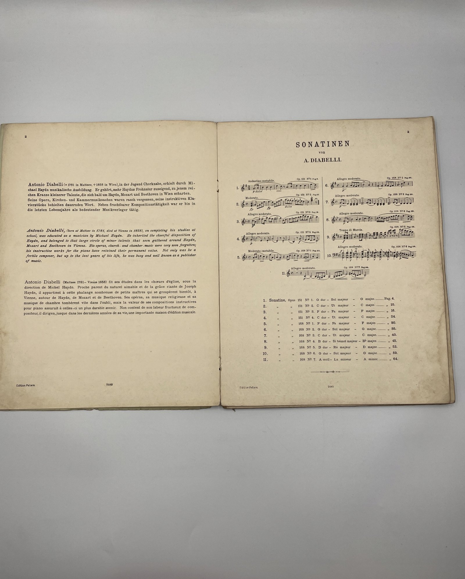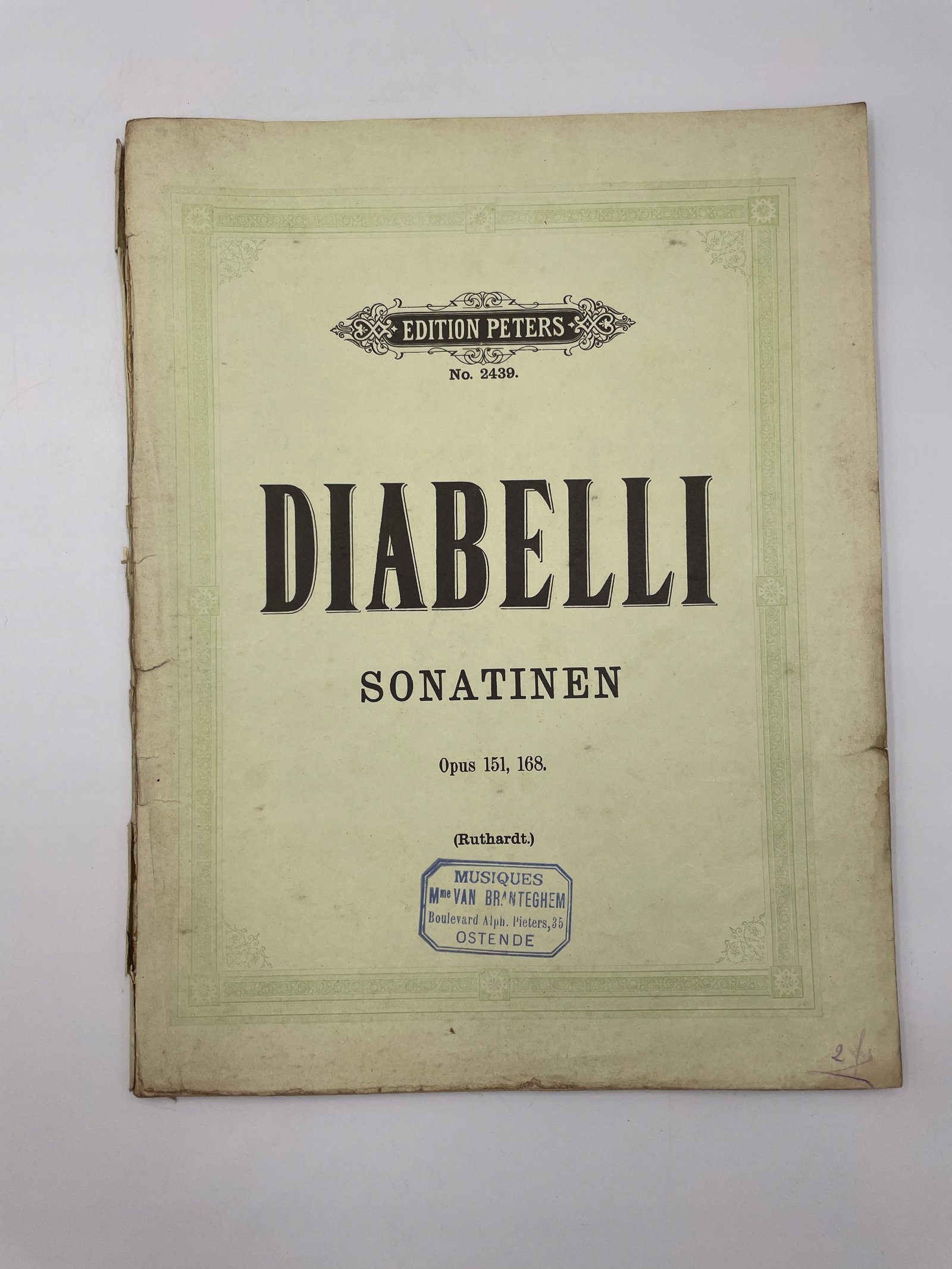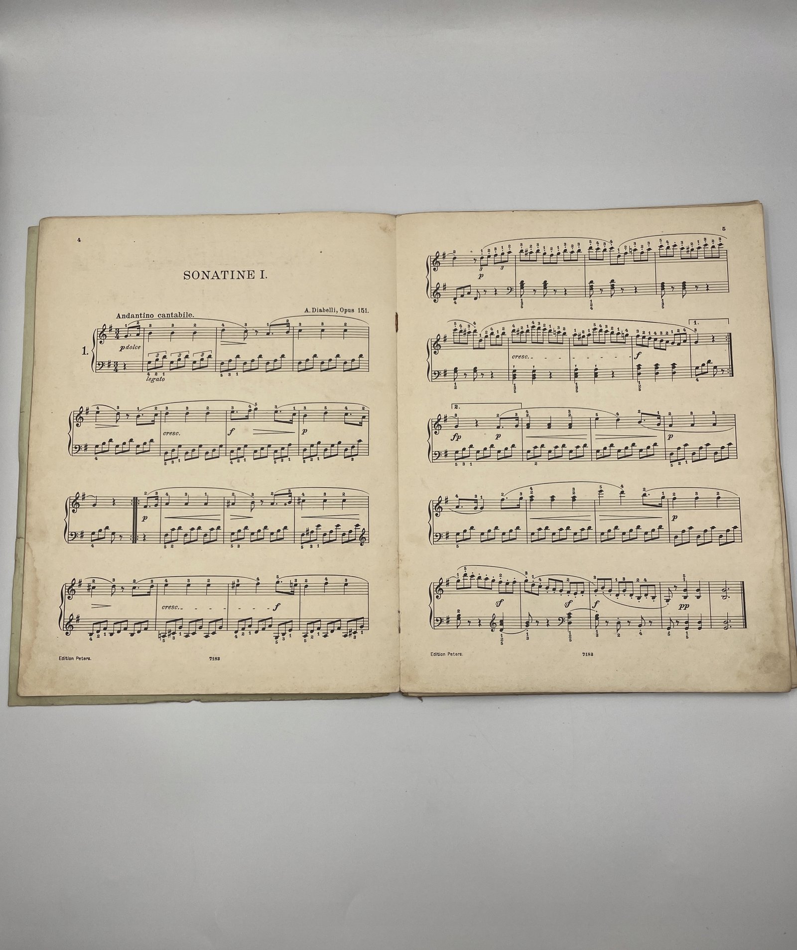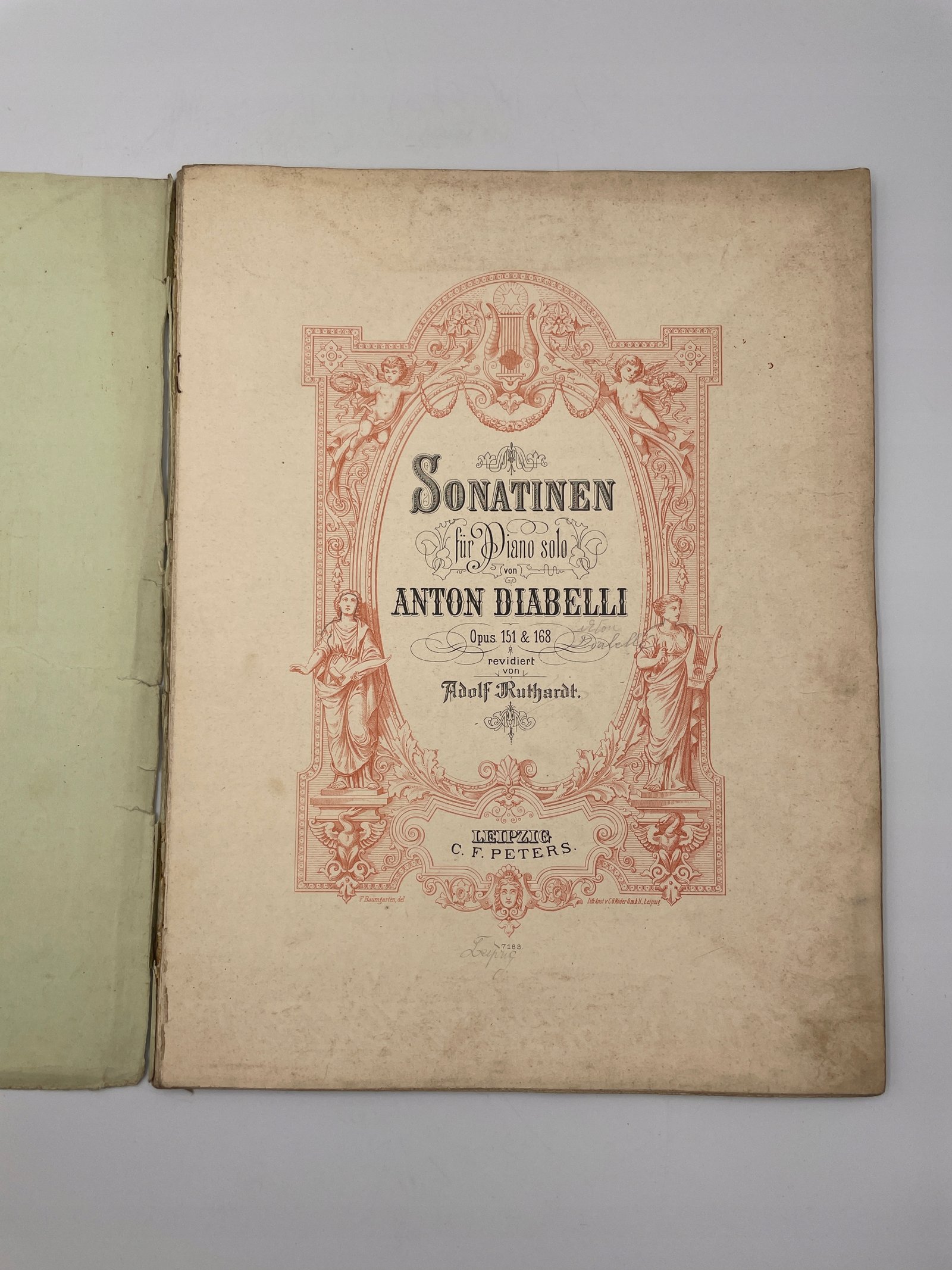 Stare wydanie nut „Sonatinen für Piano solo” autorstwa Antona Diabellego (Opus 151 i 168), wydane przez renomowane wydawnictwo muzyczne C.F. Peters, Lipsk (Leipzig). Redakcja: Adolf Ruthardt. Okładka i strony wewnętrzne bogato zdobione, charakterystyczne dla przełomu XIX i XX wieku.