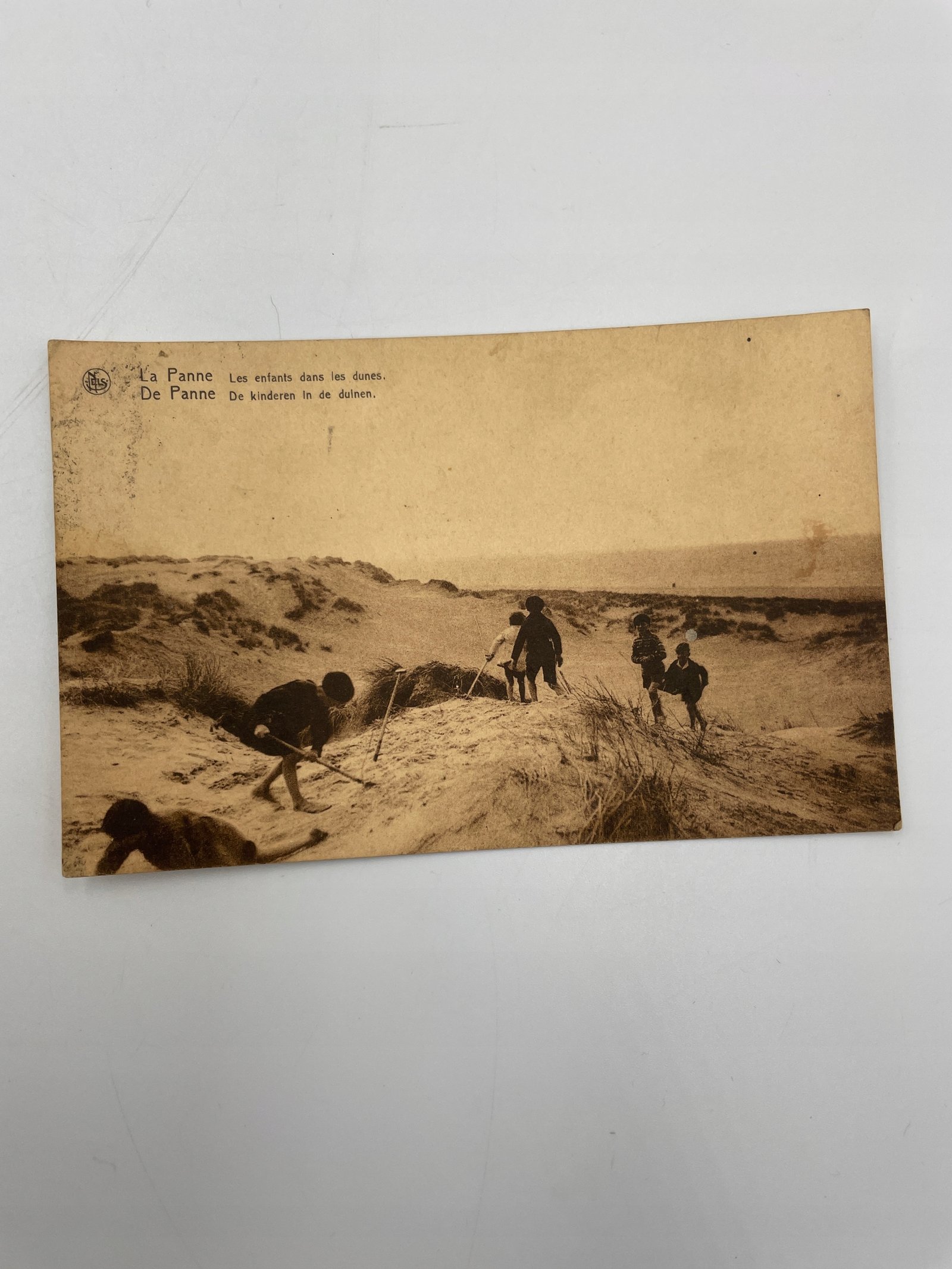 Stara pocztówka Belgia dzieci bawiące się w wydmach De Panne