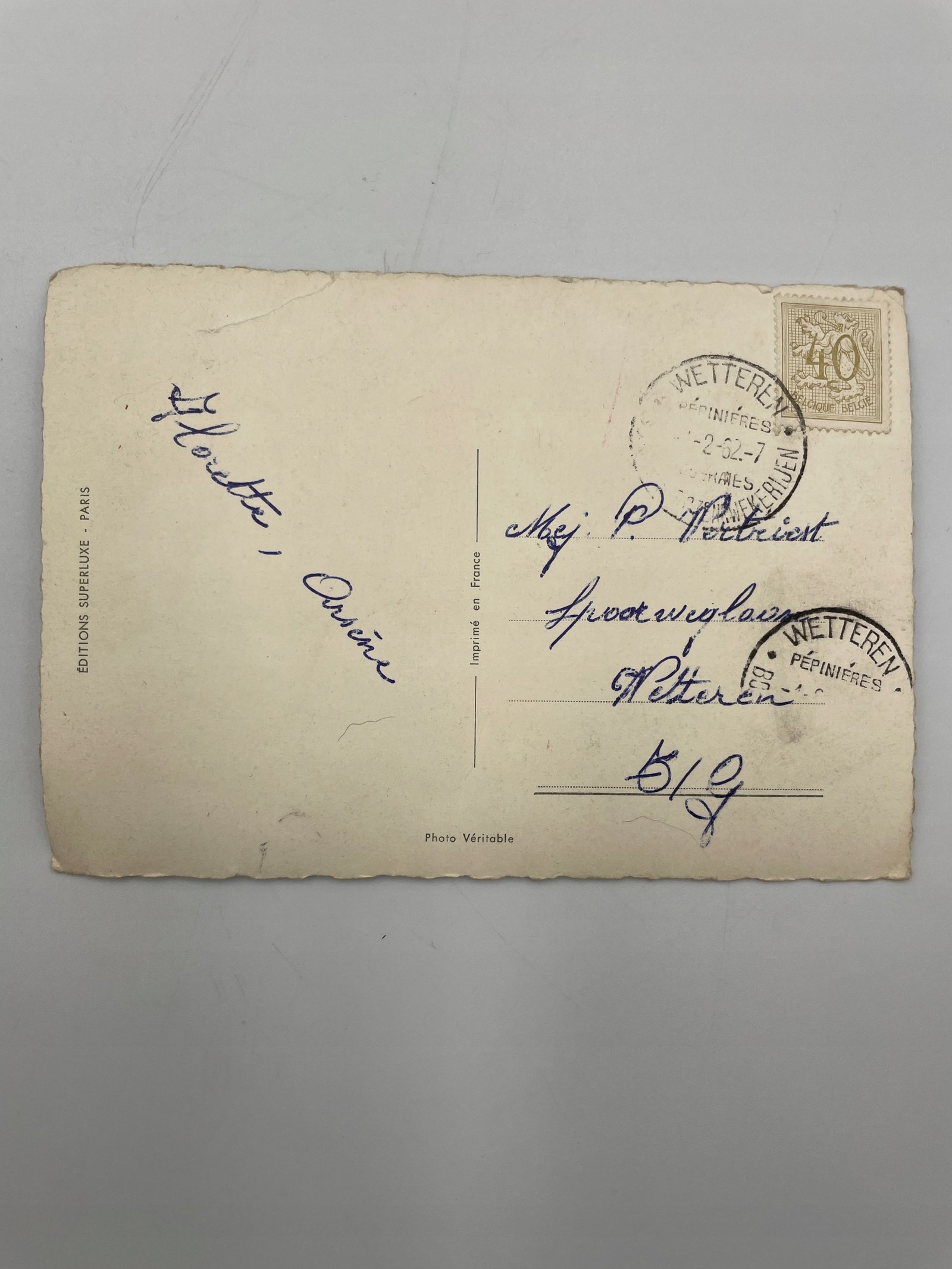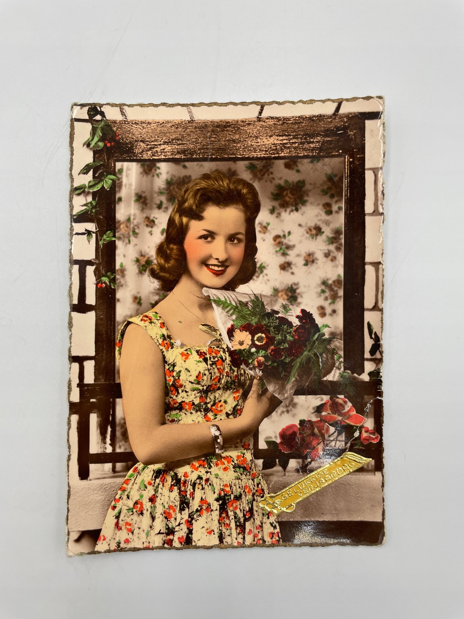 Stara pocztówka Belgia dziewczyna z bukietem w ramie okiennej 1962