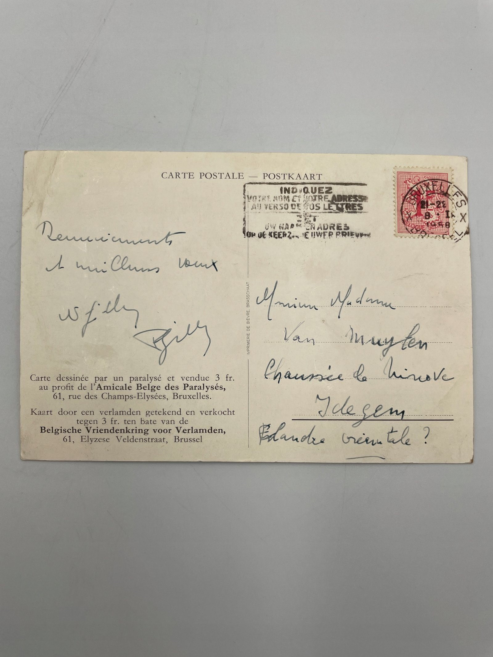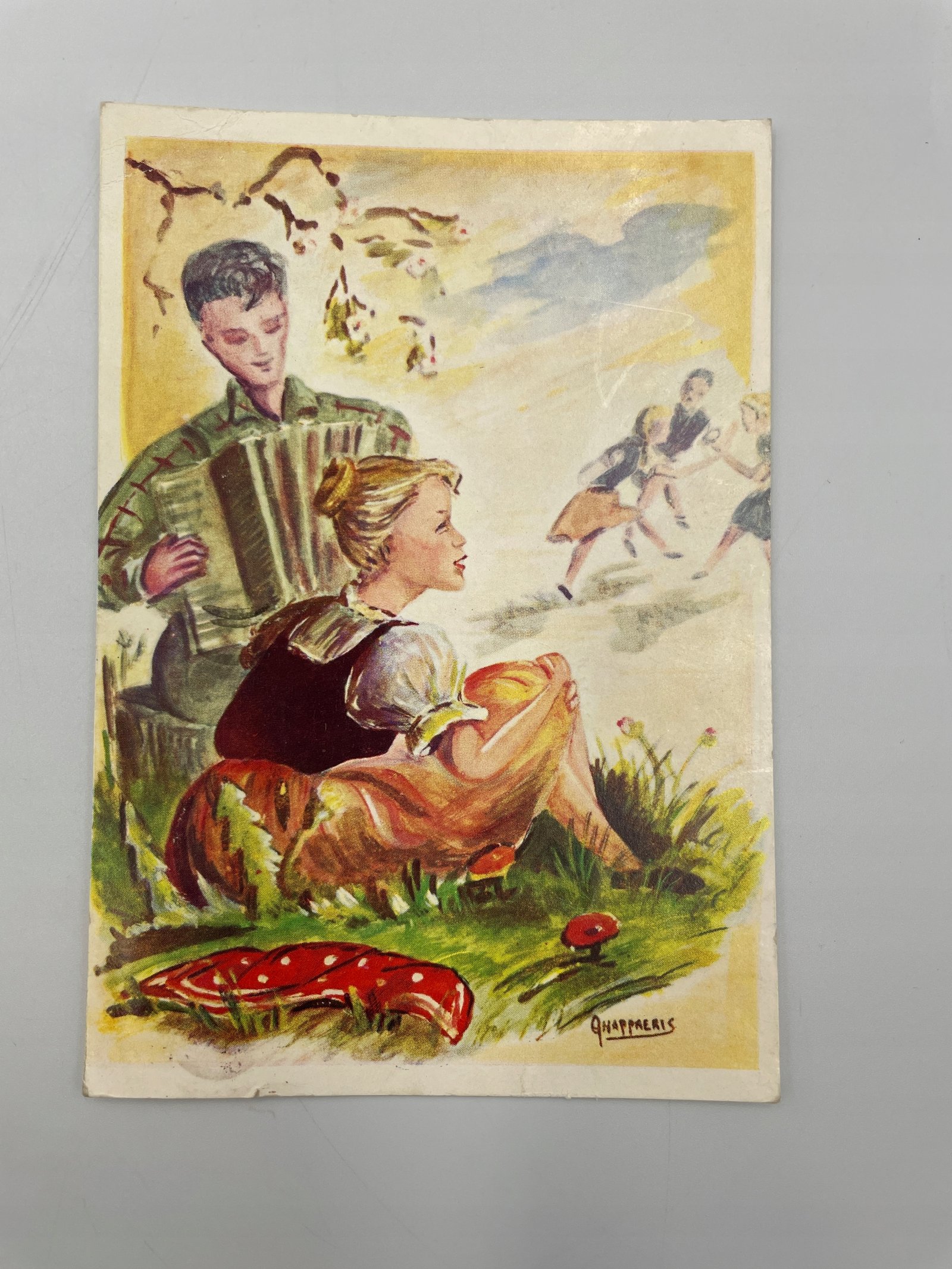 Stara pocztówka Belgia Para zakochanych akordeon i dzieci w tle 1958
