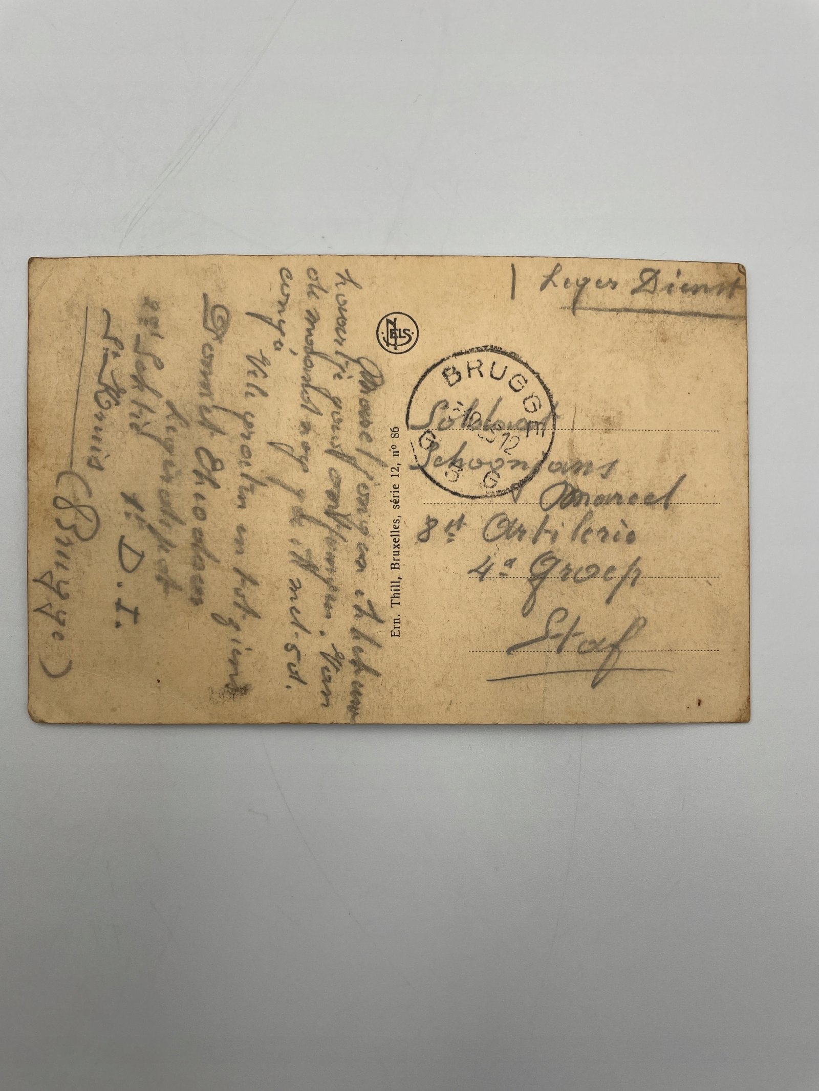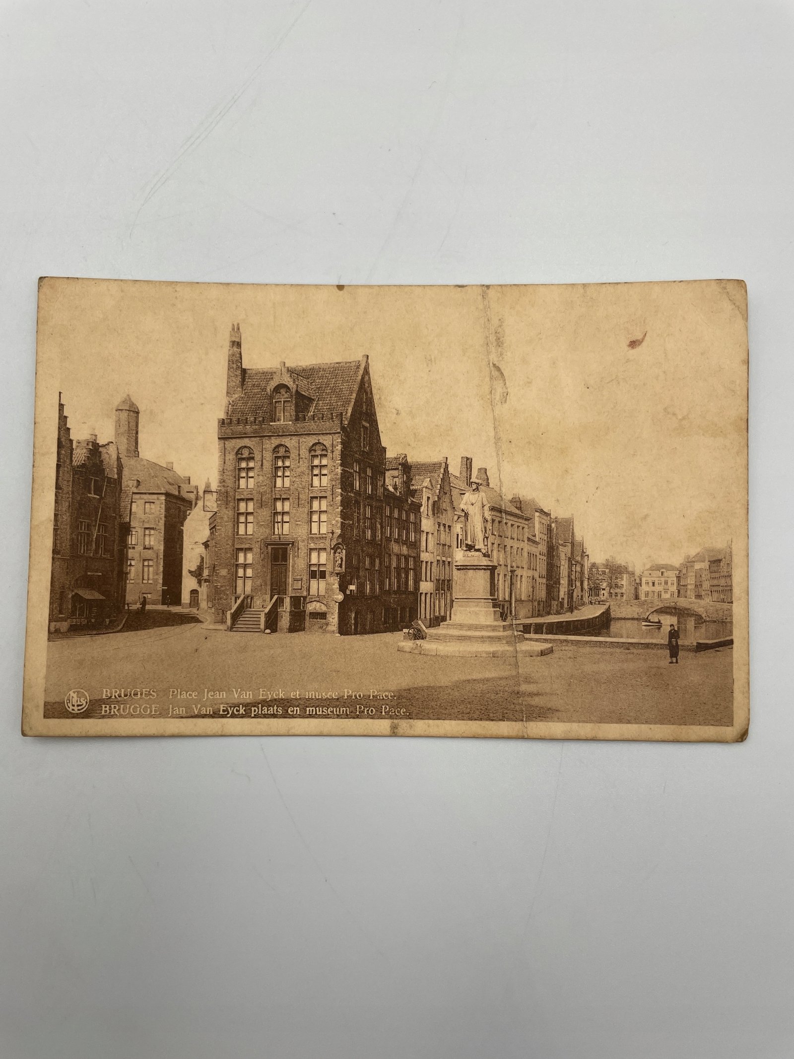 Stara pocztówka Brugge Jan van Eyckplaats i muzeum Pro Pace 1939