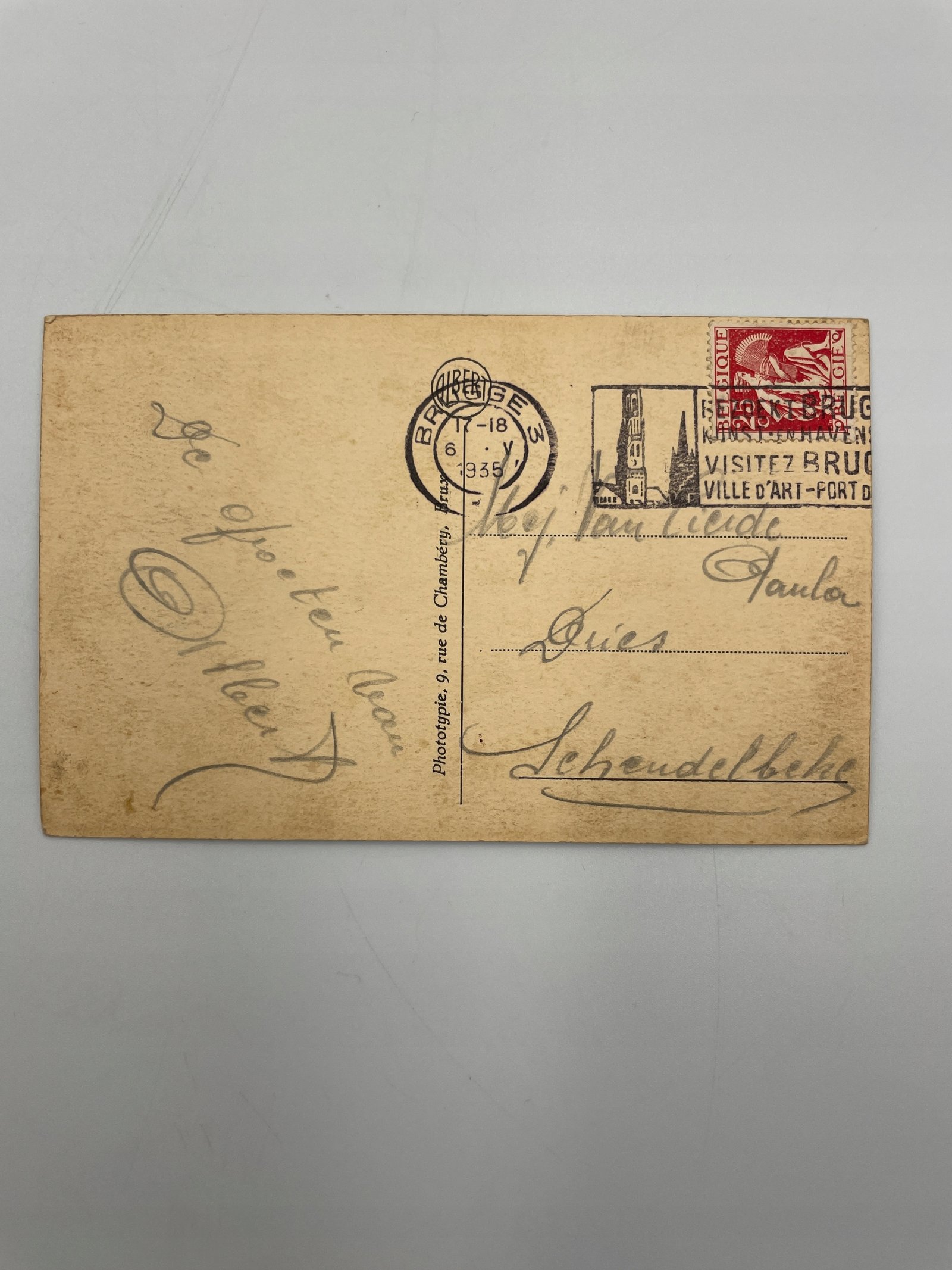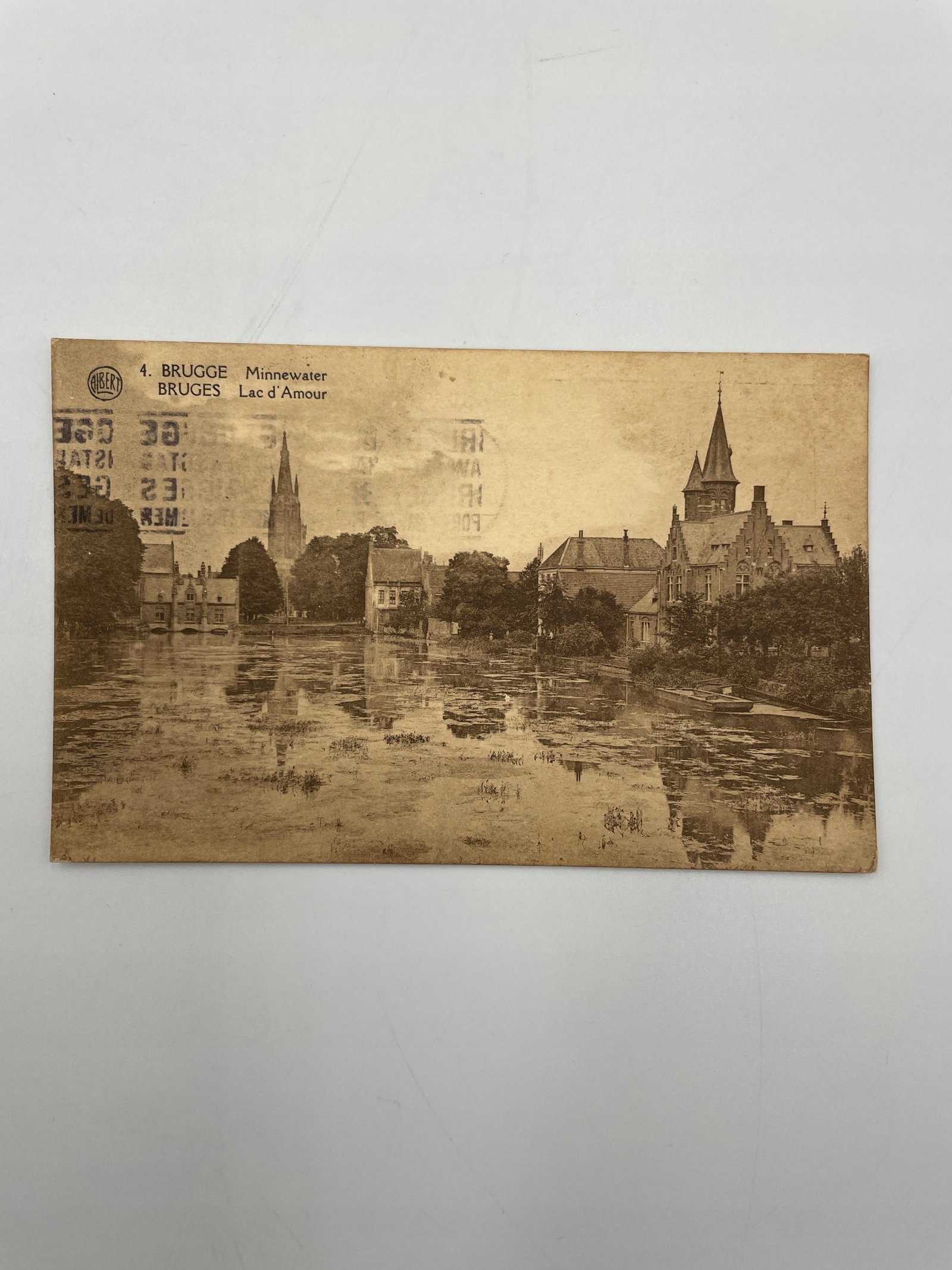 Stara pocztówka przedstawiająca romantyczny widok na Minnewater – tzw. Jezioro Miłości w Brugii (Belgia). Data stempla pocztowego to 1935 rok.