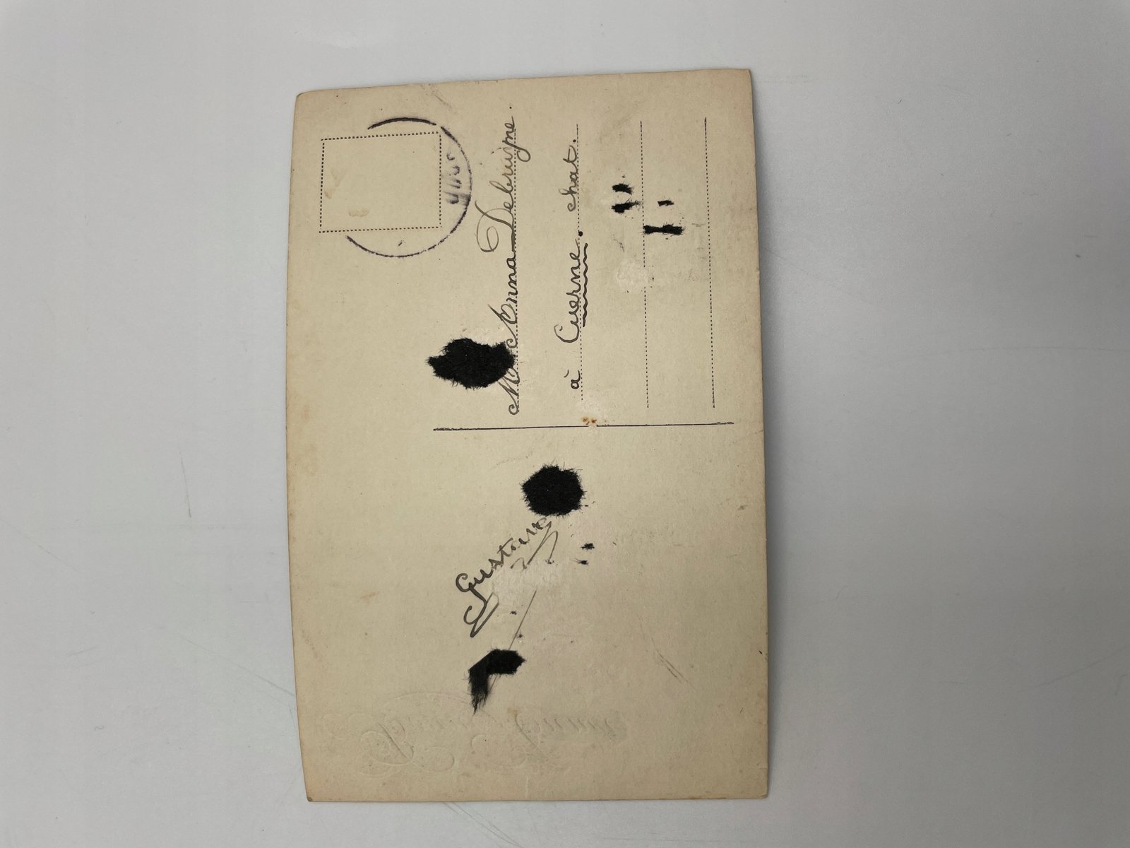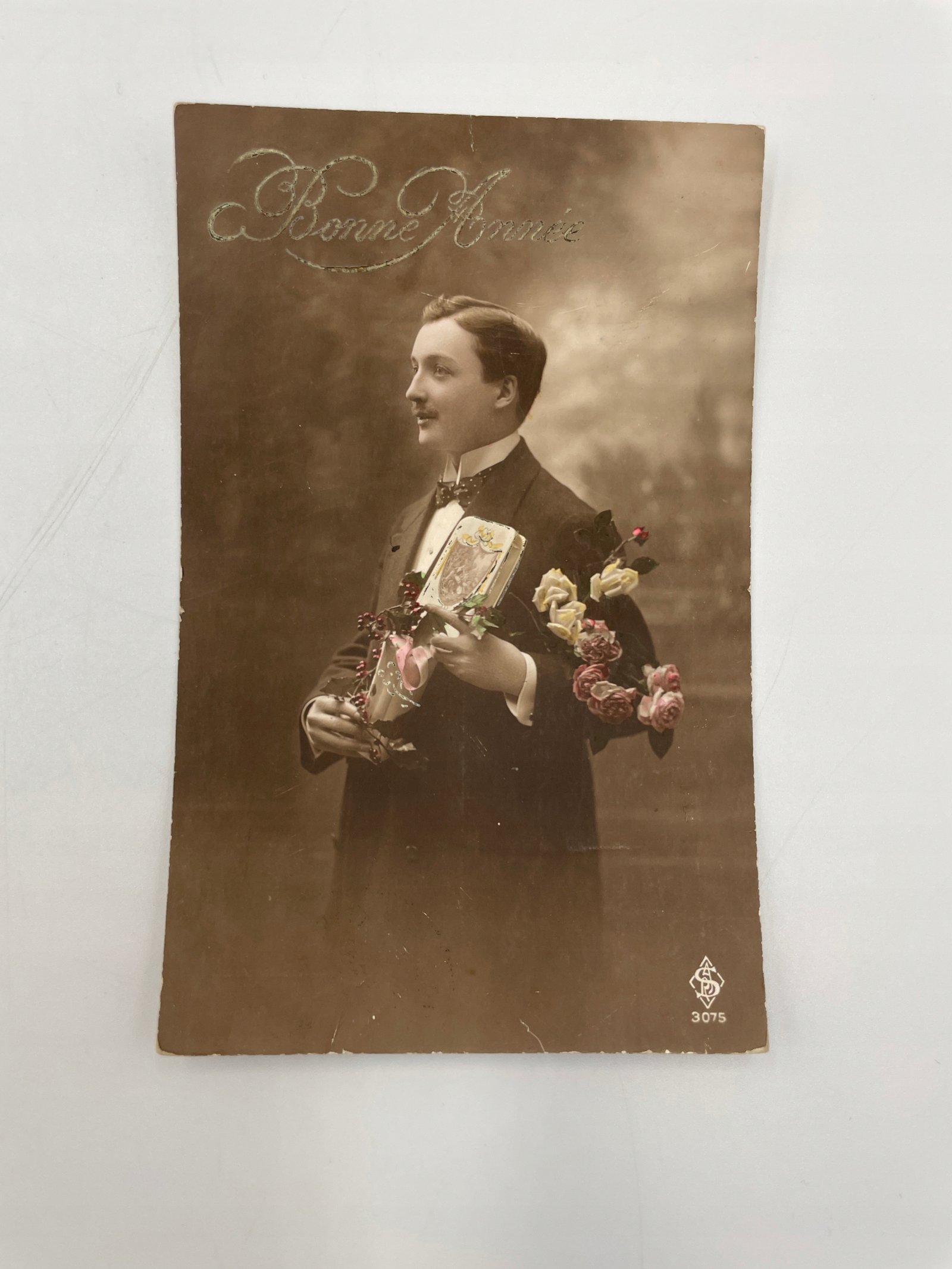 Stara pocztówka Francja Bonne Année mężczyzna z kartką i kwiatami