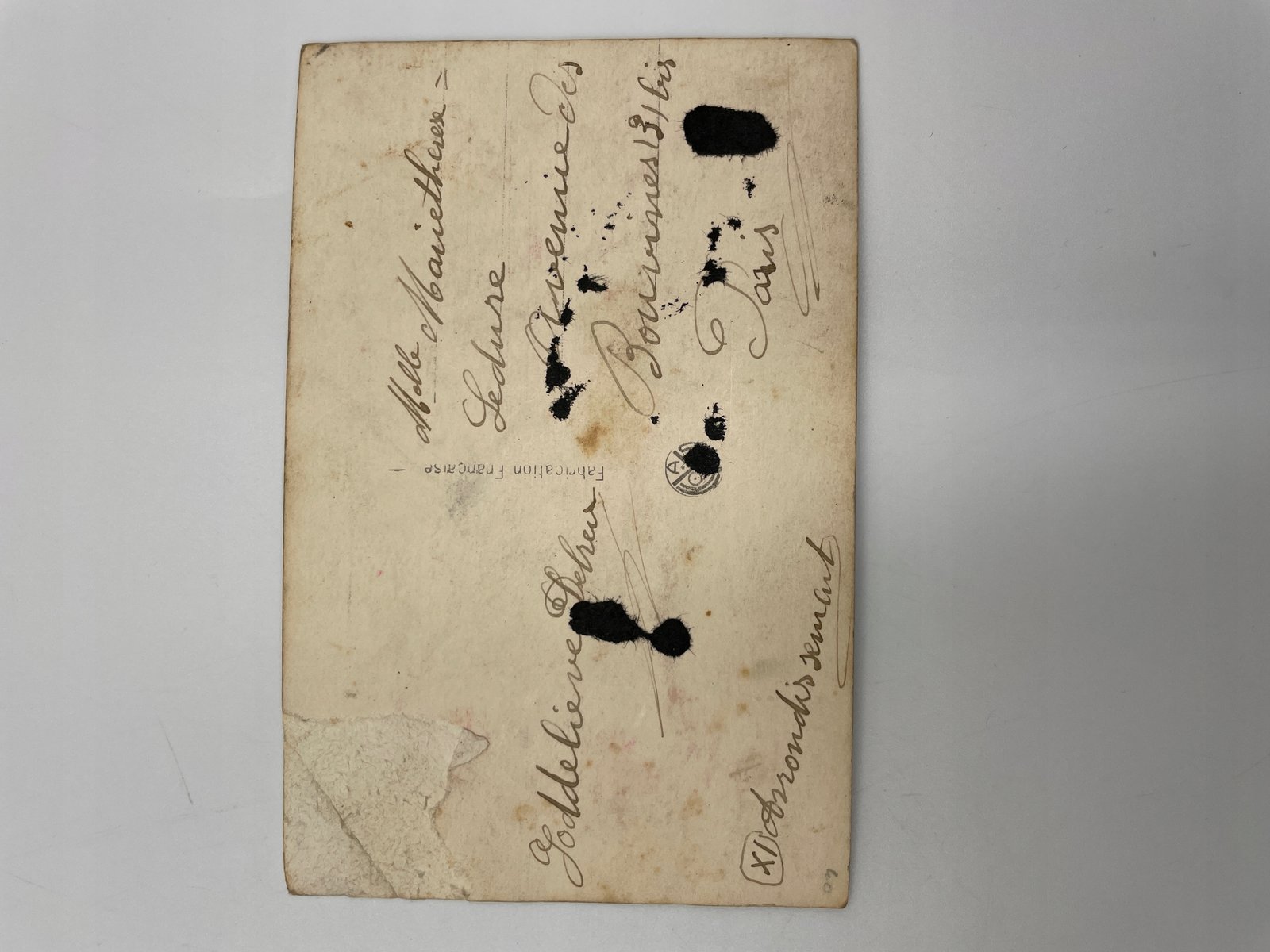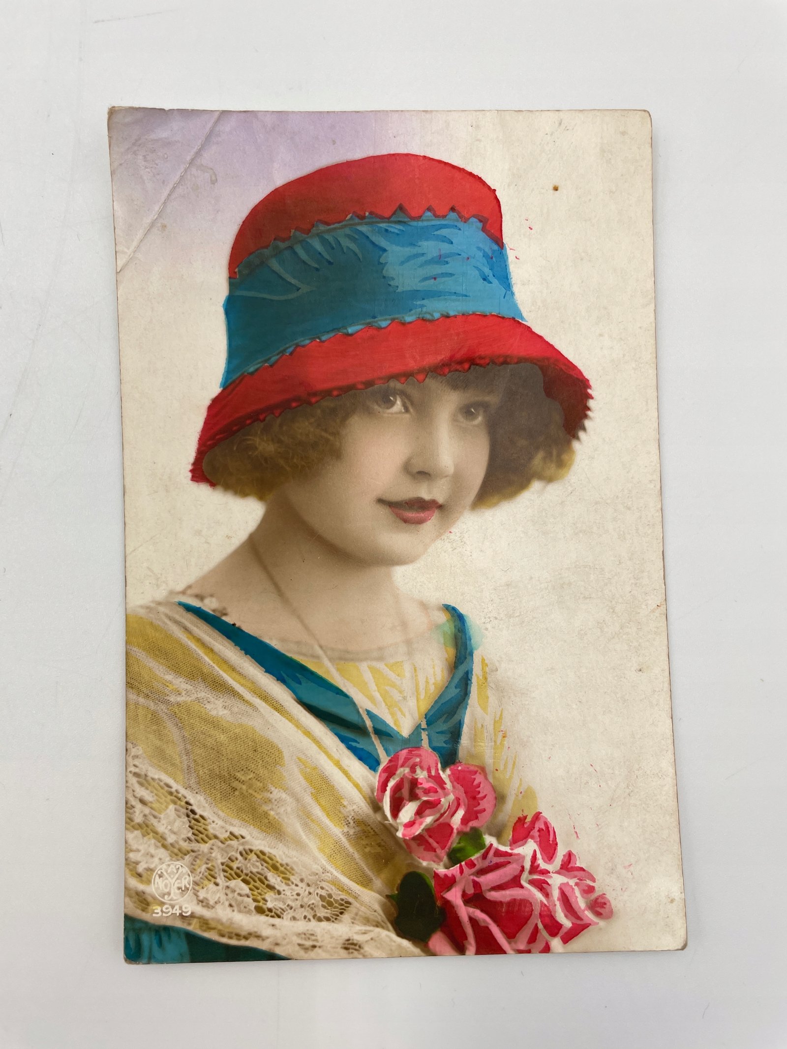 Stara pocztówka Francja portret kobiety w czerwonym kapeluszu z różami