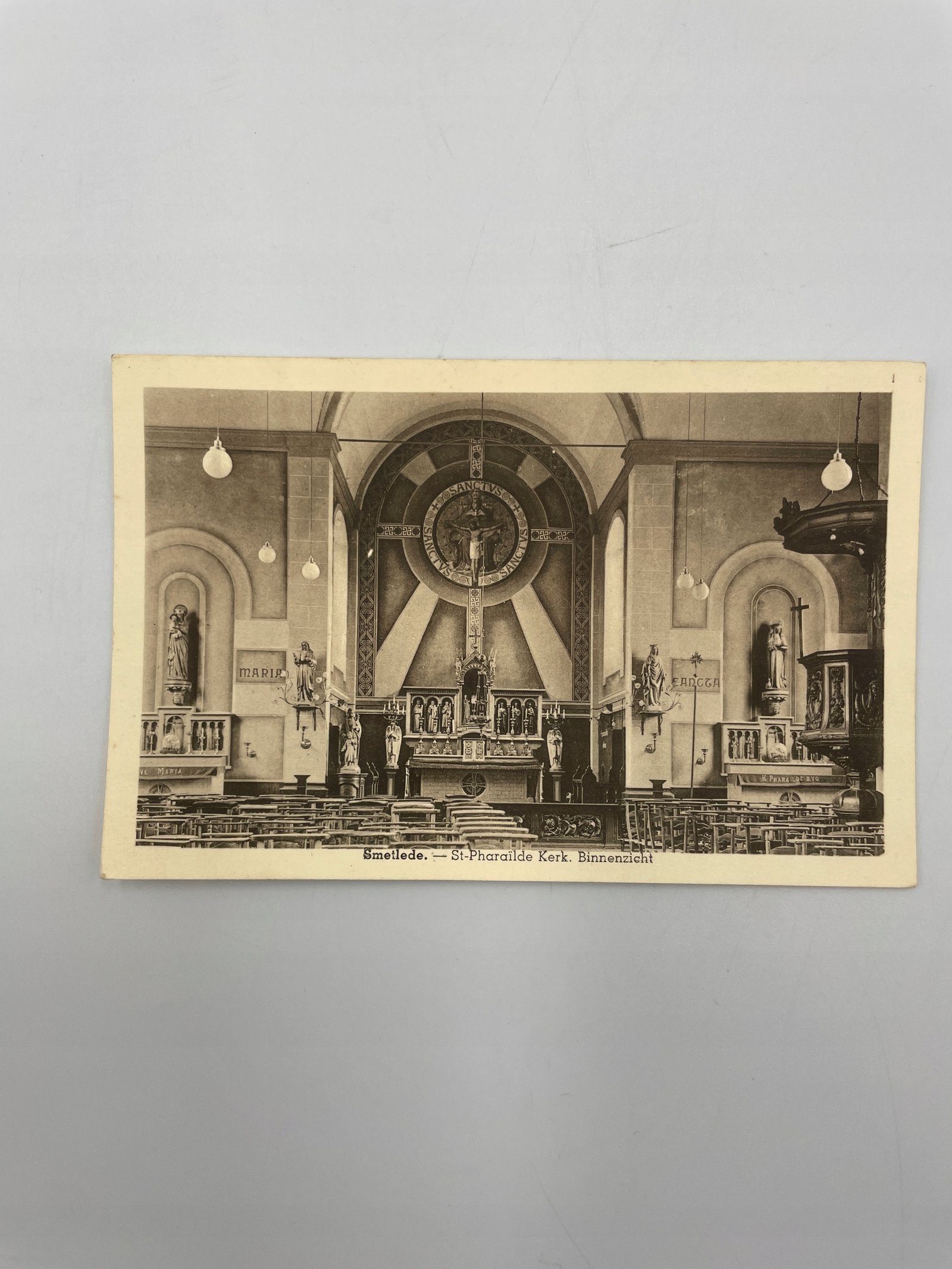 Stara pocztówka Kościół św. Pharailde, wnętrze, Smellegem, Belgia