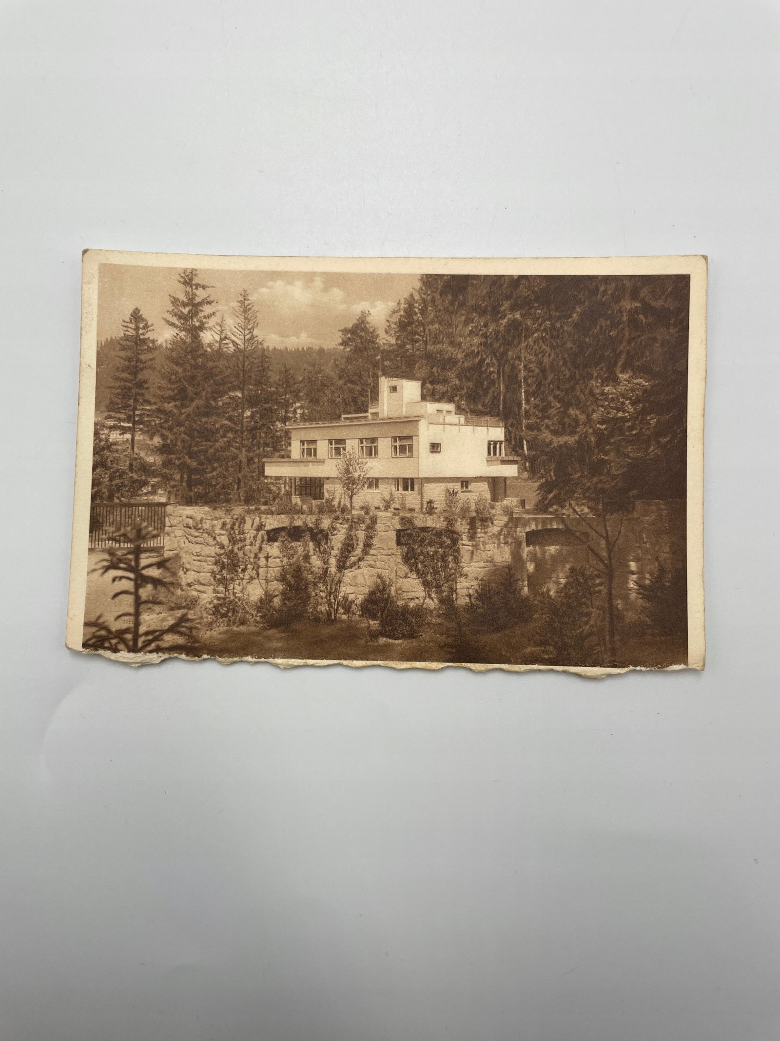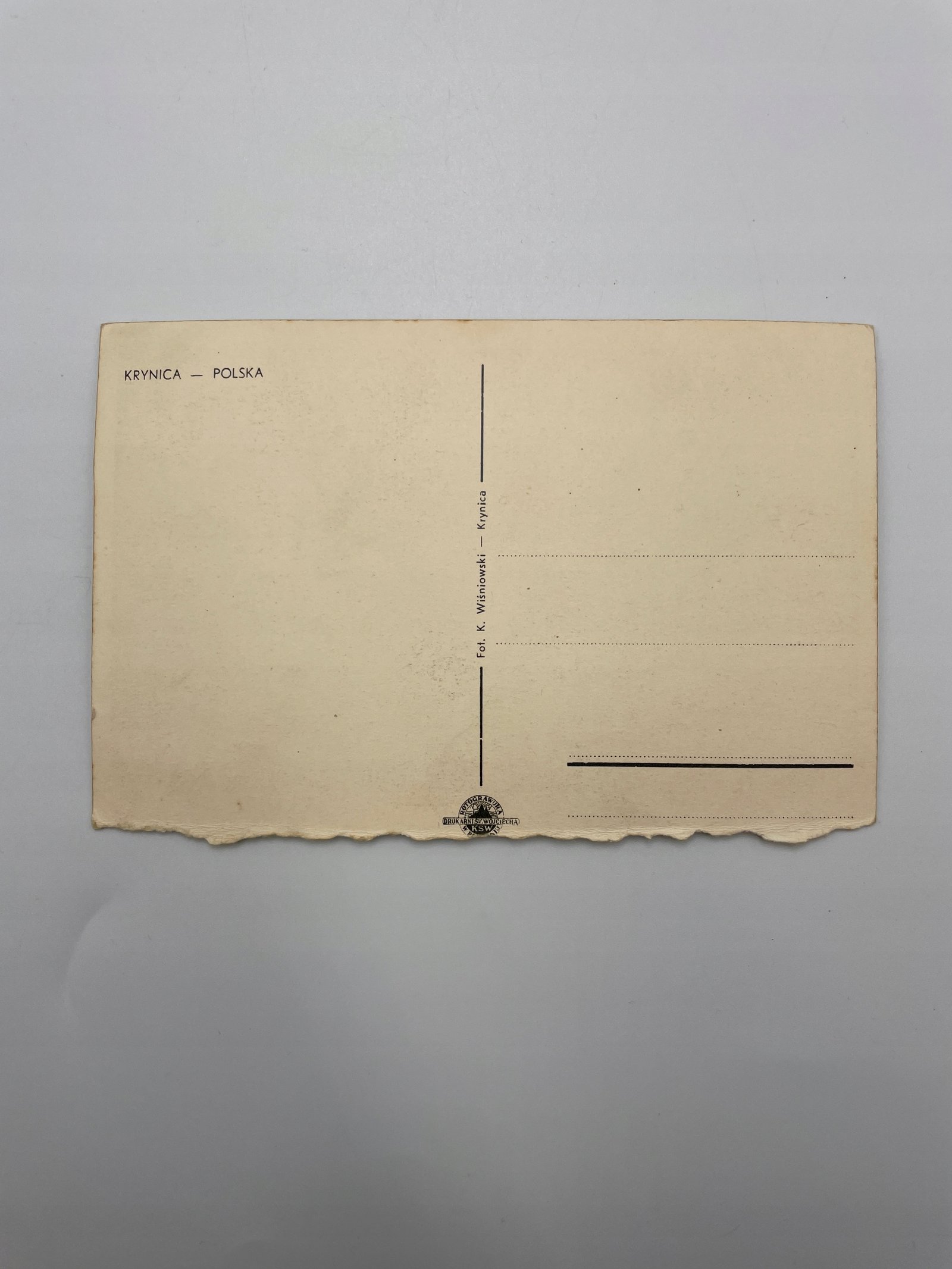 - Oryginalna pocztówka z widokiem willi otoczonej drzewami w Krynicy-Zdroju. Ujęcie w stylu modernistycznym, charakterystyczne dla lat 30.–50. XX wieku. Na odwrocie nadruk wydawcy: K. Wiśniewski – Krynica.