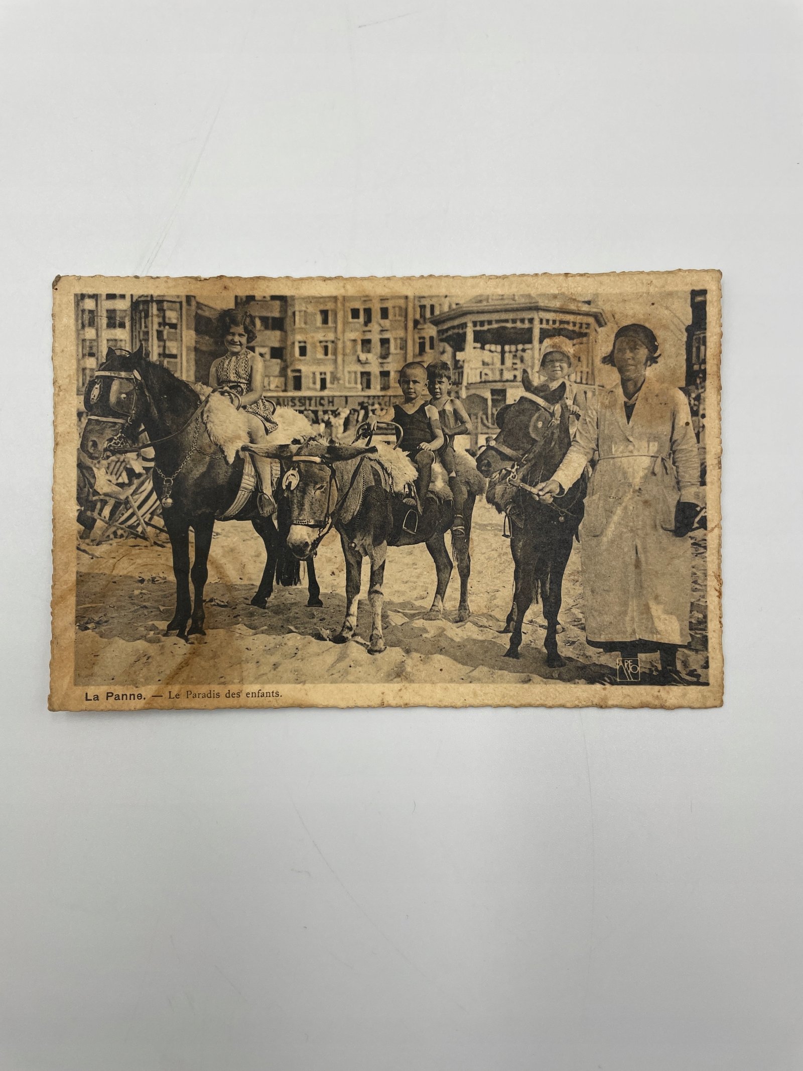Stara pocztówka fotograficzna przedstawiająca scenę z plaży w La Panne (Belgia) z dziećmi jadącymi na koniach i kucykach.