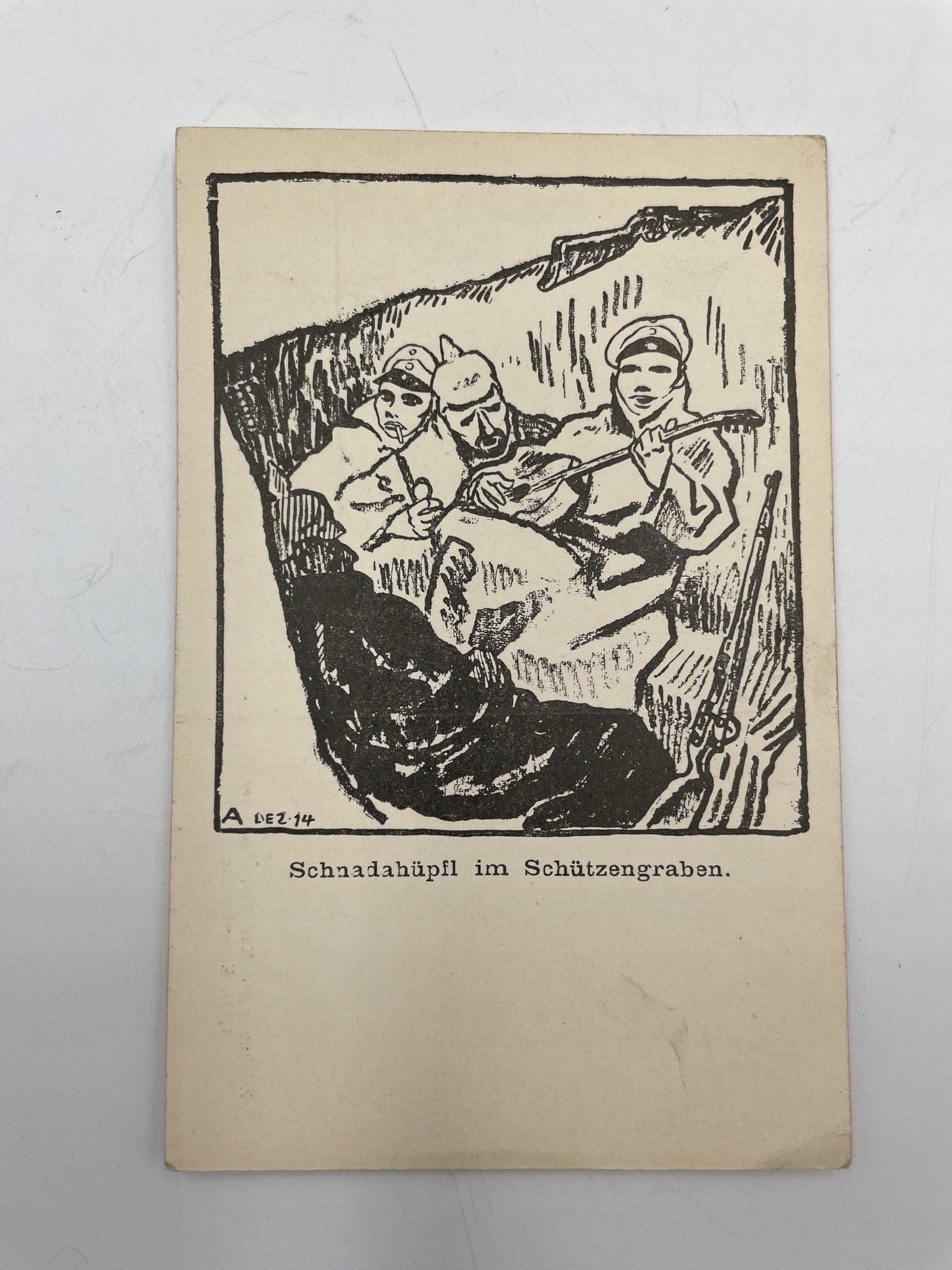 Stara pocztówka niemiecka „Schnadahüpfl w okopach”
