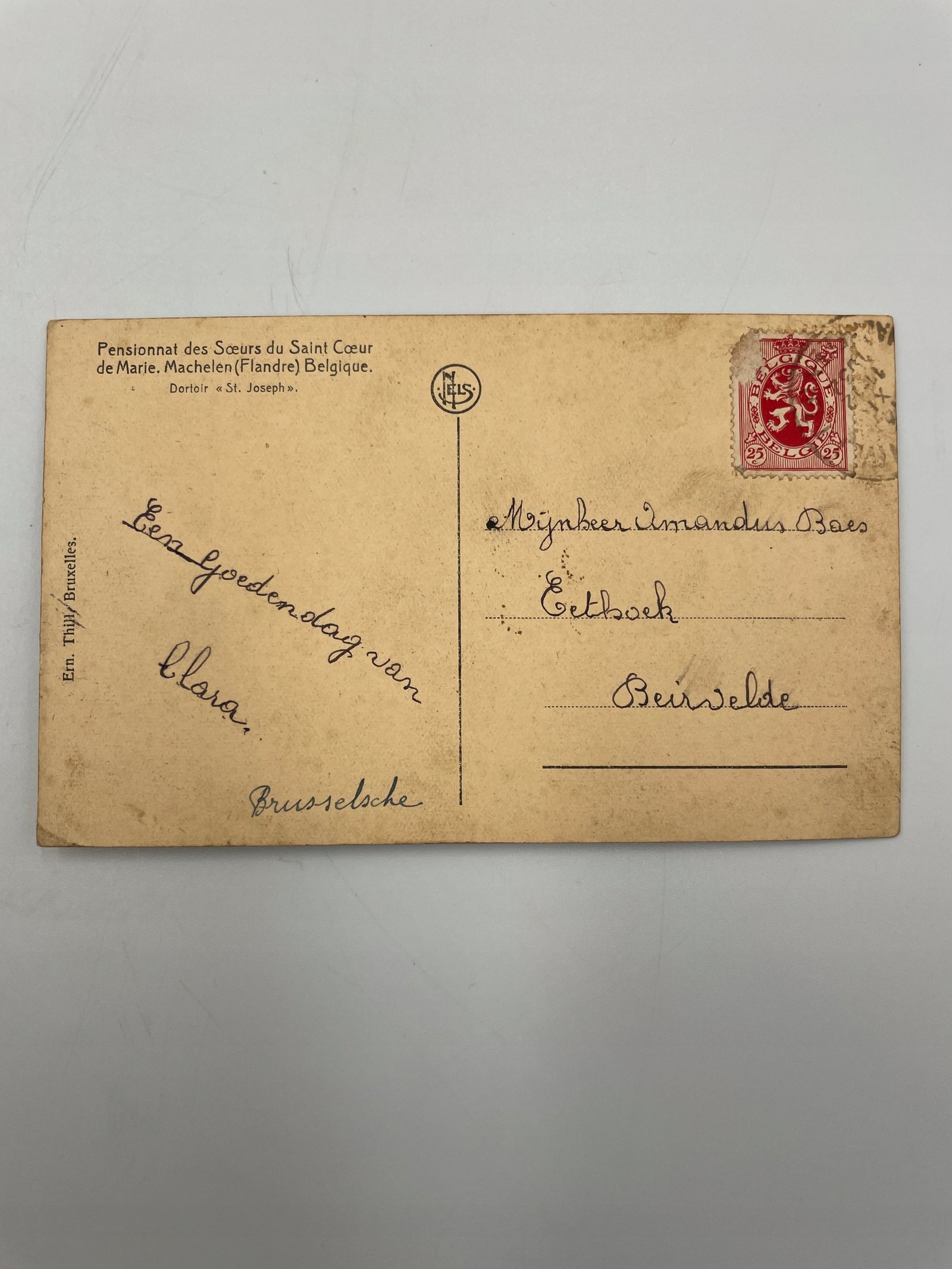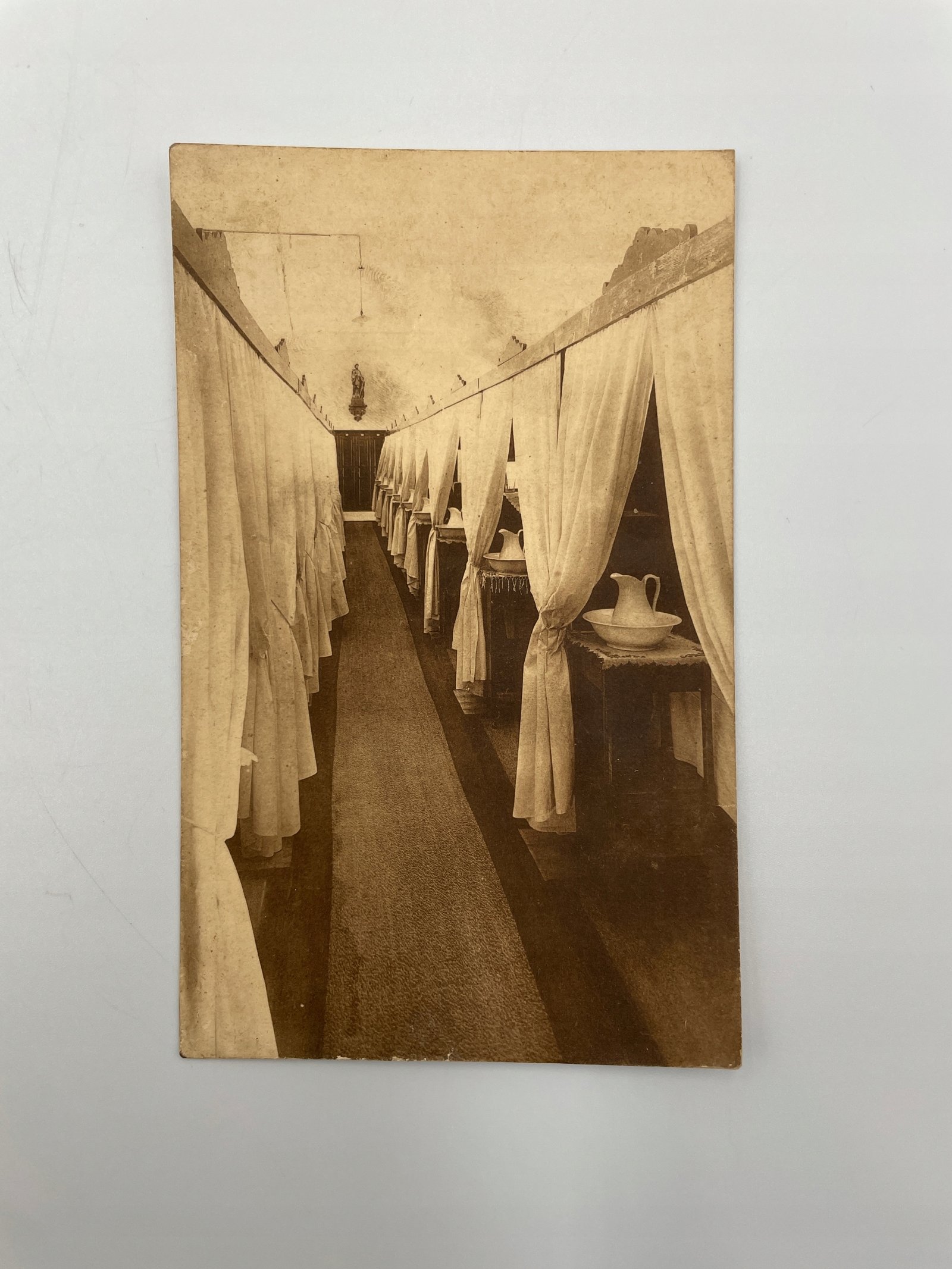 Oryginalna pocztówka z lat 30. XX wieku przedstawiająca dormitorium „St. Joseph” w pensjonacie prowadzonym przez zakonnice w Machlenen (Flandria, Belgia)
