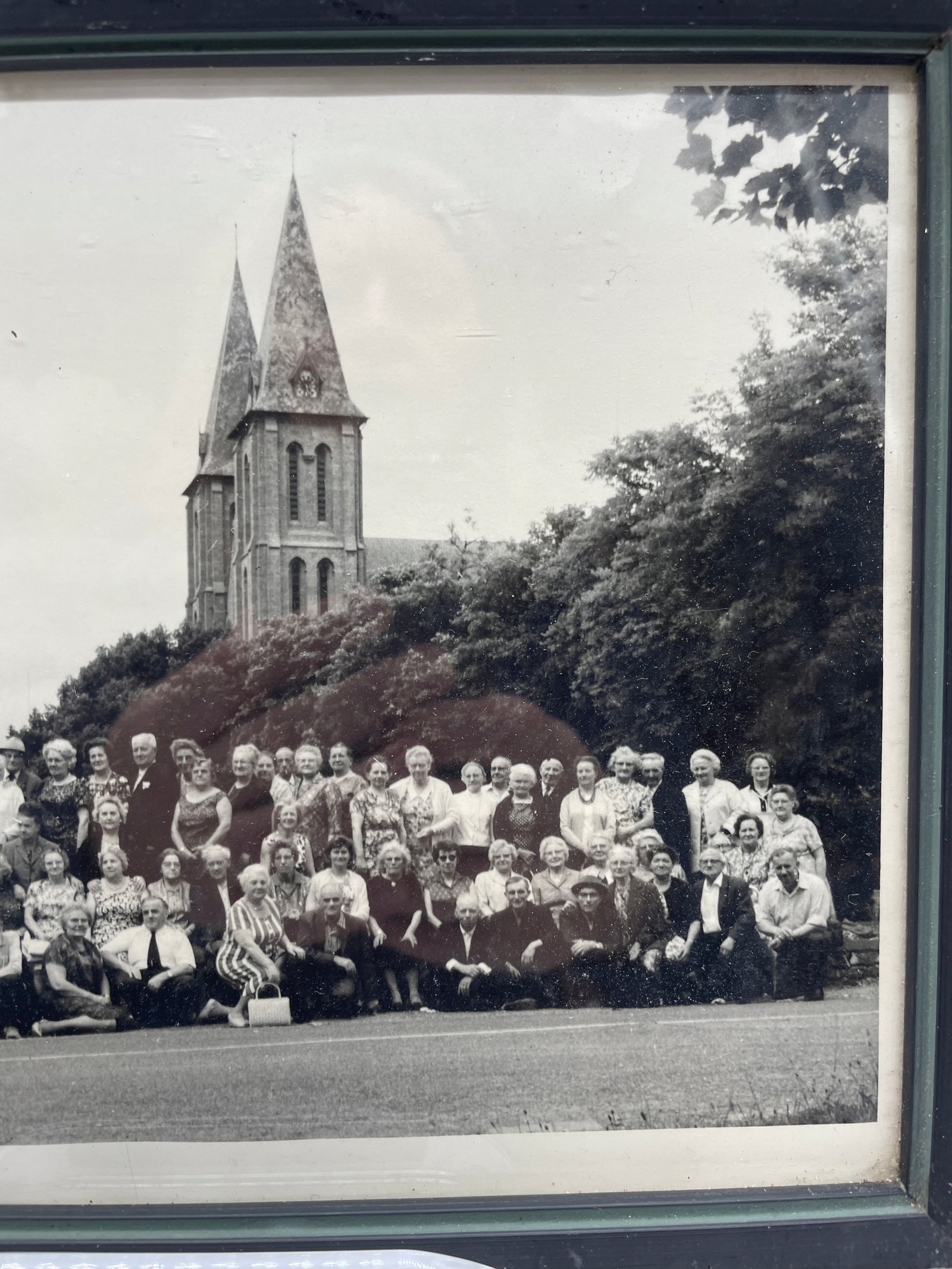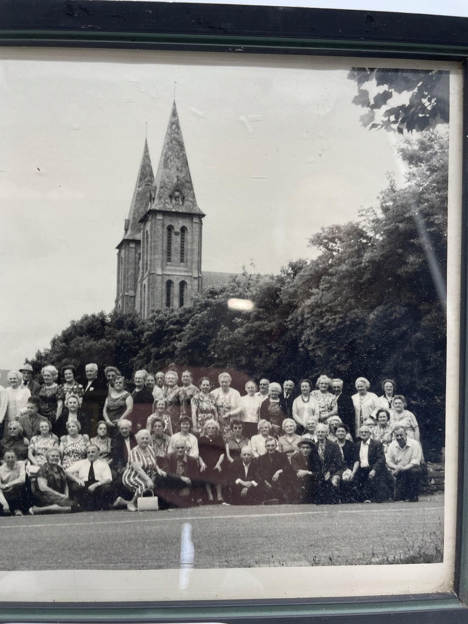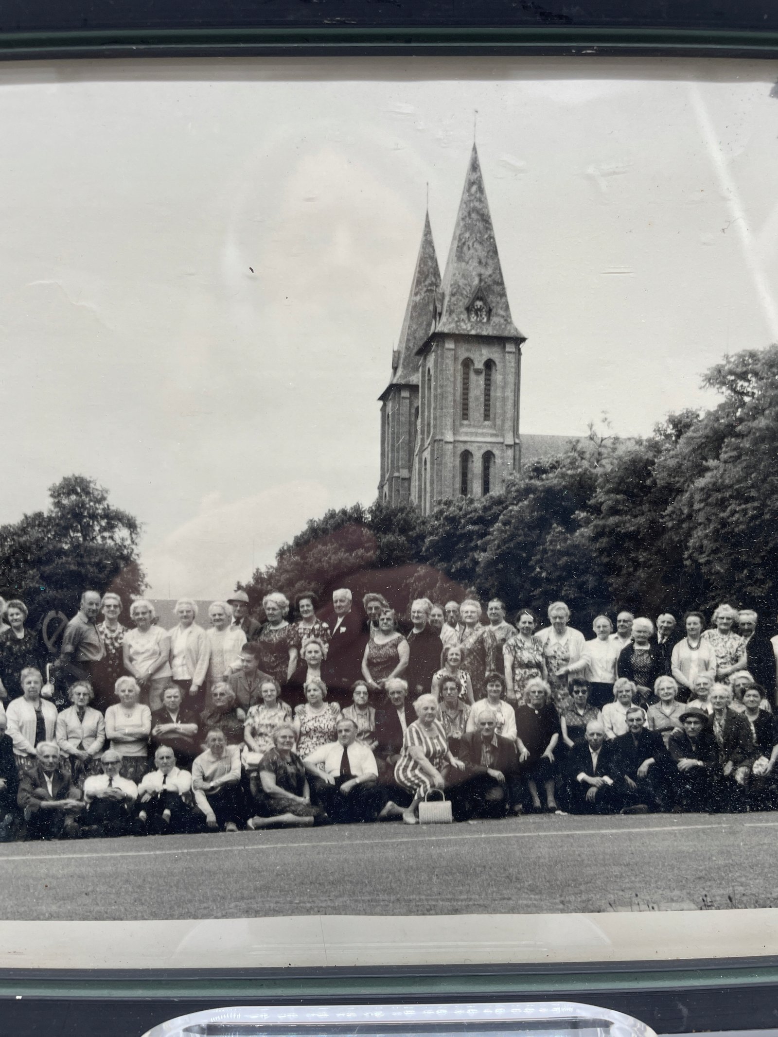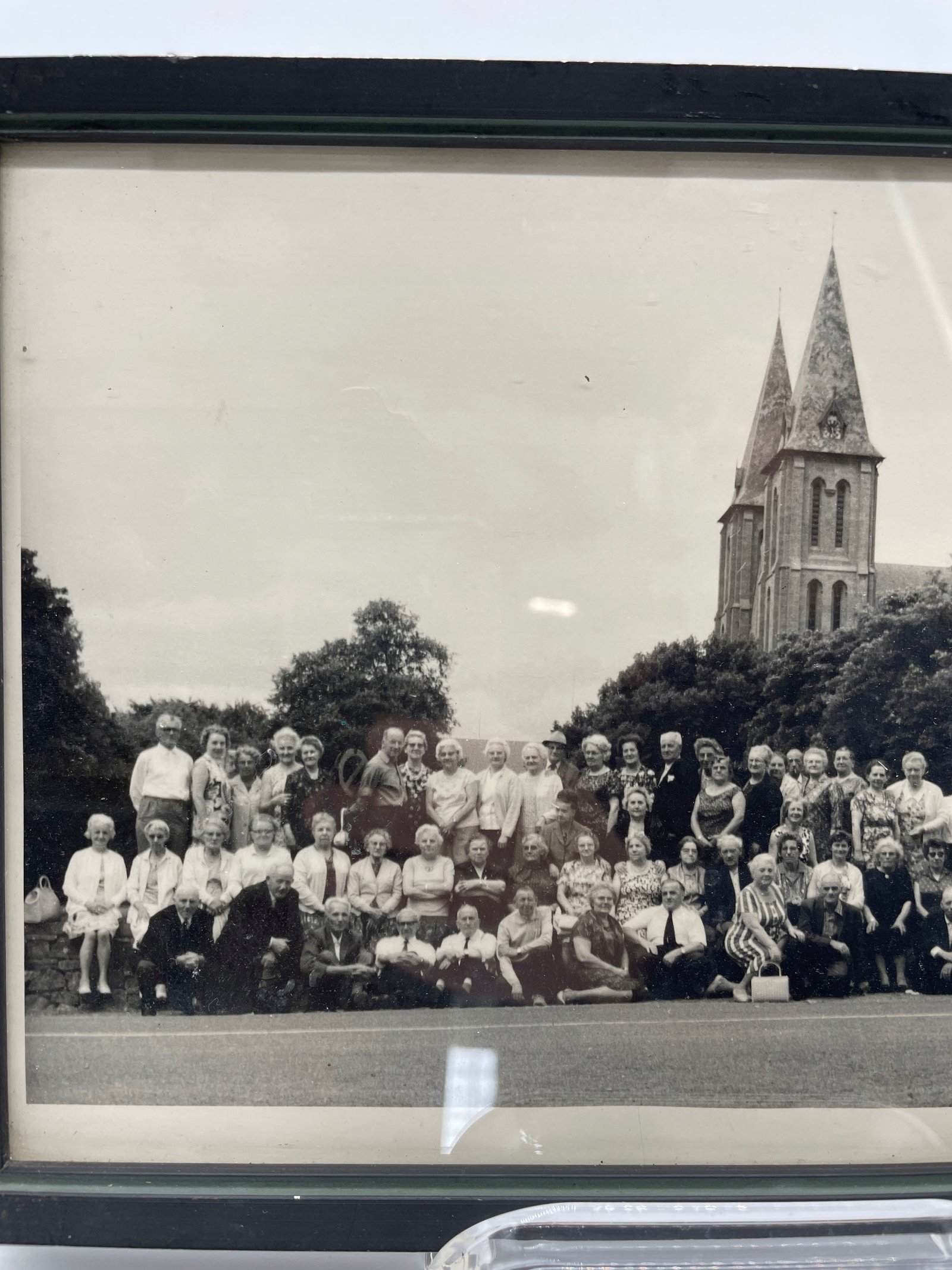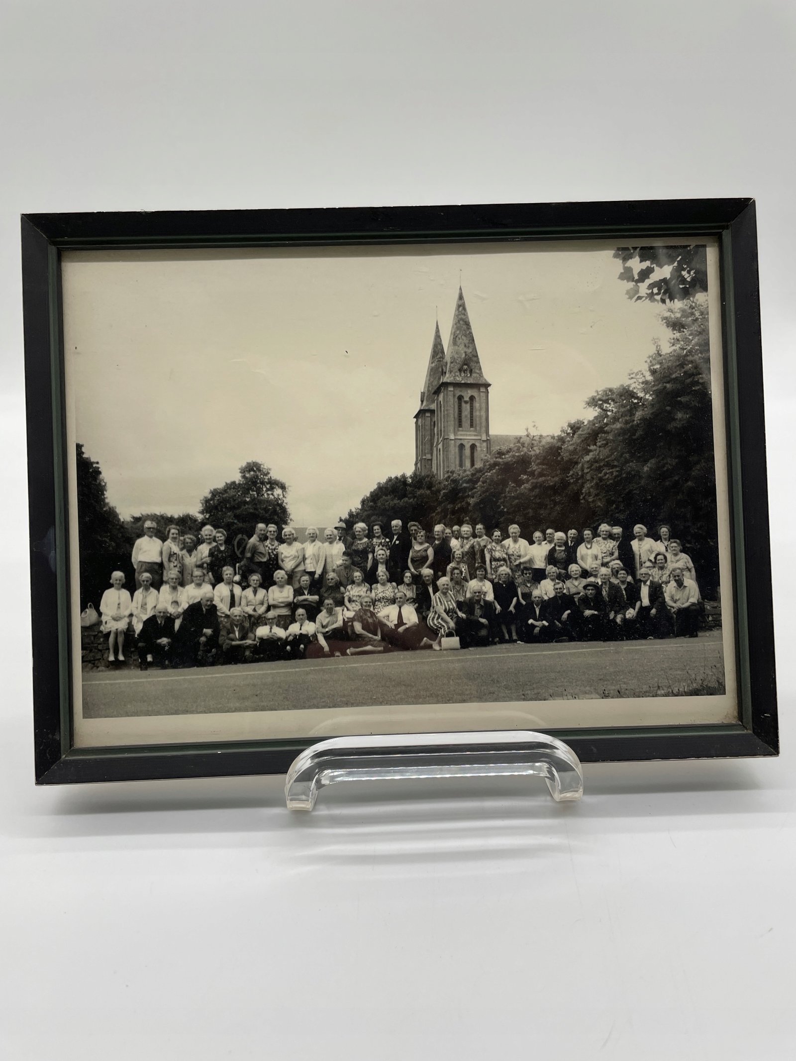 Stare zdjecie grupa ludzi na tle kosciola w ramie 25×19 cm