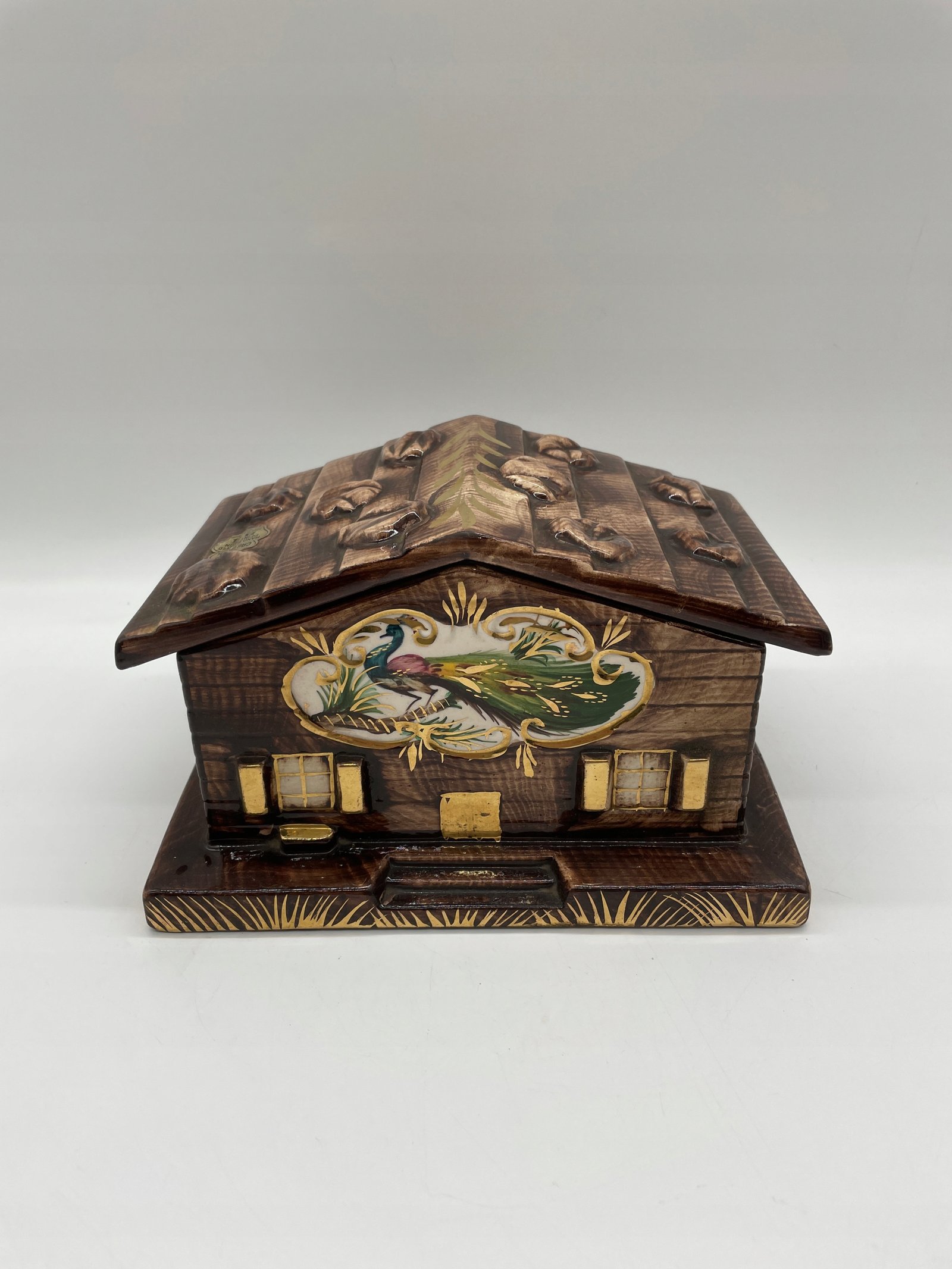Ceramiczna szkatułka w kształcie domku Belgia Castel Or z malowidłem pawia