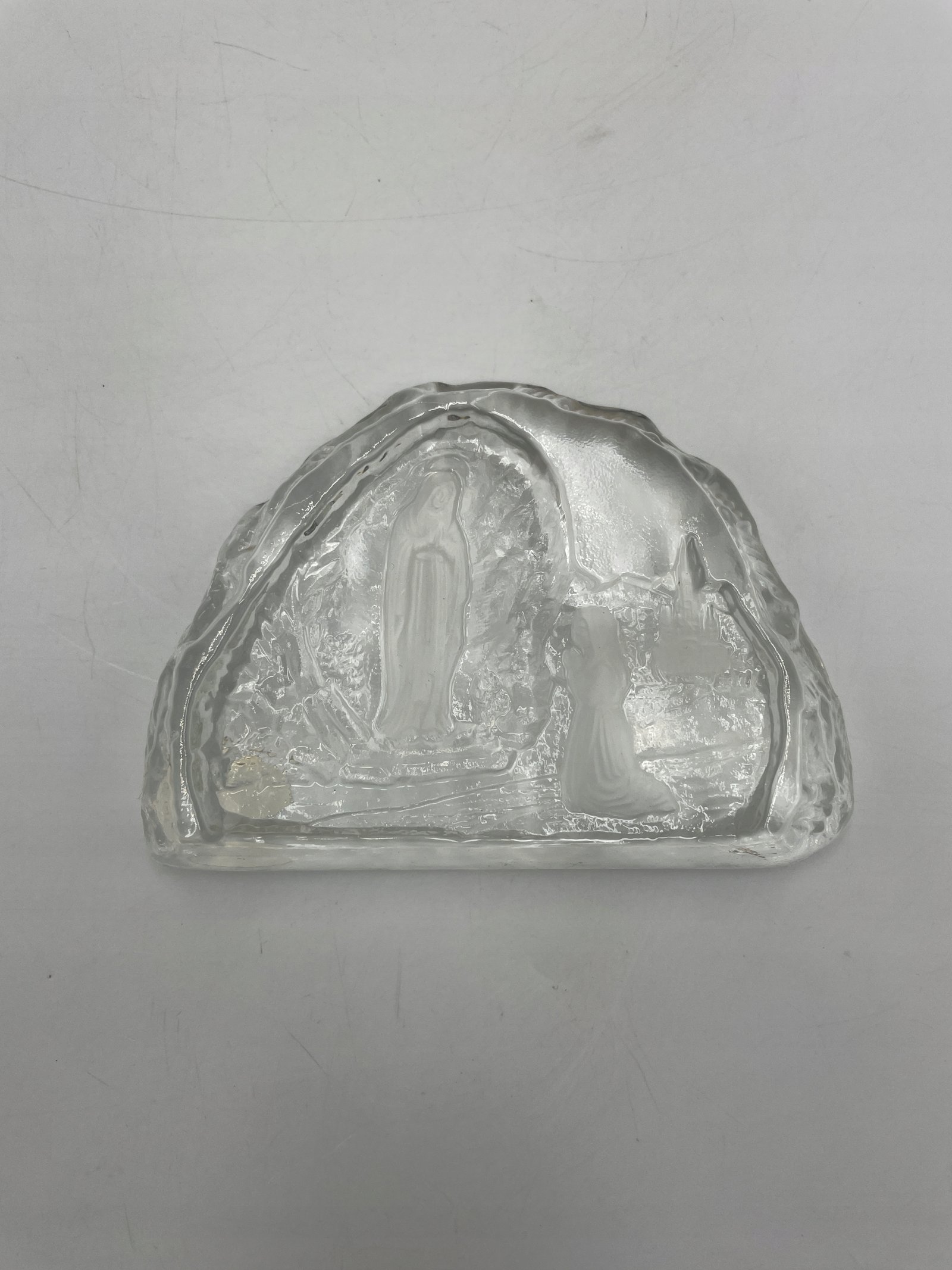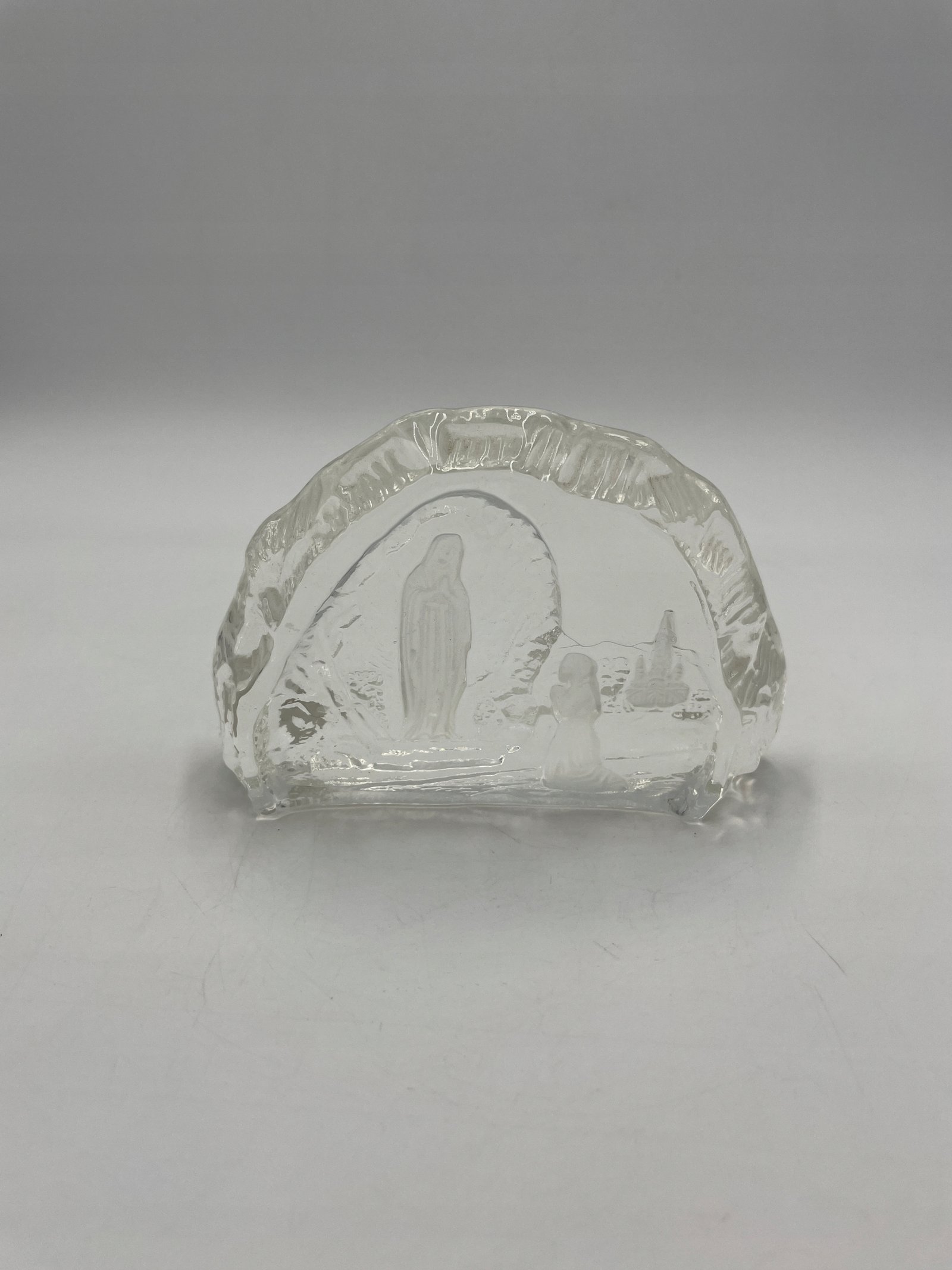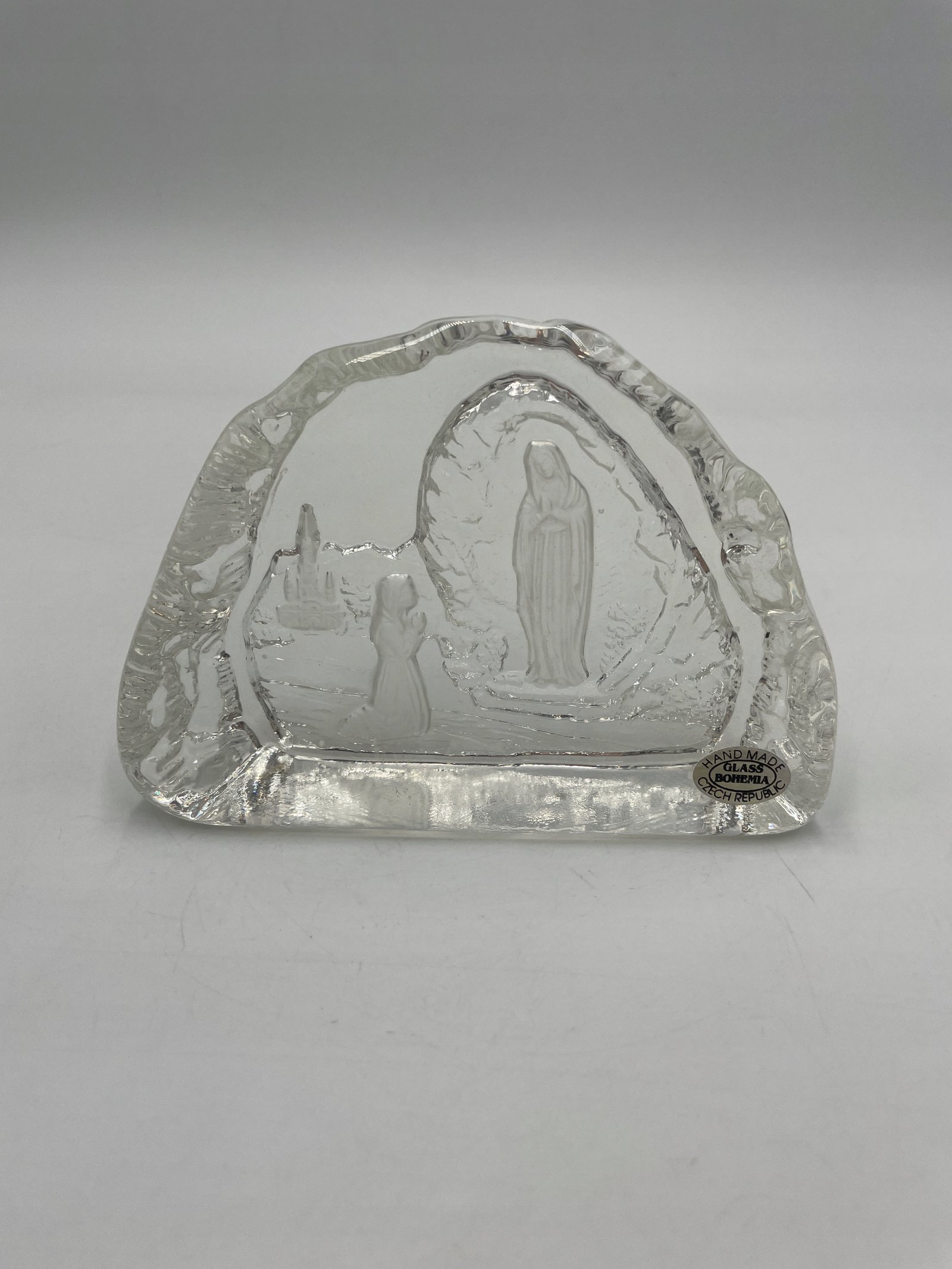 Ręcznie wykonana szklana figurka od czeskiego producenta „Bohemia Glass”, wykonana z przezroczystego szkła kryształowego. Przedstawia religijną scenę objawienia Matki Boskiej w Lourdes, ukazanej przed modlącą się postacią świętej Bernadetty. Szczegóły wykonane są precyzyjnie i starannie, z efektem szkła matowego i przezroczystego, co tworzy kontrast i głębię obrazu. Figurka ma zaokrąglony, stabilny kształt z reliefowymi krawędziami przypominającymi naturalną grotę.