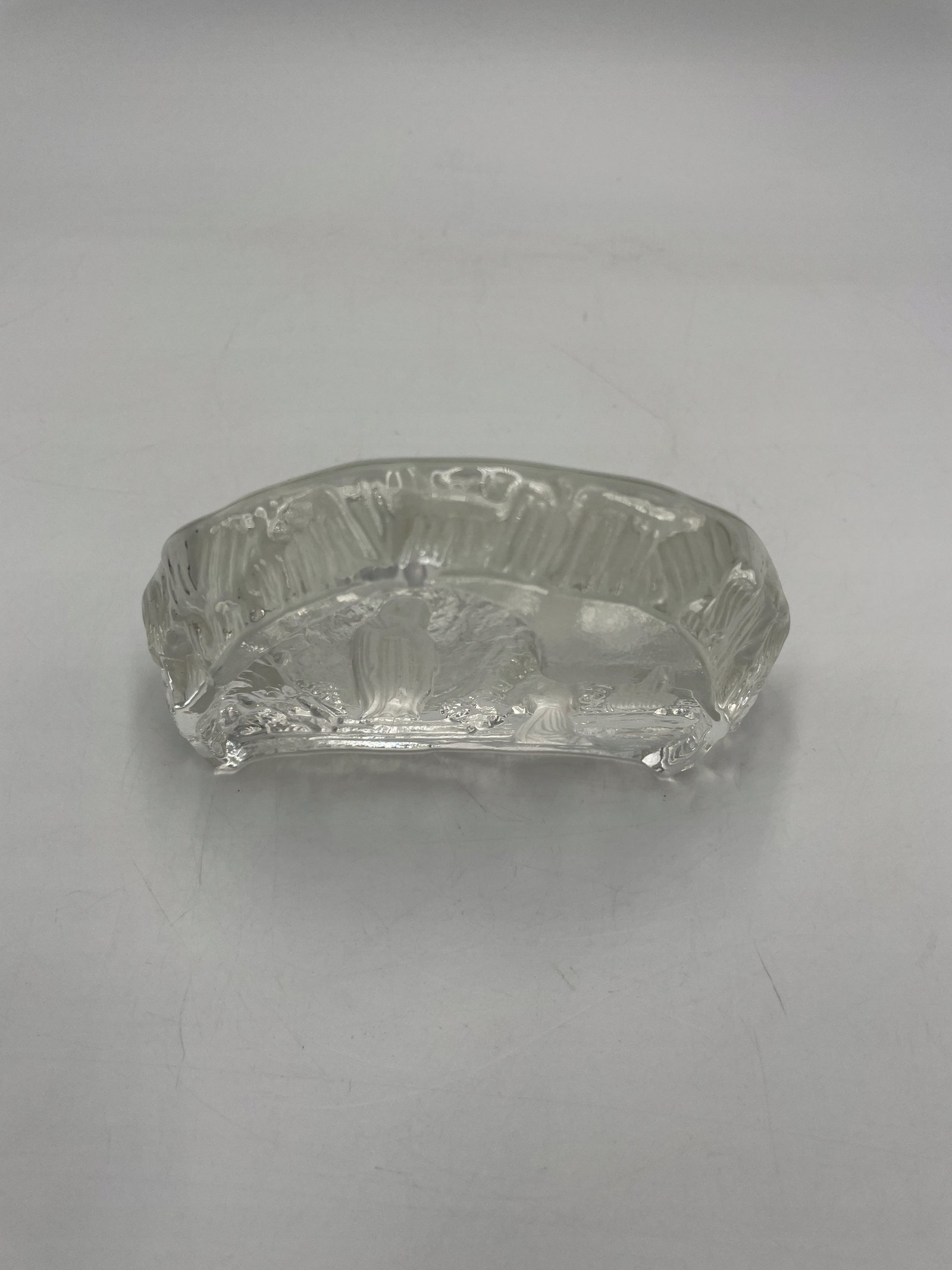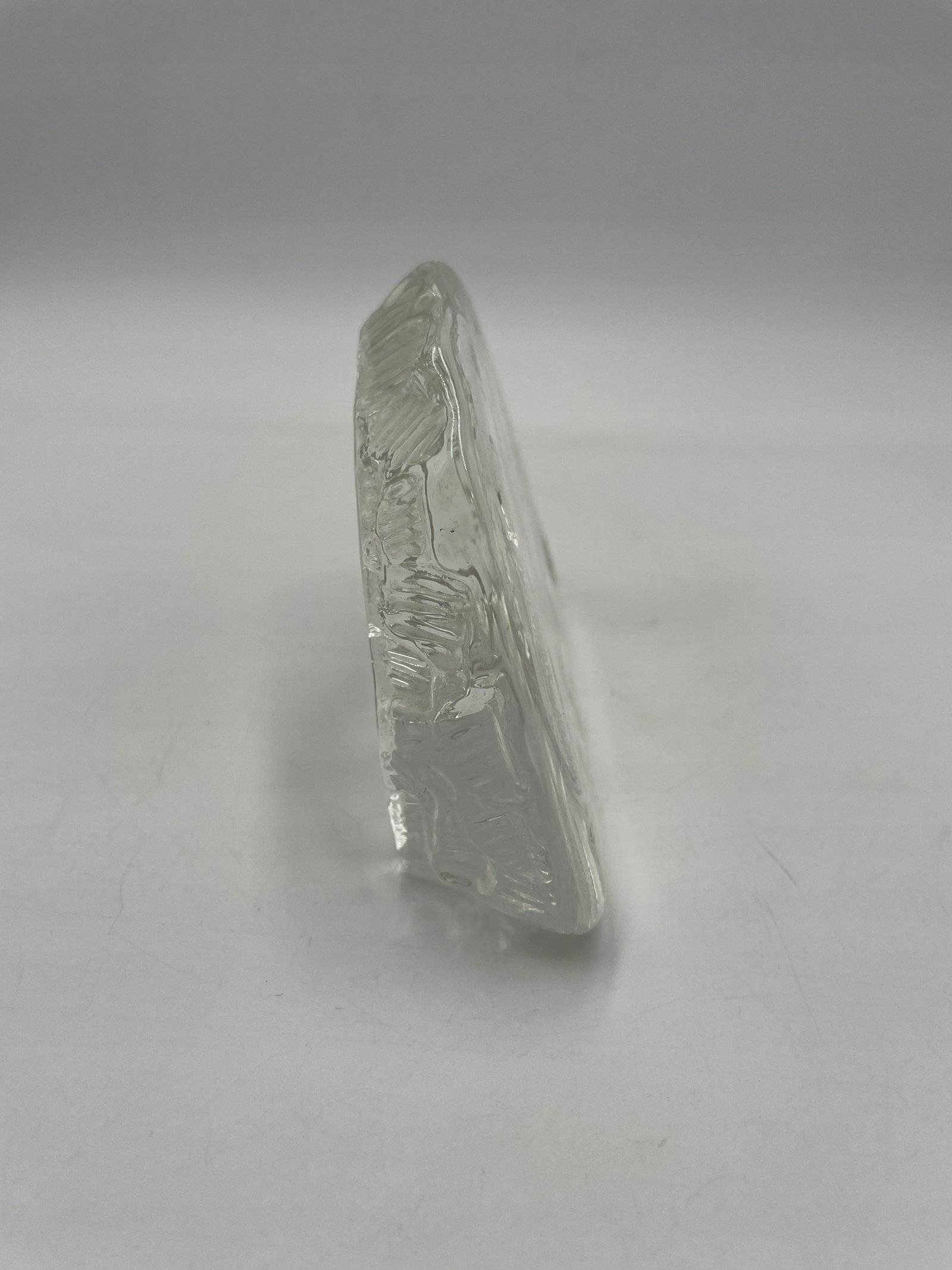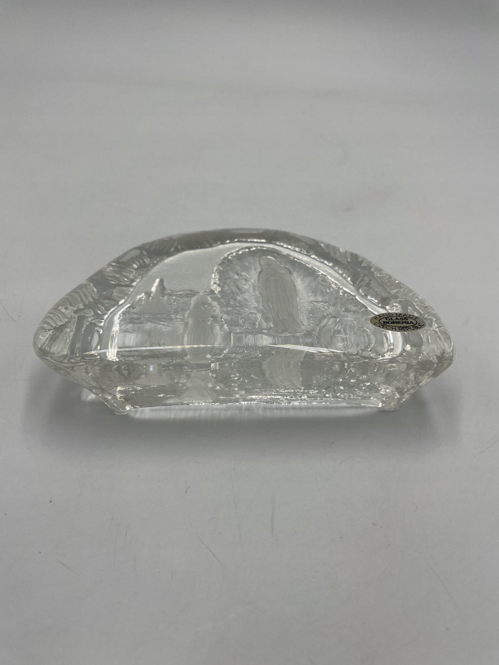 Ręcznie wykonana szklana figurka od czeskiego producenta „Bohemia Glass”, wykonana z przezroczystego szkła kryształowego. Przedstawia religijną scenę objawienia Matki Boskiej w Lourdes, ukazanej przed modlącą się postacią świętej Bernadetty. Szczegóły wykonane są precyzyjnie i starannie, z efektem szkła matowego i przezroczystego, co tworzy kontrast i głębię obrazu. Figurka ma zaokrąglony, stabilny kształt z reliefowymi krawędziami przypominającymi naturalną grotę.